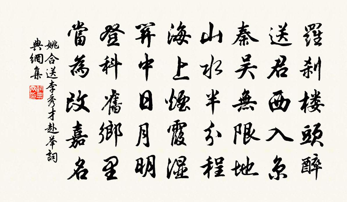詩詞名句歷史字典書法欣賞書法字典國語詞典說文解字康熙字典古漢語字典標 題 作 者 詩 句 送李秀才赴舉作者:姚合 朝代:唐代送李秀才赴舉原文羅剎樓頭醉,送君西入京。秦吳無限地,山水半分程。海上煙霞濕,關中日月明。登科舊鄉里,當為改嘉名。詩詞問答問:送李秀才赴舉的作者是誰?答:姚合問:送李秀才赴舉寫於哪個朝代?答:唐代問:送李秀才赴舉是什麼體裁?答:五律姚合送李秀才赴舉書法欣賞送李秀才赴舉書法作品注釋全唐詩:卷496-77詩詞推薦寄睦州朱少卿張伯玉〔宋代〕何幸鄉枌托使麾,憶曾淮澨見風儀。泉分龍岫成新釀,廟鎖瓊蕤換舊枝。二水清涵潭月夜,千峰晴卷雪雲時。向來送曹守司直二首劉克莊〔宋代〕莫作封君看,慈祥若父兄。化教虞芮遜,和了觸蠻爭。列戟猶森衛,曹裝忽趣行。要知莆俗厚,冠蓋送傾城。道間偶成周弼〔宋代〕彎彎田角路周遭,摘盡柔桑露淺蒿。無限寂寥門半掩,一車偏健夕陽繰。狐泉店前作白居易〔唐代〕野狐泉上柳花飛,逐水東流便不歸。花水悠悠兩無意,因風吹落偶相依。久病小愈,雨中端午試筆四首楊萬里〔宋代〕愛與陳玄酷作綠,餘波染指黑爛班。呼童汲水無來底,自掬垂檐一滴慳。題伯時畫松下淵明黃庭堅〔宋代〕南渡誠草草,長沙慰艱難。終風霾八表,半夜失前山。遠公香火社,遺民文字禪。雖非老翁事,幽尚亦可觀。松風周伯神喜神贊白玉蟾〔宋代〕方丈老仙客,寸心水一滴。雙臉紅硃砂,兩眼點黑漆。白須撫掌笑呵呵,白鶴一去無人識。題雲岫半閒堂用李涉韻趙必象〔宋代〕一塢白雲茅數間,歸與釣水采於山。寄聲靈徹休相笑,未必僧閒似我閒。寄贈夢英大師陶谷〔宋代〕是個碑文念得全,聰明靈性自天然。離吳別楚三千里,入洛游梁二十年。負藝已聞喧世界,高眠長見臥雲煙。相逢上元夜送沈伯時赴南康山長孫銳〔宋代〕十載從游吾道南,山齋苜蓿澹於甘。飛魚想得三台兆,待雪空餘□丈函。席冷幾番馴白鹿,羅傳此夜賦黃柑。太平古代文論選段佚名〔〕 《毛詩序》選段 詩者,志之所之也。在心為志,發言為詩。情動於中而形於言,言之不足故嗟嘆之,嗟嘆長思仙 贈零口權先生馬鈺〔元代〕出家兒。處無為。至死如同初出時。何愁道不知。內慈悲。外憨痴。絕慮忘機無執迷。刀圭有分攜。簡高澹軒姜竹野〔宋代〕西風籬下菊班班,想得吟肩正聳山。急遣曲生陪杖履,要傳好句出人間。慶長叔招飲一桮,未釂,雪聲璀然。即席走筆楊萬里〔宋代〕晚飲西鄰大阮家,天風吹雪入檐牙。呼僮淨掃青苔地,莫遣纖塵涴玉花。過小妓英英墓楊虞卿〔唐代〕蕭晨騎馬出皇都,聞說埋冤在路隅。別我已為泉下土,思君猶似掌中珠。四弦品柱聲初絕,三尺孤墳草已枯。蘭質到岩豅寺勸農魏杞〔宋代〕五事忽來此,今朝天氣新。溪山渾是句,樽酒可無人。幽鳥空驚夢,殘花不當春。飄然又歸去,明月滿衣巾。甘州子顧夐〔唐代〕一爐龍麝錦帷傍,屏掩映,燭熒煌。禁樓刁斗喜初長,羅薦繡鴛鴦。山琴上,私語口脂香。每逢清夜與良晨,多悵題范寬臨流獨坐圖何權〔宋代〕茅堂結構背江乾,日日愛看江上山。箕踞盤陀吟未穩,不知身在畫圖間。出關後寄賈島周賀〔唐代〕故國知何處,西風已度關。歸人值落葉,遠路入寒山。多難喜相識,久貧寧自閒。唯將往來信,遙慰別離顏。過芙蓉嶺對鏡嶺羊斗嶺新嶺塔嶺賦短歌五首方回〔宋代〕平生所聞芙蓉嶺,上如攀天下入井。老乃來游殊不然,褰裳頃刻升絕頂。南逾大庾鷓鴣啼,北度居庸朔風緊。客行名句推薦願春暫留,春歸如過翼。周邦彥《六醜·落花》 富貴本無根,盡從勤里得。馮夢龍《醒世恆言·卷三十五》 心似雙絲網,中有千千結。張先《千秋歲·數聲鶗鴂》 賢能不待次而舉,罷不能不待須而廢。荀子《荀子·王制》 三載重陽菊,開時不在家。文森《九日》 君子耳不聽淫聲,目不視邪色,口不出惡言荀子《荀子·樂論》 望斷金馬門,勞歌采樵路。孟浩然《田園作》 歲月騖過,山陵浸遠范曄《後漢書·列傳·光武十王列傳》 燕雀安知鴻鵠之志。司馬遷《史記·陳涉世家》 海上眾鳥不敢飛,中有鯉魚長且肥。岑參《熱海行送崔侍御還京》