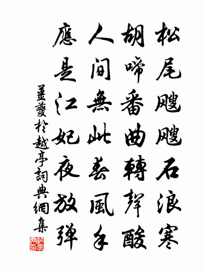 詩詞名句歷史字典書法欣賞書法字典國語詞典說文解字康熙字典古漢語字典標 題 作 者 詩 句 于越亭作者:姜夔 朝代:宋代于越亭原文松尾颼颼石浪寒,胡啼番曲轉聲酸。人間無此春風手,應是江妃夜放彈。詩詞問答問:于越亭的作者是誰?答:姜夔問:于越亭寫於哪個朝代?答:宋代問:姜夔的名句有哪些?答:姜夔名句大全姜夔于越亭書法欣賞于越亭書法作品詩詞推薦金山行(潤州金山寺,寺在江心)竇庠〔唐代〕西江中氵霝波四截,湧出一峰青堞土臬。外如削成中缺裂,陽氣發生陰氣結。是時炎天五六月,上有火雲下冰雪。訴衷情(雨中會飲賞梅,燒燭花杪)趙彥端〔宋代〕洗妝僛舞傍清尊。霏雨淡黃昏。殷勤與花為地,燒燭助微溫。松半嶺,竹當門。意如村。明朝酒醒,桃李漫山,心贈人張氏〔唐代〕雲鬢慵梳睡不忺,倚闌聽燕語虛檐。春愁自是無重數,生怕東風揭繡簾。北禪李處權〔宋代〕老屋不知春,余花紛委雪。中有忘言人,截斷天下舌。我久執情見,終日在談說。一笑示全機,春雲滿城關。九日寄和父弟趙蕃〔宋代〕走馬憶登江上台,聞知興廢使人哀。遙憐冷澹黃花節,遠對飄零白雁來。念爾不堪懷為惡,思余應是首頻回。詩成江行黎廷瑞〔宋代〕卷縴崖形斷,開帆浦意孤。長天低去鳥,落日蘸平湖。渺渺千年夢,悠悠萬化途。倚篷成晤嘆,漁唱在菰蒲。相見歡·微雲一抹遙峰納蘭性德〔清代〕微雲一抹遙峰,冷溶溶,恰與個人清曉畫眉同。[1]紅蠟淚,青綾被,水沉濃,[2]卻與黃茅野店聽西風。古劍行韋應物〔唐代〕千年土中兩刃鐵,土蝕不入金星滅。沉沉青脊鱗甲滿,蛟龍無足蛇尾斷,忽欲飛動中有靈。豪士得之敵國寶,仇家祝鵲王建〔唐代〕神鵲神鵲好言語,行人早回多利賂。我今庭中栽好樹,與汝作巢當報汝。滿庭芳秦觀〔宋代〕曉色雲開,春隨人意,驟雨才過還晴。古台芳榭,飛燕蹴紅英。舞困榆錢自落,鞦韆外、綠水橋平。東風裡,朱門富民犯米四十字以喻之朱南傑〔宋代〕彼此有人心,人心即訟庭。初無深利害,倒自費調亭。私意生荊棘,公家有典刑。落便宜是益,座右可刊銘。二月四日游大雲寺分韻得三字佛龕多題名韋獨李薰〔宋代〕野寺依絕壁,化身滿諸龕。後前莽難測,千億紛相參。妙斬謝斤斧,高樓軼煙嵐。旁行栗危棧,俯{左日右敢}驚懷揚通州文天祥〔宋代〕范叔西來變姓名,綈袍曾感故人情。而今未識春風面,傾蓋江湖話一生。書石牛溪旁大石上黃庭堅〔宋代〕鬱郁窈窈天官宅,諸峰排霄帝不隔。六時謁天開關鑰,我身金華牧羊客。羊眠野草我世閒,高真眾靈思我還。石盆書懷二絕,再送文季高,兼呈新帥閻才元侍郎范成大〔宋代〕劍關雲棧守非難,函谷泥封久未刊。今日漢中誰國士,莫教春草上齋壇。和王安之小園五題邵雍〔宋代〕小園新葺不離家,高就崗頭低就窳。洛邑地疑偏得勝,天津人至又非賒。宜將閬苑同時語,莫共桃源一道夸。聞說觀田中鴝鵒啄粟,因悟象耕鳥耘之說,戲題二楊萬里〔宋代〕粟黃蕎白未全秋,誰報烏衣早作偷。只在林梢築倉廩,便知去處若為搜。醉吟二首白玉蟾〔宋代〕松風吹我飛,手搦空中月。笑指蓬萊山,可補銀河缺。迓王書史六邑勸課回四絕楊公遠〔宋代〕杜鵑聲里莫春天,桑柘村村綠似煙。分趼稱絲將有日,吳蠶今已起三眠。病癒二首蘇轍〔宋代〕病退日身輕,身輕心轉清。山空流水上,海靜寸燈明。朝市誰留住,林泉自不得。筠溪慚丐士,流蕩過平生。名句推薦教人無處寄相思,落花芳草過前期,沒人知。孫光憲《虞美人·好風微揭簾旌起》 其旨遠,其辭文,其言曲而中,其事肆而隱。佚名《易傳·繫辭傳下·第六章》 飛來山上千尋塔,聞說雞鳴見日升。王安石《登飛來峰》 捲地風來忽吹散,望湖樓下水如天。蘇軾《六月二十七日望湖樓醉書》 子規啼徹四更時,起視蠶稠怕葉稀。謝枋得《蠶婦吟》 秋色漸將晚,霜信報黃花。葉夢得《水調歌頭·秋色漸將晚》 死者不可再生,用法務在寬簡。吳兢《貞觀政要·卷八·論刑法》 烹羊宰牛且為樂,會須一飲三百杯。李白《將進酒》 一曲危弦斷客腸。津橋捩柂轉牙檣。嚴仁《鷓鴣天·惜別》 辛勤三十日,母瘦雛漸肥。白居易《燕詩示劉叟》