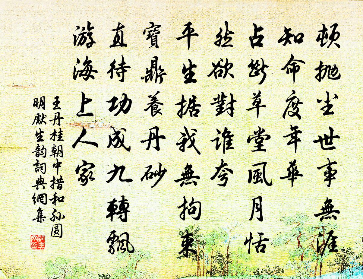 詩詞名句歷史字典書法欣賞書法字典國語詞典說文解字康熙字典古漢語字典標 題 作 者 詩 句 朝中措 和孫圓明先生韻作者:王丹桂 朝代:元代朝中措 和孫圓明先生韻原文頓拋塵世事,無涯知命度年華。占斷草堂風月,恬然欲對誰夸。平生據我無拘束,寶鼎養丹砂。直待功成九轉,飄遊海上人家。詩詞問答問:朝中措 和孫圓明先生韻的作者是誰?答:王丹桂問:朝中措 和孫圓明先生韻寫於哪個朝代?答:元代問:朝中措 和孫圓明先生韻是什麼體裁?答:詞王丹桂朝中措 和孫圓明先生韻書法欣賞朝中措 和孫圓明先生韻書法作品詩詞推薦勉懷楊時〔宋代〕紛紛於我未忘情,疏懶多應舍怨憎。便好世間師柳惠,不須岩下問孫登。次韻答陳仲思鄧深〔宋代〕彤雲凍合晚來風,百里溪山雪色同。李棨那能說詩興,嗣宗端復嘆途窮。行部決獄,宿新隆寺觀鄒至完題壁楊萬里〔宋代〕道鄉千古一清風,雪壁銀鉤墨尚濃。若愛殿前蒼玉佩,斷無身後碧紗籠。送劉改這二首王居安〔宋代〕劉子堂堂七尺軀,高談世事奮髯須。觀渠論到前賢處,據我看來近世無。出語令人驚辟易,處窮無鬼敢揶揄。徜徉過瑞龍觀道士錢起〔唐代〕不知誰氏子,煉魄家洞天。鶴待成丹日,人尋種杏田。靈山含道氣,物性皆自然。白鹿顧瑞草,驪龍蟠玉泉。得茲陳彥臣連靜女案判詞王剛中〔宋代〕佳人才子兩相宜,置福端由禍所基。永作夫妻諧汝願,不勞鑽穴隙相窺。宿江館朱慶餘〔唐代〕江館迢遙處,知音信漸賒。夜深鄉夢覺,窗下月明斜。起雁看荒草,驚波尚白沙。那堪動鄉思,故國在天涯。賦得春雲處處生駱賓王〔唐代〕千里年光靜,四望春雲生。槧日祥光舉,疏雲瑞葉輕。蓋陰籠迥樹,陣影抱危城。非將吳會遠,飄蕩帝鄉情。重題釣台方岳〔宋代〕落帆曾傍蘆花宿,借得先生月一灘。鷗鳥未忘吾道在,江山肯作故人看。樹昏斷岸潮聲急,雪洗孤台石罅寒。最喜劍池鄭霖〔宋代〕屬鏤堪為後人傷,池溜清泉有恨長。不斬妖邪斬忠直,淡煙荒草鹿麋場。叢台張舜民〔宋代〕荊棘芃芃百尺堆,路人云此是叢台。雨中漳浦明還滅,門外青山去又來。歌嘯且從今日樂,是非誰管後人哀。靚妝城歸憩吳竹修家一詩寫懷陳著〔宋代〕去時桃未蕊,歸見石榴花。白首鐙前酒,青山夢裡家。鵑聲心路梗,蚊毒麵皮麻。勞苦書生事,堪嗟老未涯。滿江紅(次韻徐使君癸亥燈夕)劉克莊〔宋代〕笳鼓春城,處處有、豐年語笑。渾忘卻、金蓮前導,青藜下照。白雪唱來遍寡和,朱顏老去難重少。羨遨頭、四十寄盩厔薛能少府許棠〔唐代〕滿縣唯雲水,何曾似近畿。曉庭猿集慣,寒署吏衙稀。冰色封深澗,樵聲出紫微。時聞迎隱者,依舊著山衣。登胥山贈長老淨曇二首張嵲〔宋代〕白水環村漫漫流,天邊浮綠遠眉修。春晴一試登山屐,愧乏新詩與惠休。詩二首陳舜俞〔宋代〕自古匡廬是勝游,話臣何敢計淹留。城中未有看山處,客館僧坊謾舉頭。送人游並汾韋莊〔唐代〕風雨蕭蕭欲暮秋,獨攜孤劍塞垣游。如今虜騎方南牧,莫過陰關第一州。道中寄同舍孫應時〔宋代〕山色忽相送,江流不作聲。別懷初酒醒,病骨更寒侵。一笑已昨夢,百年明此心。故人應念我,數肯寄嘉音。分龍吟舒岳祥〔宋代〕五月二十分龍雨,今日霏微如下土。前日何日何霖霪,正是分龍乃如許。有餘不足相乘除,天道人事元非疏。何龍野雉詞楊維楨〔元代〕野雉異兮家雞,雉將雛兮棲棲。嫁劉季兮逐季飛,不逐季兮季狐疑。羽翼成兮兩口苦無違。名句推薦楚水巴山江雨多,巴人能唱本鄉歌。劉禹錫《竹枝詞二首·其二》 都緣自有離恨,故畫作遠山長。歐陽修《訴衷情·眉意》 忍淚不能歌,試托哀弦語晏幾道《生查子·墜雨已辭雲》 午夢初回,捲簾盡放春愁去。周晉《點絳唇·訪牟存叟南漪釣隱》 荒城臨古渡,落日滿秋山。王維《歸嵩山作》 粉墮百花洲,香殘燕子樓。曹雪芹《唐多令·柳絮》 一切法無我無人無眾生無壽者。鳩摩羅什譯《金剛經·究竟無我》 統豺虎,御邊幅,號令明,軍威肅。宋江《滿江紅·喜遇重陽》 家貧出孝子,國亂顯忠臣!佚名《增廣賢文·下集》 是以動則必陷,為則必辱,是偏傷之患也。荀子《荀子·不苟》