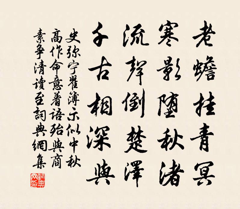 詩詞名句歷史字典書法欣賞書法字典國語詞典說文解字康熙字典古漢語字典標 題 作 者 詩 句 翟簿示似中秋高作命意著語殆與商素爭清讀至作者:史彌寧 朝代:宋代原文老蟾掛青冥。寒影墮秋渚。流聲倒楚澤,千古相深與。詩詞問答問:《翟簿示似中秋高作命意著語殆與商素爭清讀至》的作者是誰?答:史彌寧問:該詩寫於哪個朝代?答:宋代書法欣賞翟簿示似中秋高作命意著語殆與商素爭清讀至書法作品詩文賞析【原題】:翟簿示似中秋高作命意著語殆與商素爭清讀至人與月忘年之句不覺擊節借五言韻賦詩答謝詩詞推薦春溪二首艾性夫〔宋代〕雨香雲嫩散朝暉,細草初肥綠滿溪。無數落花鶯背上,避人帶入柳陰啼。郊廟朝會歌辭建隆乾德朝會樂章二十八首佚名〔宋代〕舜韶更奏,堯酒浮觴。皇情載澤,洪算無疆。基隆郟鄏,德茂陶唐。山巍日煥,地久天長。題金相寺三首蘇堅〔宋代〕隱約開晹谷,坐看雲氣升。地神歸獻秀,一色露山稜。宿駱氏亭寄懷崔雍崔袞李商隱〔唐代〕竹塢無塵水檻清,相思迢遞隔重城。秋陰不散霜飛晚,留得枯荷聽雨聲。贈寫神吳子可易士達〔宋代〕不數僧繇只數吳,丹青紀出活形模。問君寫盡人多少,寫得人心一片無。寄懷江西徵岷二律師齊己〔唐代〕亂後江邊寺,堪懷二律師。幾番新弟子,一樣舊威儀。院影連春竹,窗聲接雨池。共緣山水癖,久別共題詩。送前汝州李侍御罷歸宣城許棠〔唐代〕吟詩早得名,戴豸又加榮。下國閒歸去,他人少此情。雲移寒嶠出,燒夾夜江明。重引池塘思,還登謝朓城。針醫釋普濟〔宋代〕藥知性亦病知源,誰管屍靈骨已寒。痛下一針雙眼活,耆婆應未得其傳。追詠崔奉禮小園梅堯臣〔宋代〕前此訪君時,已觀堂宇邃。安知中屏開,自有幽林致。花搴岩桂紅,石擘雲根翠。正當秋風來,不見搖落意。日得蝶戀花·湘水經東安縣東王夫之〔明代〕湘水經東安縣東,有沉香塘,石壁隙插一株,雲是沉水香,澄潭清冷,綠蘿倒影。湘水自分灕水下。曲曲潺湲,千題楊子岩丘葵〔宋代〕抗塵走俗令人憎,因覓桃源作此行。畏日燒空時事惡,飛泉瀉石道心生。青天盡處孤舟渺,好鳥鳴時萬壑清。一老蝶戀花(崇陽縣圃夜飲)王炎〔宋代〕縴手行杯紅玉潤。滿眼花枝,雨過胭脂嫩。新月一眉生淺暈。酒闌無奈添春困。喚起醉魂君不問。憔悴顏容,羞與過冷泉亭顧逢〔宋代〕綠影浮陰玉一淵,吟翁同立石闌邊。池中石與詩中字,知是幾年磨得圓。春集東園賦得萼字王洙〔宋代〕燕退朝事希,鳴騶出雲閣。近游速朋彥,名園接闉郭。幽芳尚閒整,新樾已清漠。歡談一坐傾,遞飲百分涸。我亦篔房暑中寄詩依韻酬答釋文珦〔宋代〕豀翁若冰雪,明淨不受涅。經歲斷知聞,使我心菀結。佳句來清風,足以酒炎熱。山中有奇事,遲向秋深說。雷鳴不雨潘牥〔宋代〕樵子俄從問路回,因言溪谷響如雷。分明雨怕城中去,只隔前峰不過來。龍華山寺寓居十首王之望〔宋代〕海國幽棲地,春風欲暮時。病憂梅雨逼,貧嘆麥秋遲。並日終無愧,逢年會有期。饑寒寧苟免,吾道諱磷緇。阻雨不得歸瀼西甘林杜甫〔唐代〕三伏適已過,驕陽化為霖。欲歸瀼西宅,阻此江浦深。壞舟百版坼,峻岸復萬尋。篙工初一棄,恐泥勞寸心。佇立石竺山二十詠劉克莊〔宋代〕恰召陽翁伯,俄徵謝自然。不知玉樓上,幾個是詩仙。書駿馬圖陳深〔宋代〕王良伯樂骨已朽,曹霸丹青亦希有。開圖欻見神駿姿,對酒高歌雄劍吼。只今騏驥困監車,落日長鳴漫昂首。嗤嗤名句推薦勸君頻入醉鄉來,此是無愁無恨處。晏幾道《玉樓春·雕鞍好為鶯花住》 處事有何定憑,但求此心過得去王永彬《圍爐夜話·第三九則》 知是人家花落盡,菜畦今日蝶來多。高啟《春暮西園》 一葉度春風,芳芳自相接。蕭衍《芳樹》 露葉翻風驚鵲墜。暗落青林紅子。陳師道《清平樂·秋光燭地》 何用慰相思,裁書寄關右。李益《送諸暨王主簿之任》 北風利如劍,布絮不蔽身。白居易《村居苦寒》 勝概日相與,思君心鬱陶。岑參《鞏北秋興寄崔明允》 金陵子弟來相送,欲行不行各盡觴。李白《金陵酒肆留別》 操千曲而後曉聲,觀千劍而後識器。劉勰《文心雕龍·知音》