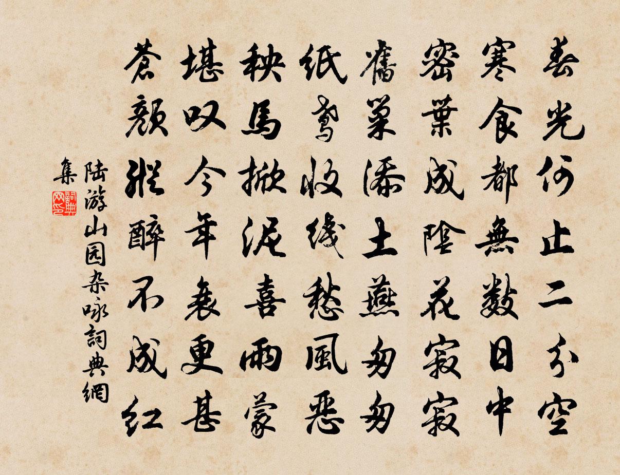 詩詞名句歷史字典書法欣賞書法字典國語詞典說文解字康熙字典古漢語字典標 題 作 者 詩 句 山園雜詠作者:陸游 朝代:宋代山園雜詠原文春光何止二分空,寒食都無數日中。密葉成陰花寂寂,舊巢添土燕匆匆。紙鳶收線愁風惡,秧馬掀泥喜雨蒙。堪嘆今年衰更甚,蒼顏縱醉不成紅。詩詞問答問:山園雜詠的作者是誰?答:陸游問:山園雜詠寫於哪個朝代?答:宋代問:陸游的名句有哪些?答:陸游名句大全陸游山園雜詠書法欣賞山園雜詠書法作品詩詞推薦南鄉子(醉飲)李石〔宋代〕里帽捻吟須。我是蓬萊舊酒徒。除了茅君誰是伴, * 。洞裡仙漿不用沽。弱水渺江湖。醉里笙歌醉里扶。縱飲菊挽國史侍讀李公仁父喻良能〔宋代〕大名垂宇宙,秀氣發岷峨。學比淵雲贍,才方賈馬過。九朝資直筆,二子振賢科。已矣流芳在,千秋保不磨。點絳唇朱敦儒〔宋代〕綠徑朱闌,暖煙晴日春來早。自家亭沼。不問人尋討。攜酒提籃,兒女相隨到。風光好。醉欹紗帽。索共梅花笑。次韻弟茝醉中示弟觀二首自道陳著〔宋代〕六十家婆八十翁,此心無事便融融。肉香韭甲磁盆內,蝶夢梅花紙帳中。自有乾坤無俯仰,誰知否泰是窮通。出門洛陽杜甫〔唐代〕洛陽昔陷沒,胡馬犯潼關。天子初愁思,都人慘別顏。清笳去宮闕,翠蓋出關山。故老仍流涕,龍髯幸再攀。宿雲際寺溫庭筠〔唐代〕白蓋微雲一徑深,東峰弟子遠相尋。蒼苔路熟僧歸寺,紅葉聲乾鹿在林。高閣清香生靜境,夜堂疏磬發禪心。自從次江都宋祁〔宋代〕道險疑無地,岩高欲近天。家收代田粟,官鑄即山錢。雲變陰晴候,林容旦暮煙。落花真有意,時解拂行韉。葆清值雨二首岳珂〔宋代〕松竹鎖靈宅,塵埃了不侵。洞龍隨劍吷,檻鶴識琴心。路指三峰近,山通一徑深。壁間少年字,陳跡不堪尋。游虎丘曾幾〔宋代〕誰能竟日把書看,盪槳扶筇十裡間。未辦深藏豹林谷,不妨時到虎丘山。秋來千頃境絕麗,老矣北窗人極閒。忽見浣溪沙(與魯卿酌別,席上次韻)葉夢得〔宋代〕千古風流詠白萍。二年歌笑擁朱輪。翩翩卻憶上林春。劍履便應陪北闕,衤夸襦那更假西人。玉堂金殿要詞臣。武林書事九首方回〔宋代〕歲在戊午正月五,代宰臣供萬壽詩。鳳凰山下芙蓉閣,龍礎無蹤世不知。清曉洪澤放閘四絕句楊萬里〔宋代〕滿閘浮河是斷冰,等人放閘要前行。劣能開得兩三板,爭作摧瓊裂玉聲。早朝韋元旦〔唐代〕震維芳月季,宸極眾星尊。珮玉朝三陛,鳴珂度九門。挈壺分早漏,伏檻耀初暾。北倚蒼龍闕,西臨紫鳳垣。詞庭瀟湘神(端午競渡棹歌)黃公紹〔宋代〕望湖天,望湖天,綠楊深處鼓鼘鼘。好是年年三二月,湖邊日日看划船。書憤蘇泂〔宋代〕黃葉冷颼颼,臨風搔白頭。江湖無老伴,天地有新愁。橐禁行鴛曉,榆關戰馬秋。平生忠孝意,到死不能休。無夢令馬鈺〔元代〕二鼓孤眠內守。雲綻遍天星宿。日月兩交光,自是寶瓶無漏。無漏。無漏。起陸龍蛇戰鬥。松陳景沂〔宋代〕遠吹疏疏奏竹房,亂撩松友發清狂。雲拖雨陣沿山至,岩溲泉聲走澗長。和我微吟似音律,續他高韻費思量。誰人偈頌九十三首釋梵琮〔宋代〕合眼是舊歲,開眼是新年。新舊交參處,分明在目前。梅花香噴雪,楊柳冷含煙。年頭佛法無多子,一句單提妙不中秋不見月二首李若水〔宋代〕明月自不老,古今同一時。尋常賞心薄,萬里清光施。茲夕反雲翳,庭烏亦長悲。人生得意處,每每乖所期。神仙詩贈晚學李君邢仙老〔宋代〕人稀境盡絕塵埃,野客尋源或到來。怪石結成真洞府,亂山堆就假樓台。久窮至理難期老,獨放真機學未該。得共名句推薦執手相看淚眼,竟無語凝噎。柳永《雨霖鈴·寒蟬淒切》 嶺水爭分路轉迷,桄榔椰葉暗蠻溪。李德裕《謫嶺南道中作》 撥雲尋古道,倚石聽流泉。李白《尋雍尊師隱居》 女媧鍊石補天處,石破天驚逗秋雨。李賀《李憑箜篌引》 青海陣雲匝,黑山兵氣沖。高適《塞下曲》 不覺新涼似水,相思兩鬢如霜。劉辰翁《西江月·新秋寫興》 一曲危弦斷客腸。津橋捩柂轉牙檣。嚴仁《鷓鴣天·惜別》 水漲魚天拍柳橋。雲鳩拖雨過江皋。周邦彥《浣溪沙·水漲魚天拍柳橋》 近淚無乾土,低空有斷雲。杜甫《別房太尉墓》 別院深深夏席清,石榴開遍透簾明。蘇舜欽《夏意》
