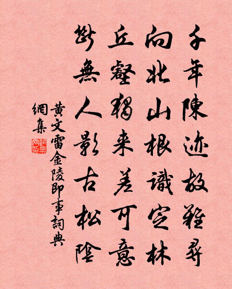 詩詞名句歷史字典書法欣賞書法字典國語詞典說文解字康熙字典古漢語字典標 題 作 者 詩 句 金陵即事作者:黃文雷 朝代:宋代金陵即事原文千年陳跡故難尋,向北山根識定林。丘壑獨來差可意,斷無人影古松陰。詩詞問答問:金陵即事的作者是誰?答:黃文雷問:金陵即事寫於哪個朝代?答:宋代黃文雷金陵即事書法欣賞金陵即事書法作品詩詞推薦訪隱者葉紹翁〔宋代〕不作王門夢,來敲隱者關。童先孤鶴化,雲伴一身閒。礙筍新移路,低牆為看山。幾回松下去,鋤得茯苓還。送王季嘉赴湖南漕司主管官陸游〔宋代〕它人作陵邑,榜笞朝暮急;王子乃不然,袖手萬事集。它人西入都,競裁丞相書;王子掉頭去,長沙萬里余。問子採桑子謝逸〔宋代〕冰霜林里爭先發,獨壓群花。風送清笳。更引輕煙淡淡遮。抱牆溪水彎環碧,月色清華。疏影橫斜。恰似林逋處士仰和皇太了殿下明禋慶成詩韻馬廷鸞〔宋代〕夕宿猶疎雨,昕朝睹大明。重光符影貺,熙事慶昇平。廣鑒大師觀上人為靈芝數百眾故乞從檀施乞米毛滂〔宋代〕靈芝有良田,歲比萬戶侯。平生有力耕,以德作耡耰。不許倉箱豐,但知缽盂秋。木魚一呼飯,千屐如水流。靈芝清源寺戴栩〔宋代〕踏破祖師關,參黃仍吊顏。龍分一脈水,鶴占半屏山。塔影浮雲外,松陰落照間。本因閒到此,吟苦不能閒。詠懷阮籍〔魏晉〕炎光延萬里,洪川盪湍瀨。彎弓掛扶桑,長劍倚天外。泰山成砥礪,黃河為裳帶。視彼莊周子,榮枯何足賴?捐身太令人胡氏輓詞葉適〔宋代〕已刻溪西志,潸然淚滿袪。軻喪嫌後侈,參養要前余。甫里送錦纜,館頭迎布車。為題楓葉往,蟲籀不成書。送袁十嶺南尋弟孟浩然〔唐代〕早聞牛渚詠,今見鶺鴒心。羽翼嗟零落,悲鳴別故林。蒼梧白雲遠,煙水洞庭深。萬里獨飛去,南風遲爾音。偈二首釋曇玩〔宋代〕汝有一對眼,我也有一對眼。汝若瞞,還自瞞。汝若成佛作祖,老僧無汝底分。汝若做驢做馬,老僧救汝不得。再和鄭剛中〔宋代〕我雖岩谷豈其卿,多壘於郊亦可驚。徒有丹心思報國,無因緩頰得論兵。跳梁狐怪今方逞,奮角狼星久未平。盍亦保福寺對橙菊有感裘萬頃〔宋代〕平生愛菊陶彭澤,清夜移橙杜草堂。千載時魂招不得,獨留風味在僧房。謝侯彥明惠白蓮栽張栻〔宋代〕添得湖光百畝余,湖邊早已成菰蒲。更移玉井峰頭種,還有花開十丈無。【正宮】脫布衫過小梁州 美妓佚名〔元代〕冰肌瑩寶釧玲瓏,藕絲輕環佩玎冬。櫻桃小胭脂露濃,海棠嬌麝蘭香送。 玉頸圓搓粉膩紅,恰便似映水芙蓉偶成釋文珦〔宋代〕名利雙蝸角,堪輿一旅亭。生平嫌著物,老去更忘形。慢火煎茶熟,寒燈照夢醒。室空無道伴,自展八還經。落花怨十首劉克莊〔宋代〕越公多美妓,衛尉足名姝。無計留紅拂,傷心墜綠珠。次韻和主人喜諸客見過之什楊億〔宋代〕金鴨噴香繞燭台,輕雲散盡月光來。三千賓客連宵醉,十二城門徹曉開。何幸紫微容托乘,更煩紅袖與傳杯。明朝柳絮盧梅坡〔宋代〕晴欄看盡柳花飛,一段風情不自持。若使化為萍逐水,不如且作絮沾泥。題扇二十四首曹勛〔宋代〕弄袖和風拂拂輕,眾香迎面酒微醒。涼尋小徑通幽處,花壓欄乾竹一亭。補破為杜詩下轉語贈老婦艾性夫〔宋代〕一寒誰復解綈袍,百結重縫嘆汝勞。莫遣海圖歸短褐,此身正自困風濤。名句推薦想子胥今夜見嫦娥,沉冤雪。史達祖《滿江紅·中秋夜潮》 沖天香陣透長安,滿城盡帶黃金甲。黃巢《不第後賦菊》 一簞食,一瓢飲,在陋巷,人不堪其憂,回也不改其樂。賢哉,回也!孔子弟子《論語·雍也篇》 三教於是乎可一矣。王通《中說·卷五·問易篇》 白鳥一雙臨水立,見人驚起入蘆花。戴復古《江村晚眺》 三萬里河東入海,五千仞岳上摩天。陸游《秋夜將曉出籬門迎涼有感》 三月三日天氣新,長安水邊多麗人。杜甫《麗人行》 半死梧桐老病身,重泉一念一傷神。白居易《為薛台悼亡》 天涯失鄉路,江外老華發。李白《江南春懷》 圓魄上寒空,皆言四海同。李嶠《中秋月二首·其二》