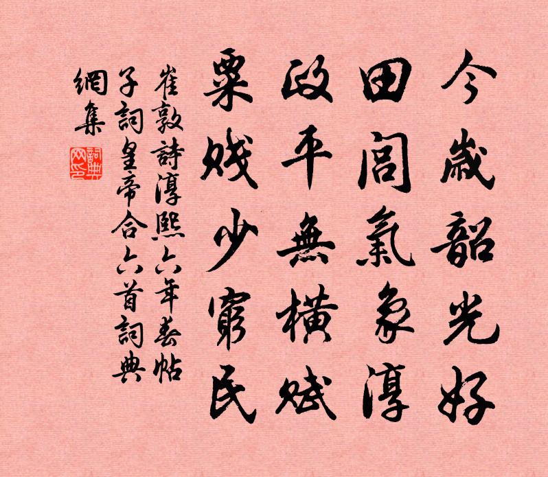 詩詞名句歷史字典書法欣賞書法字典國語詞典說文解字康熙字典古漢語字典標 題 作 者 詩 句 淳熙六年春帖子詞皇帝合六首作者:崔敦詩 朝代:宋代原文今歲韶光好,田閭氣象淳。政平無橫賦,粟賤少窮民。詩詞問答問:《淳熙六年春帖子詞皇帝合六首》的作者是誰?答:崔敦詩問:該詩寫於哪個朝代?答:宋代書法欣賞淳熙六年春帖子詞皇帝合六首書法作品詩詞推薦魚石二首孔武仲〔宋代〕人疑魚托石,我謂石為魚。持以贈君子,端能辟蠹書。無情逐波浪,有此璠與璵。坐得江湖意,蕭然亦起予。甲申歲作楊冠卿〔宋代〕急雨來排難,余蒸頓解嚴,時蜩鳴露柳,客燕度風簾。屈指秋無幾,安心氣自恬。夜涼都不寐,落月瑩虛檐。清輝殿觀唐明皇山水石字歌王琪〔宋代〕皇家四葉恢聖功,天臨日燭清華戎。漢條靜治洽柔教,老心稽古開神聰。有唐英主稱好文,仙毫灑落驅風雲。壯哉上霅川裴郎中羅隱〔唐代〕貴提金印出鹹秦,瀟灑江城兩度春。一派水清疑見膽,數重山翠欲留人。望崇早合歸黃閣,詩好何妨戀白蘋。自是偶書鄭剛中〔宋代〕身名蹭蹬元無況,杯酒流行強自寬。夜半窮閻閉梅雨,昏昏燈火淚中看。得三七侄書說湖山佳趣因以書中語成四韻吳芾〔宋代〕今日家書到,從頭說故丘。園林增茂密,池館愈清幽。嫩竹已千個,新蓮僅萬頭。欲歸歸未得,長是夢中游。醜奴兒(見白髮)米芾〔宋代〕踟躕山下濡須水,我更委佗。物阜時和。迨暇相逢笑復歌。江湖樓上憑闌久,極目滄波。天鑒如磨。偏映華簪雪一寓意十首次敬助韻 其九王冕〔元代〕飄飄青瑣郎,翩翩夾綺衣。媚媚紅樓春,昏昏不知歸。朝睹綠髮潤,暮驚白雪飛。只有陶隱居,頗能知此機。函鏡如書帙號日賢如編題共首以伽陀鄭剛中〔宋代〕箇中三業身,如夢幻泡影。如露亦如電,無有真實相。是諸個物者,眾生悉如之。以寔諸有故,遂隨起滅中。我今贈杭僧道潛蘇轍〔宋代〕月中依松鶴,露下抱葉蟬。賦形已孤潔,發響仍清圓。潛師本江海,浪跡游市廛。髭長不能翦,衲壞聊復穿。瘦骨安平公詩(故贈尚書韓氏)李商隱〔唐代〕丈人博陵王名家,憐我總角稱才華。華州留語曉至暮,高聲喝吏放兩衙。明朝騎馬出城外,送我習業南山阿。仲子龍女祠後塘自生荷花數權與史誠之更相酬和司馬光〔宋代〕平湖漠漠芰荷稠,水國芳春不勝秋。空有棹歌人不見,晚風一曲去悠悠。霜天曉角(再和)吳潛〔宋代〕舉杯吸月,一洗煩襟熱。相見摩訶池上,星斗轉、掛銀闕。金吾傳漏鐵,此時滋味別。階砌寒蛩聲細,攜手處、人巫山一段雲 寄天長道眾尹志平〔元代〕山後春將暮,龍陽景漸佳。東園芭欖正開花。隨分有生涯。道友堅心長久。相見時時稽首。自然恬淡日和平。物外易州登龍興寺樓望郡北高峰賈島〔唐代〕郡北最高峰,巉岩絕雲路。朝來上樓望,稍覺得幽趣。朦朧碧煙里,群嶺若相附。何時一登陟,萬物皆下顧。燈夕寄獻內翰虢略公劉筠〔宋代〕千輪佛火照層城,九陌香車擊迅霆。簡子最知天帝樂,孟家惟信紫姑靈。金徒抱箭催壺水,玉字來風滿砌蓂。簾卷東武吟行沈約〔南北朝〕天德深且曠。人世賤而浮。東枝纔拂景。西壑已停輈。逝辭金門寵。去飲玉池流。霄轡一永矣。俗累從此休。【越調】寨兒令_湖上錦制屏任昱〔元代〕湖上錦制屏,鏡涵冰,濃脂淡粉如故情。酒量長鯨,歌韻雛鶯,醉眼看丹青。養花天雲淡風輕,勝桃源水秀山明。答裴令公雪中訝白二十二與諸公不相訪之什劉禹錫〔唐代〕玉樹瓊樓滿眼新,的知開閤待諸賓。遲遲未去非無意,擬作梁園坐右人。次韻陳料院方岳〔宋代〕紅旗破賊本非才,白首為郎更此來。群玉府應羞噲伍,碧油幢誤築燕台。江行莫等蛟鼉怒,雨歇能令鷗鷺猜。三逕名句推薦萬頃風濤不記蘇。雪晴江上麥千車。但令人飽我愁無。蘇軾《浣溪沙·萬頃風濤不記蘇》 還將兩行淚,遙寄海西頭。孟浩然《宿桐廬江寄廣陵舊遊》 料峭春寒中酒,交加曉夢啼鶯。吳文英《風入松·聽風聽雨過清明》 垂下簾櫳。雙燕歸來細雨中。歐陽修《採桑子·群芳過後西湖好》 還始覺、留情緣眼,寬頻因春。吳文英《渡江雲三犯·西湖清明》 十里西疇熟稻香,槿花籬落竹絲長,垂垂山果掛青黃。范成大《浣溪沙·江村道中》 可憐青冢已蕪沒,尚有哀弦留至今。王安石《明妃曲二首》 去年折贈行人遠,今年恨、依然縴手。吳文英《花心動·柳》 居移氣,養移體。孟子《孟子·盡心章句上·第三十六節》 遇酒且呵呵,人生能幾何!韋莊《菩薩蠻·勸君今夜須沈醉》
