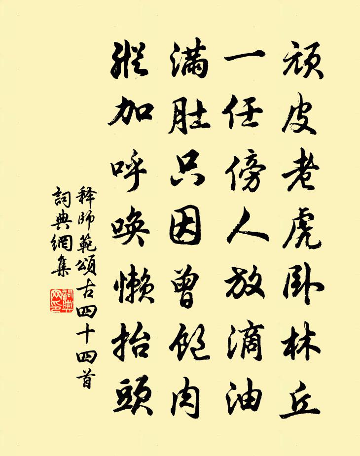 詩詞名句歷史字典書法欣賞書法字典國語詞典說文解字康熙字典古漢語字典標 題 作 者 詩 句 頌古四十四首作者:釋師範 朝代:宋代頌古四十四首原文頑皮老虎臥林丘,一任傍人放滴油。滿肚只因曾飽肉,縱加呼喚懶抬頭。詩詞問答問:頌古四十四首的作者是誰?答:釋師範問:頌古四十四首寫於哪個朝代?答:宋代釋師範頌古四十四首書法欣賞頌古四十四首書法作品詩詞推薦偈公六十五首釋鹹傑〔宋代〕油煎石磉盤,風吹毛毬走。虛空背上白毛生,拈得鼻孔失卻口。鷓鴣天·東陽道中辛棄疾〔宋代〕撲面征塵去路遙,香篝漸覺水沉銷。山無重數周遭碧,花不知名分外嬌。人歷歷,馬蕭蕭,旌旗又過小紅橋。愁邊寄裴施州(裴冕坐李輔國貶施州刺史)杜甫〔唐代〕廊廟書之具裴施書州,宿昔書一逢無此流。金鐘大鏞在東序,冰壺玉衡懸清秋。自從相遇感多病,三歲為客寬邊愁余得蘆竹拄杖於舍傍民家似蘆非蘆堅勁輕滑色陸游〔宋代〕輕堅蘆竹杖,入用自龜堂。挺節冰霜後,論交歲月長。心空無寵辱,時異有行藏。老病登臨少,何妨日倚床。答余司理陳造〔宋代〕緬懷海縣游,不作千山隔。雖償還俗債。茲復望霓厄。孰知赫曦中,欻有油雲升。六幕一汛掃,病骨如濯清。西山寄韋子春(一作山中贈十四秘書兄)王季友〔唐代〕出山秋雲曙,山木已再春。食我山中藥,不憶山中人。山中誰余密,白髮日相親。雀鼠晝夜無,知我廚廩貧。依依賀杜清獻入相戴木〔宋代〕玉陛傳呼宰相來,歡騰海內翕如雷。律身清介祁公操,佐主謀謨如晦才。夢弼已知符眾望,生賢益信應三台。從容吳公路作功德院記成同居安入山書丹劉子翬〔宋代〕淨坊疏寵自吾君,盍有豐碑載策勛。方見隳崖礱翠琰,忽驚落筆散彤雲。言言未索西山氣,噩噩新摛左氏文。從此將至廣州用過韻寄邁迨二子蘇軾〔宋代〕皇天遣出家,臨老乃學道。北歸為兒子,破戒堪一笑。披雲見天眼,回首失海潦。蠻唱與黎歌,餘音猶杳杳。大兒觀蘇仲南詩卷張耒〔宋代〕蘇子詩如刃發硎,十章入耳韻泠泠。文章三昧無多子,只守君家舊典刑。虢國夫人夜遊圖蘇軾〔宋代〕佳人自鞚玉花驄,翩如驚燕蹋飛龍。金鞭爭道寶釵落,何人先入明光宮。宮中羯鼓催花柳,玉奴弦索花奴手。坐中送東川本之太白釋紹曇〔宋代〕萬松關險路縈紆,門掩深雲窄有餘。佛過低頭不妨得,且圖人見額邊珠。陳少陽贈官高登〔宋代〕憶昔靖康初,厄運會中微。嚴禁馳邊備,長驅來健兒。堂堂搗京闕,百萬呼鼓鼙。天地為改色,日月晴晦迷。當寧竭陸宣公祠林景熙〔宋代〕冰玉為骨秋為神,堂堂內相真天人。諫草數百垂清芬,仁義一洗功利塵。刳肝瀝血空排雲,白日不鑒吾忠勤。奉天題周子中司戶乘成台三首楊萬里〔宋代〕不煩營築便成台,自有青松不用栽。只道先生忙更懶,也須一日一回來。採桑子劉志淵〔元代〕虛無妙道心堅守,虛自投來。氤氳成胎。靈質無中日月栽。時時自飲崑山酒,醉臥丹台。令攝三台。萬劫迷雲一豁桐川道中吳潛〔宋代〕伊軋籃輿拂面風,桃花倚路笑相逢。鶯鶯交囀春榆密,燕燕於民冰煙樹。日午暫休欹客枕,年飢忽喜聽村舂。鄉音祖龍詞熊皦〔唐代〕平吞六國更何求,童女童男問十洲。滄海不回應悵望,始知徐福解風流。亮典座歸中峰庵釋崇岳〔宋代〕太白峰高宇宙低,先師靈骨不曾移。兒孫個個且如許,路上行人口似碑。秋夕閒居對雨贈別盧七侍御坦竇牟〔唐代〕燕燕辭巢蟬蛻枝,窮居積雨壞藩籬。夜長檐霤寒無寢,日晏廚煙濕未炊。悟主一言那可學,從軍五首竟徒為。故人名句推薦輪匠執其規、矩,以度天下之方圓墨子《墨子·天志(上)》 君子以同而異。佚名《易傳·象傳下·睽》 歸裝漸理君知否?笑指廬山古澗藤。陸游《自詠示客》 笑拈芳草不知名,乍凌波、斷橋西堍。吳文英《西子妝慢·湖上清明薄游》 老農家貧在山住,耕種山田三四畝。張籍《野老歌 / 山農詞》 雲間連下榻,天上接行杯。李白《與夏十二登岳陽樓》 風勁角弓鳴,將軍獵渭城。王維《觀獵》 此中有真意,欲辨已忘言。陶淵明《飲酒·其五》 終南陰嶺秀,積雪浮雲端。祖詠《終南望余雪》 素衣莫起風塵嘆,猶及清明可到家。陸游《臨安春雨初霽》