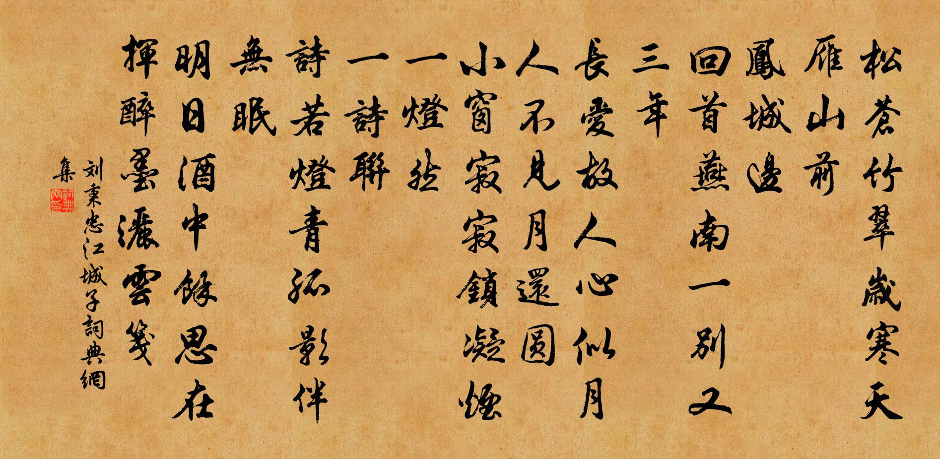 詩詞名句歷史字典書法欣賞書法字典國語詞典說文解字康熙字典古漢語字典標 題 作 者 詩 句 江城子作者:劉秉忠 朝代:元代江城子原文松蒼竹翠歲寒天。雁山前。鳳城邊。回首燕南,一別又三年。長愛故人心似月,人不見,月還圓。小窗寂寂鎖凝煙。一燈然。一詩聯。詩若燈青,孤影伴無眠。明日酒中餘思在,揮醉墨,灑雲箋。詩詞問答問:江城子的作者是誰?答:劉秉忠問:江城子寫於哪個朝代?答:元代問:江城子是什麼體裁?答:詞劉秉忠江城子書法欣賞江城子書法作品詩詞推薦頌古一百則釋正覺〔宋代〕巍巍堂堂,磊磊落落。鬧處刺頭,穩處下腳。腳下線斷我自由,鼻端泥盡君休斲。莫動著,千年故紙中合藥。通判桃花廳梅堯臣〔宋代〕種桃西庭下,有意延東風。東風與雨至,染出枝上紅。花底有小鳥,其字曰桃蟲。既於桃得名,為桃言女工。翦羅西江月(天祐遣餉牡丹,侑以新詞,次韻為謝)郭應祥〔宋代〕為愛臉邊著暈,更憐肌里生香。此花端合占年芳。兩朵那堪一樣。自嘆思歸陶令,忽逢好事彭郎。朋來異卉與名章和傅寺丞竹穩之什讀書堂陳宓〔宋代〕閉門聲吾咿,世仰德行成。祿仕非有意,邦國須公榮。區區刀筆徒,未足稱股肱。寄向伯恭朱翌〔宋代〕天竺山前昔據鞍,帽峨高屋古袍寬。發雖經舊十分白,心有憂時一寸丹。雲路正看鳴劍履,君門可早掛衣冠。為公終南雲際精舍尋法澄上人不遇歸高冠東潭石淙…貽友人岑參〔唐代〕昨夜雲際宿,旦從西峰迴。不見林中僧,微雨潭上來。諸峰皆青翠,秦嶺獨不開。石鼓有時鳴,秦王安在哉。東南以前韻再繼五絕王洋〔宋代〕夜發前村君莫惜,曉與天花比真色。爭先不是壓群芳,祗恐群芳心自息。水調歌頭 長壽新齊元好問〔金代〕蒼煙百年木,春雨一溪花。移居白鹿東崦,家具滿樵車。舊有黃牛十角,分去聲得山田一曲,涼薄了生涯。一笑顧【雙調】慶宣和張養浩〔元代〕參議隨朝天意可,又受奔波,綽然誰更笑呵呵。倒大來快活,倒大來快活。大小清河諸錦波,華鵲山坡,牧童齊唱代梁總挽鄭舜舉侍郎四首劉宰〔宋代〕九重虛己竚論思,千載風雲彼一時。貝錦誰為當日事,解招空賦昔人詩。冬至後三日三首張耒〔宋代〕寒暑添線衲,朝晡折足鐺。何勞問榮辱,便是了平生。理自陰陽運,吾寧口舌爭。深居玩吾寶,不遺世人輕。維揚秋日牡丹因寄六合縣尉郭承范潘閬〔宋代〕繞欄忽見思傍徨,造化功深莫可量。稼艷算無三月盛,殘紅更向九秋芳。萬家珠翠還爭賞,一郡笙歌又是狂。惆悵呈張太平三首趙蕃〔宋代〕門牆十五載,每見辱加親。老至名不立,道乖家轉貧。世誰能我及,志欲向公申。剩欲搜詩獻,青山恐笑人。江南新體戴復古〔宋代〕郎船江下泊,妾家樓上住。朝朝暮暮間,上下兩相顧。相顧不相親,風波愁 * 。閨怨舒岳祥〔宋代〕貯雪成酥飣玉盤,勸郎抄取一匙餐。金針指冷愁花凍,侍婢添香卻夜寒。莫愁曲徐凝〔唐代〕玳瑁床頭刺戰袍,碧紗窗外葉騷騷。若為教作遼西夢,月冷如丁風似刀。偈頌七十六首釋子益〔宋代〕識得一,萬事畢。佛法颺在它方,世法拈靠一壁。有問奇特因緣,立秋已過五日。梁鼓吹曲 木紀謝沈約〔南北朝〕木紀謝。火運昌。炳南陸。耀炎光。民去癸。鼎歸梁。鮫魚出。慶雲翔。韊五帝。軼三王。德無外。化溥將。仁盪新晴出溪上因訪王伯明詹望之王炎〔宋代〕萍轉滯岩邑,簡出而深居。兒輩不自量,妄意游璧池。日占烏鵲喜,不寄黃犬書。積雨蒸溽暑,客思郁不舒。新晴歲寒雜詠錢時〔宋代〕森森多願長琅玕,相伴山翁老歲寒。雨後籜龍添幾許,兒童歡喜報來看。名句推薦富潤屋,德潤身,心廣體胖曾子《禮記·大學》 陽春布德澤,萬物生光輝。佚名《長歌行》 故園便是無兵馬,猶有歸時一段愁陳與義《送人歸京師》 傷高懷遠幾時窮。無物似情濃。張先《一叢花令·傷高懷遠幾時窮》 風住塵香花已盡,日晚倦梳頭。李清照《武陵春·春晚》 君子動而世為天下道,行而世為天下法,言而世為天下則。子思《中庸·第二十九章》 凌晨過驪山,御榻在嵽嵲杜甫《自京赴奉先縣詠懷五百字》 聽君一席話,勝讀十年書。佚名《增廣賢文·上集》 夜雨滴空階,孤館夢回,情緒蕭索。柳永《尾犯·夜雨滴空階》 但使龍城飛將在,不教胡馬度陰山。王昌齡《出塞二首》