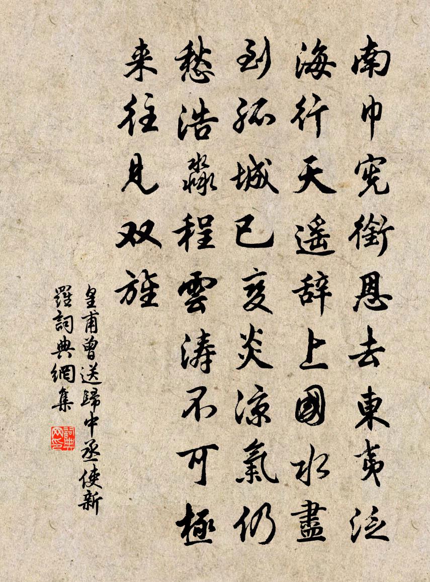 詩詞名句歷史字典書法欣賞書法字典國語詞典說文解字康熙字典古漢語字典標 題 作 者 詩 句 送歸中丞使新羅作者:皇甫曾 朝代:唐代送歸中丞使新羅原文南巾憲銜恩去,東夷泛海行。天遙辭上國,水盡到孤城。已變炎涼氣,仍愁浩淼程。雲濤不可極,來往見雙旌。詩詞問答問:送歸中丞使新羅的作者是誰?答:皇甫曾問:送歸中丞使新羅寫於哪個朝代?答:唐代皇甫曾送歸中丞使新羅書法欣賞送歸中丞使新羅書法作品注釋全唐詩:卷210_20詩詞推薦丁未春五首劉克莊〔宋代〕端平淳祐兩匆匆,過眼光陰掣電同。六十一翁無出理,孤山長寄夢魂中。留山間種藝十絕劉克莊〔宋代〕蕭艾敷榮各有時,深藏芳潔欲奚為。世間鼻孔無憑據,且伴幽窗讀楚辭。三用韻奉酬楊公遠〔宋代〕乍雨微寒養麥天,村村斜日起炊煙。老夫但愧瓶無酒,芳草如茵好醉眠。連山王開詩試子午花四首陳著〔宋代〕三數莖須細捻金,圓齊五瓣外紅深。酷憎媚俗長垂首,善處驕陽不動心。色變化成丹灶火,時開落應土圭針。感懷眉州燕遊雜詠十首搖香亭晁公溯〔宋代〕臨池可手攬,何似湘水中。冥冥望北渚,木末有芙蓉。和江陵闕乾風雨問訊虛舟韻二首李曾伯〔宋代〕無人載酒到聯轡,有客攜琴午扣扉。卻羨渚宮魚為樂,菰蒲深處日相依。陳寺丞輓詩魏了翁〔宋代〕有子知乎否,蒼生命益危。共傷周赫赫,誰叫廟譆譆。隨處皆塘斧,何方不繭絲。斯人今已矣,撫事轉傷悲。滿庭芳史浩〔宋代〕復擁花旌麾,重花歌褥褲,花滿城長自花春容。搢紳耆舊,歡溢笑談中。盡道邦君愷悌,逍遙遂、湖海遐蹤。今朝一寸金佚名〔宋代〕食飽傷心損氣,睡多夢裡迷真。眼觀心動喪元神。耳聽靈台昧盡。要見元初面目,慧刀割斷紅塵。無情應物本來真憶雍都一首蘇籀〔宋代〕秦漢西都誰復加,茂陵賦筆大非夸。西瞻周道平如砥,南揖秦山翠削瓜。雷尾鳳鬃蹄逸健,蝟髯黧面手高叉。兵微成安道中懷寄馮惟逸賀鑄〔宋代〕蒼面黃須過壯時,欲投閒去兩難期。人生自是無根物,南北東西任所之。宋江三十六贊龔開〔宋代〕尉遲壯士,以病自名。端能去病,國或可成。記顏六言三首劉克莊〔宋代〕坐客驚問誰子,小孫道是吾翁。文章呼延太尉,鬚眉張鎬相公。真珠龍柏宋祁〔宋代〕彼美夜光喻,益之新甫名。纍纍雲際艷,皎皎月中英。勿誚素為絢,相期隆德聲。游善區寺王諶〔宋代〕閒來古寺欲忘歸,無奈征塵染素衣。綠葉雲稠荒澗水,白雲青濕舊禪扉。窗涵遠色明丹篆,鍾冒嵐煙入翠微。盛世金沙台蘇軾〔宋代〕雨後東風漸轉和,扣門遷客一經過。王孫采地空珪璧,長者芳聲動薜蘿。正爾謫居懷北闕,聊同笑語說東坡。山林題黃花驛薛逢〔唐代〕孤戍迢迢蜀路長,鳥鳴山館客思鄉。更看絕頂煙霞外,數樹岩花照夕陽。觀梅方岳〔宋代〕去年今日雪平檐,燒葉談計酒屢添。一笑今年又今日,不成飛絮不成鹽。法曲獻仙音姜夔〔宋代〕張彥功官舍在鐵冶嶺上,即昔之教訪使舍。高齋下瞰湖山,光景奇絕。予數過之,為賦此。虛閣籠寒,小簾通月,蝶戀花 送祐之弟辛棄疾〔宋代〕衰草殘陽三萬頃。不算飄零,天外孤鴻影。幾許淒涼須痛飲。行人自向江頭醒。會少離多看兩鬢。萬縷千絲,何況名句推薦送君如昨日,檐前露已團。江淹《古離別》 早知潮有信,嫁與弄潮兒。李益《江南曲》 學是一個尋常的家飯,當隨事而警惕。洪應明《菜根譚·概論》 正江令恨別,庾信愁賦劉辰翁《蘭陵王·丙子送春》 問元戎早晚,鳴鞭徑去,解天山箭。元好問《水龍吟·從商帥國器獵於南陽同仲澤鼎玉賦此》 桃花三十六陂,鮫宮睡起,嬌雷乍轉。吳文英《瑞龍吟·德清清明競渡》 明君用人,如大匠用材,隨其巨細長短,以施規矩繩墨。宋濂、王褘《元史·列傳·卷四十四》 治天下者當用天下之心為心,不得自專快意而已也。班固《漢書·傳·王貢兩龔鮑傳》 魂來楓葉青,魂返關塞蒙杜甫《夢李白二首·其一》 銜霜當路發,映雪擬寒開。何遜《詠早梅 / 揚州法曹梅花盛開》