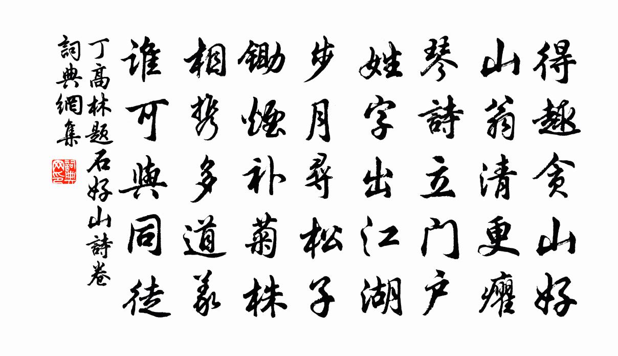 詩詞名句歷史字典書法欣賞書法字典國語詞典說文解字康熙字典古漢語字典標 題 作 者 詩 句 題石好山詩卷作者:丁高林 朝代:宋代題石好山詩卷原文得趣貪山好,山翁清更癯。琴詩立門戶,姓字出江湖。步月尋松子,鋤煙補菊株。相攜多道義,誰可與同徒。詩詞問答問:題石好山詩卷的作者是誰?答:丁高林問:題石好山詩卷寫於哪個朝代?答:宋代丁高林題石好山詩卷書法欣賞題石好山詩卷書法作品詩詞推薦九曲櫂歌十首白玉蟾〔宋代〕幾點沙鷗泛碧流,蘆花兩岸暮雲愁。鼓樓岩下一聲笛,驚落梧桐飛起秋。和士特栽果十首桃劉子翬〔宋代〕手種桃花滿北山,花紅艷 * 春灣。不知何代兒孫老,卻見漁舟乍往還。楊柳枝方岳〔宋代〕小橋風定綠煙垂,幾送行人此別離。蹀躞玉驄嘶草去,啼鶯寂螢雨千絲。與伯雨登溪山勝概樓倪瓚〔元代〕樓下清溪夏亦寒,溪頭個個白鷗閒。風回綠卷平堤水,林缺青分隔岸山。若士振衣千仞表,何人泛宅五湖間。絕憐卜運算元(除夕)朱敦儒〔宋代〕江上見新年,年夜聽春雨。有個人人領略春,粉澹紅輕注。深勸玉東西,低唱黃金縷。拈底梅花總是愁,酒盡人歸三奠子 登河中迎煦樓故址,即唐崔徽白樓也王惲〔元代〕壯河山表里,百二喉襟。形勝地,古猶今。風雲全晉在,草木故都深。淡長空,孤鳥沒,總消沉。東山高臥,梁甫贛守鄭舜舉寄詩酒於答書中就附四句周必大〔宋代〕十七篇詩酒滿壺,贛州風景塞繩樞。詩中有畫今摩詰,安用當年八境圖。古詞曹鄴〔唐代〕高闕礙飛鳥,人言是君家。經年不歸去,愛妾面上花。妾面雖有花,妾心非女蘿。郎妻自不重,於妾欲如何?送孫誠之尉北海秦觀〔宋代〕吾鄉如覆孟,地據提楚脊。環以萬頃湖,粘天四無壁。蜿蜓戲神珠,正晝飛霹靂。草木無異姿,靈氣殊鬱積。所以二月九日訪仰之聞德茂與婿鄧叔厚蚤作逍遙溪王洋〔宋代〕貪閒心不受囂塵,六十年餘自在身。愛水愛山三益友,如冰如玉兩閒人。言無拘畏詩多健,酒借豪華力有神。聞說遺所思曹勛〔宋代〕君行既雲遠,我思日以長。思君無所遺,寶帶雙鴛鴦。鴛鴦不相失,錦翼遊方塘。副之玳瑁簪,同心復同房。上有月袁郊〔唐代〕嫦娥竊藥出人間,藏在蟾宮不放還。后羿遍尋無覓處,誰知天上卻容奸。夜看櫻桃花皮日休〔唐代〕纖枝瑤月弄圓霜,半入鄰家半入牆。劉阮不知人獨立,滿衣清露到明香。傅推官勸農七絕句擬和其五山家鄭剛中〔宋代〕蓬蒿深處有人家,戶外蛛絲綱露華。數樹芭焦乾未得,長官親自見生涯。和聖俞農具詩十五首其十三襏襫王安石〔宋代〕采采霜露下,披披煙雨中。薄茅以為友,短褐相與同。勿妒市門人,綺紈被奴僮。當慚邊城戍,擐甲徂春冬。村舍雜書陸游〔宋代〕逢人乞藥栽,鬱郁遂滿園,玉芝來天姥。黃精出雲門。丹茁雨後吐,綠葉風中翻。活人吾豈能,要有此意存。次韻陳泰定見贈二首李彌遜〔宋代〕月魄哉生望已幾,豪華未厭老相隨。放疏世故開黃卷,銷心塵心對紫芝,急雨知寒催葉落,斷雲乘晚截山低。小槽五月二十四日宿永睦將口香積院僧軒東望甚遠張嵲〔宋代〕遠投僧舍青煙畔,夾路松音鐘磬幽。試倚危軒望鄉色,三巴日暮遠峰稠。題馬以道畫扇王之道〔宋代〕寒蘆臥疏黃,遠水分淡碧。秋荷如有情,相映兩鸂鶒。喜沈叔晦到范成大〔宋代〕澹若論交味,嚶其求友聲。江湖幾魚沫,風雨一雞鳴。舊事休重說,新詩莫細評。煩將憶勤夢,歸對海山橫。名句推薦獨抱濃愁無好夢,夜闌猶剪燈花弄。李清照《蝶戀花·暖雨晴風初破凍》 知音少,弦斷有誰聽。岳飛《小重山·昨夜寒蛩不住鳴》 通則驕而偏,窮則棄而儑。荀子《荀子·不苟》 目不能兩視而明,耳不能兩聽而聰。荀子《荀子·勸學》 昨夜星辰昨夜風,畫樓西畔桂堂東。李商隱《無題·昨夜星辰昨夜風》 玉露金風報素秋,穿針樓上獨含愁。德容《七夕二首·其一》 知我者,謂我心憂;不知我者,謂我何求。佚名《黍離》 黃蘆掩映清江下,斜纜著釣魚艖。關漢卿《大德歌·冬景》 故鄉遙,何日去。家住吳門,久作長安旅。周邦彥《蘇幕遮·燎沉香》 道生一,一生二,二生三,三生萬物。老子《老子·德經·第四十二章》