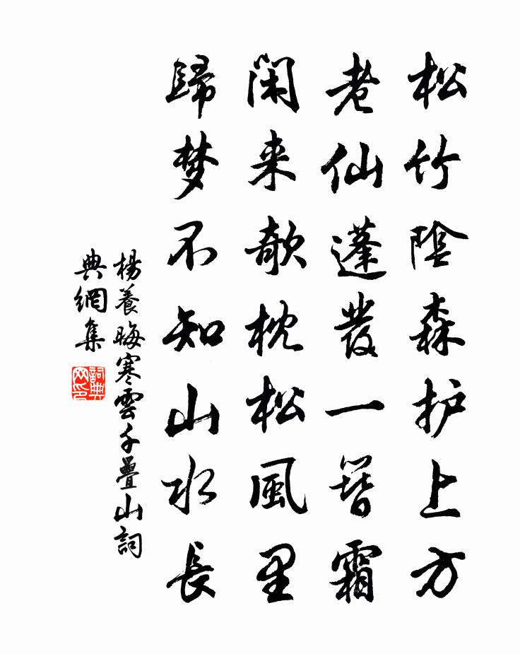 詩詞名句歷史字典書法欣賞書法字典國語詞典說文解字康熙字典古漢語字典標 題 作 者 詩 句 寒雲千疊山作者:楊養晦 朝代:宋代寒雲千疊山原文松竹陰森護上方,老仙蓬髮一簪霜。閒來欹枕松風裡,歸夢不知山水長。詩詞問答問:寒雲千疊山的作者是誰?答:楊養晦問:寒雲千疊山寫於哪個朝代?答:宋代楊養晦寒雲千疊山書法欣賞寒雲千疊山書法作品詩詞推薦上林春/一落縈晁端禮〔宋代〕伊洛清波,嵩山秀色,共與皇家為瑞。挺生異質,親逢盛旦,簪纓舊傳家世。雁爐煙里,罩一段、照人清氣。燦金偈頌六十首釋曇華〔宋代〕黃面老人乾屎橛,參隨一火爛泥團。心肝腸胃皆條直,蔬飯茶花照膽寒。佛法雖然未夢見,神通卻許入雲端。應須小窗對客趙崇嶓〔宋代〕紙帳梅花自一真,小窗對語坐無裀。詩家供給惟風月,病與詩疏始覺貧。寒夜孟浩然〔唐代〕閨夕綺窗閉,佳人罷縫衣。理琴開寶匣,就枕臥重帷。夜久燈花落,薰籠香氣微。錦衾重自暖,遮莫曉霜飛。謝劉學錄惠詩陳宓〔宋代〕清時自昔有閒人,不獨巢由作外臣。聖宋每容求退士,名公多得自由身。年將六十仍衰病,才乏錙銖過忝塵。若待石門洞樓鑰〔宋代〕扁舟百里蓮城回,青山中斷立兩崖。清都虎豹隱不見,但見閶闔排雲開。峰迴失喜大飛瀑,聲震萬壑驚春雷。掀髯答王定民蘇軾〔宋代〕開緘奕奕滿銀鉤,書尾題詩語更遒。八法舊聞宗長史,五言今復擬蘇州。筆蹤好在留台寺,旗隊遙知到石溝。欲寄春日長安故苑有懷寇準〔宋代〕唐室空城有舊基,荒涼長使後人悲。遙村日暖花空發,廢苑春深柳自垂。事著簡編猶可念,景隨陵谷更何疑。入梁示無住道人釋慧遠〔宋代〕打破從來淨潔禪,萬機攢簇髑髏前。橫身塞斷來時路,一句當機日麗天。琴易士達〔宋代〕花間橫膝興何深,流水高山幾古今。一自杏壇聲響絕,不知誰解繼遺音。偈頌四首釋了朴〔宋代〕桃花紅,李花白,東君怯寒辨未得。且令蝴蝶舞三台,啄木和成十八拍。呵呵呵,可憐陌上遊人,開眼堂堂著賊。清化寓居王炎〔宋代〕委巷何深僻,僑居太寂寥。古牆行絡石,喬木上凌霄。賦就貧難逐,詩成隱莫招。固窮吾輩事,心地要逍遙。仲尼吟邵雍〔宋代〕仲尼生魯在吾先,去聖千餘五百年。今日誰能知此道,當時人自比於天。皇王旁伯中原主,父子君臣萬世權。河不松嶺丁大容〔宋代〕十里城西松嶺庵,每經過此便懷慚。此山若有歸耕地,肯墜嵇康七不堪。句曾幾〔宋代〕使君領客未經旬,更以蝤蛑作小春。襄陽席上呈於司空(一作元稹詩)馬戴〔唐代〕花枝臨水復臨堤,也照清江也照泥。寄語東君好抬舉,夜來曾伴鳳凰棲。次韻答提刑王朝奉席上看梅見貽韓維〔宋代〕誠已從來不問天,肯將衰白慕華軒。調羹豈是山翁事,只合看花對酒樽。別李浦之京王昌齡〔唐代〕故園今在灞陵西,江畔逢君醉不迷。小弟鄰莊尚漁獵,一封書寄數行啼。留別王司馬嵩李白〔唐代〕魯連賣談笑,豈是顧千金。陶朱雖相越,本有五湖心。余亦南陽子,時為梁甫吟。蒼山容偃蹇,白日惜頹侵。願一四月二十日與客來城南積潦方盛湖光恬然如平張栻〔宋代〕澤國盛梅雨,漲潦彌兩涘。常時侵溢患,乃復到城市。納湖迫西闉,衝突固其於。今年築堤防,楗石細積累。艱辛名句推薦偶然值林叟,談笑無還期。王維《終南別業 / 初至山中 / 入山寄城中故人》 黃花本是無情物,也共先生晚節香。于謙《過菊江亭》 事不至大,無以驚人。案不及眾,功之匪顯。來俊臣《羅織經·瓜蔓卷第十二》 曉迎秋露一枝新,不占園中最上春。杜牧《紫薇花》 蠻姜豆蔻相思味。算卻在、春風舌底。吳文英《杏花天·詠湯》 逢郎欲語低頭笑,碧玉搔頭落水中。白居易《採蓮曲》 雉雊麥苗秀,蠶眠桑葉稀。王維《渭川田家》 弗愛弗利,親子叛父。劉安及其門客《淮南子·繆稱訓》 欲速則不達。孔子弟子《論語·子路篇》 君子莫大乎與人為善。孟子《孟子·公孫丑章句上·第八節》