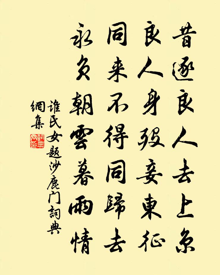 詩詞名句歷史字典書法欣賞書法字典國語詞典說文解字康熙字典古漢語字典標 題 作 者 詩 句 題沙鹿門作者:誰氏女 朝代:唐代題沙鹿門原文昔逐良人去上京,良人身歿妾東征。同來不得同歸去,永負朝雲暮雨情。詩詞問答問:題沙鹿門的作者是誰?答:誰氏女問:題沙鹿門寫於哪個朝代?答:唐代問:題沙鹿門是什麼體裁?答:七絕誰氏女題沙鹿門書法欣賞題沙鹿門書法作品注釋全唐詩:卷801-55詩詞推薦楊秀才書屋有墨竹一枝為其添補數葉五絕胡寅〔宋代〕掃盡鵝溪匹練霜,未知三尺映茅堂。此君不是塵中物,何必區區較色香。浙西送杜晦侍御入關章碣〔唐代〕紫詔征賢發帝聰,繡衣行處撲香風。鶚歸秦樹幽禽散,星出吳天列舍空。捧日思馳仙掌外,朝宗勢動海門中。鞭鞘燈嘆洪咨夔〔宋代〕坐久燈欲乾,倒檠丐餘瀝。點滴能幾多,爐滅在漏刻。可以觀養生,精涸神氣蝕。豈伊半圭茸,能續踵後息。可以鷓鴣天姜夔〔宋代〕曾共君侯歷聘來。去年今日踏莓苔。旌揚宅里疏疏磬。掛屩楓前草草杯。呼煮酒,摘青梅。今年官事莫徘徊。移家送人歸金華釋文珦〔宋代〕此去金華水作程,扁舟定是過嚴陵。高山蔽日寒多霧,淺瀨通潮夜不冰。漢代絲風應自詠,故鄉三洞與誰登。擬從惠洪上人釋祖欽〔宋代〕洪蒙既判,惠然紅日。天地開明,即心是佛。塵沙剎海,遍界發輝。一絲毫頭,昧之不得。卻須直下掀翻,休為知湖陵與劉生別陳師道〔宋代〕觸寒歷險來特特,愧無以當欣有得。向來憂患不相舍,知子用心堅鐵石。人畏有心事無難,此語雖鄙理則然。君今耶溪泛舟①孟浩然〔唐代〕落景余清暉,輕橈弄溪渚。②泓澄愛水物,臨泛何容與。③白首垂釣翁,新妝浣紗女。看看未相識,脈脈不得語。牡丹和韻二首衛宗武〔宋代〕紅紫富輪囷,京花非浪名。相看仝國色,獨酌愧耆英。物好能移老,春歸更有情。桑檢陰未徙,尚擬續芳盟。石左藏輓詩二首文同〔宋代〕昔年陪宴上崏台,一聽新歌一舉杯。此會如今嗟已矣,擬將何調寄余哀。題羅江翠望亭兼簡西遊君子宋祁〔宋代〕暫解征鞍息使郵,孤亭望斷更夷猶。山從劍北呈天險,樹遍巴西送客愁。拂衽風和循幌入,濯纓江好近人流。憑君沁園春(次白蘭谷韻)陳深〔宋代〕浪跡煙霞,有酒千鍾,有書五車。任從來蕭散,閒心似水,何堪嫵媚,笑面如花。濯發滄浪,放歌江海,肯被紅塵句高似孫〔宋代〕雁老已忘蘇武節,蟹危猶愛畢郎奇。次蕭饒州韻仇遠〔宋代〕謙謙賢在守,止止樂閒居。健筆凌三謝,高風繼二疏。家猶傳故笏,夢不到安車。何處溪山好,相從結草廬。故丞相忠定趙沂公挽章三首曹彥約〔宋代〕鹽筴寬閩甚,兵權慮蜀多。閩民今可矣,蜀事竟如何。便好屍而祝,初無玷可磨。醫誰求徑捷,行陸強風波。大安二年夏四月大將軍出祖王羊二公於城南堂陸雲〔魏晉〕惟帝思庸。大興光迪。聖敬遠躋。神道玄邈。思媚三靈。誕膺天篤。嘉命既辱。王人言告。兄弟醵飲訪雪航次弟觀韻地陳著〔宋代〕夢斷天邊飛佩霞,短筇松路趁溪斜。歸鴉山外煙如畫,過雁雲閒雪欲花。跌岩琴書誰我輩,承平鐘鼓自僧家。從今寄江西魏按察李思衍〔宋代〕雙氣光收紫氣沈,六絲轡動使華臨。寒生柏府風霜面,清照梅花玉雪心。一道秋江澄濁浪,千崖曉色破頑陰。水天拋球樂小拋球樂/拋球樂佚名〔宋代〕兩行花竅占風流。縷金羅帶系拋球。玉纖高指紅絲網,大家著意勝頭籌。惜奴嬌佚名〔宋代〕樓起霄宮裡。五福中天紛絳瑞。弦管齊諧,清宛振逸天外。萬舞低回紛繞,羅紈搖曳。頃刻轉輪歸去,念感激天意名句推薦聖人見微以知萌,見端以知末,故見象箸而怖,知天下之不足也。韓非及後人《韓非子·說林上》 昭君拂玉鞍,上馬啼紅頰。李白《王昭君二首》 鹹言上國繁華,豈謂帝城羈旅。子蘭《秋日思舊山》 正其末者端其本,善其後者慎其先。房玄齡《晉書·列傳·第二十五章》 君子以鐘鼓道志,以琴瑟樂心。荀子《荀子·樂論》 憶共錦衾無半縫,郎似桐花,妾似桐花鳳。王士禎《蝶戀花·和漱玉詞》 落葉滿空山,何處尋行跡。韋應物《寄全椒山中道士》 野戰格鬥死,敗馬號鳴向天悲。李白《戰城南》 黃蘆掩映清江下,斜纜著釣魚艖。關漢卿《大德歌·冬景》 人惡人怕天不怕,人善人欺天不欺。佚名《增廣賢文·上集》