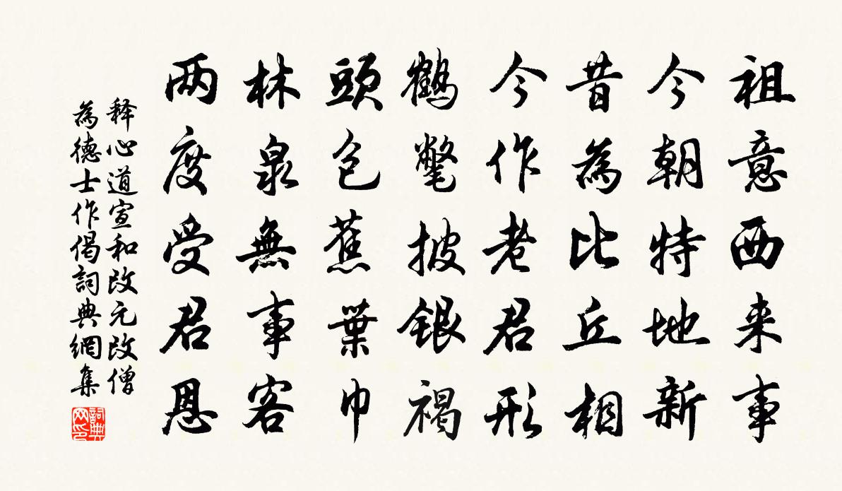 詩詞名句歷史字典書法欣賞書法字典國語詞典說文解字康熙字典古漢語字典標 題 作 者 詩 句 宣和改元改僧為德士作偈作者:釋心道 朝代:宋代宣和改元改僧為德士作偈原文祖意西來事,今朝特地新。昔為比丘相,今作老君形。鶴氅披銀褐,頭包蕉葉巾。林泉無事客,兩度受君恩。詩詞問答問:宣和改元改僧為德士作偈的作者是誰?答:釋心道問:宣和改元改僧為德士作偈寫於哪個朝代?答:宋代釋心道宣和改元改僧為德士作偈書法欣賞宣和改元改僧為德士作偈書法作品詩詞推薦秋日與知言學士釋永頤〔宋代〕水落小山浮,山人上下游。月岩煙桂晚,風浦石蘭秋。食芰漁溪宿,烹葵野館留。肩吾相對坐,清話不知休。病目林昉〔宋代〕病目兩旬余,深齊只另居。客知多寄藥,妻勸少看書。畏熱燈羞近,貪涼發屢梳。平生心喜菊,因此賸栽鋤。月華崧上人之杭釋惟一〔宋代〕月華如水夜沉沉,一曲簫韻韻更清。曲罷莫言無覓處,西湖後夜轉堪聽。和劉卿材十詠水鴨黃庶〔宋代〕憶在山中日,溪邊把釣鉤。相逢恐驚起,招手卻回舟。望江南(西方好·六首)淨圓〔宋代〕西方好,隨念即超群。一點靈光隨落日,萬端塵事付浮雲。人世自紛紛。凝望處,決定去棲神。金地經行光里步,山中贈日南僧張籍〔唐代〕獨向雙峰老,松門閉兩崖。翻經上蕉葉,掛衲落藤花。甃石新開井,穿林自種茶。時逢海南客,蠻語問誰家。上夾谷書隱先生六首何夢桂〔宋代〕反袂嘆麟折,過門傷鳳衰。奠楹不復作,世喪禮樂隳。世喪道不喪,文豈不在茲。千載而有人,三代猶可追。吾聞青玉案曹組〔宋代〕田園有計歸須早。在家縱貧亦好。南來北去何日了。光陰送盡,可憐青鬢,暗逐流年老。寂寥孤館殘燈照。鄉思驚恣逍遙 贈韓守玄馬鈺〔元代〕恣意逍遙,逍遙恣意。逍遙自在無縈系。行坐逍遙,逍遙似醉。逍遙到處,似雲似水。悟徹逍遙,逍遙養氣。逍遙九日陰雨不止病中把酒示諸子三首蘇轍〔宋代〕旱久翻成霧雨災,老人腹疾強銜杯。官醅菉豆適初熟,籬菊黃花終未開。兒女共憐佳節過,雞豚恐有故人來。衰年夏城坐雨李夢陽〔明代〕河外孤城枕草萊,絕邊風雨送愁來。一秋穿塹兵多死,十月燒荒將未回。往事空餘元昊骨,壯心思上李陵台。朝庭丙寅元日陸游〔宋代〕縹緲初聞寺閣鍾,霏微零雨兆年豐。家家椒酒歡聲里,戶戶桃符霽色中。春枕方濃從賣困,社醅雖美倦治聾。從今青玉案劉一止〔宋代〕小山遮斷藍橋路。恨短夢、難飛去。長記修眉縈曲度。約花開檻,映風招袖,總是憐渠處。追歡我已傷遲暮。猶有發魚台文天祥〔宋代〕晨炊發魚台,碎雨飛擊面。團團四野周,冥冥萬象變。疑是江南山,煙霧昏不見。豈知此中原,今古經百戰。英雄吳季野話撫州潛心閣梅堯臣〔宋代〕高閣潛心所,圖書曝蠹收。青山隨宅轉,遠水向門流。迤邐看無厭,潺湲聽不休。一聞秦洞說,便欲泛漁舟。繞佛閣吳文英〔宋代〕蒨霞艷錦,星媛夜織,河漢鳴杼。紅翠萬縷。送幽夢與、人閒繡芳句。怨宮恨羽。孤風劍漫倚,無限淒楚。□□□雜題二首司空圖〔唐代〕棋局長攜上釣船,殺中棋殺勝絲牽。洪爐任鑄千鈞鼎,只在磻溪一縷懸。曉鏡高窗氣象深,自憐清格笑塵心。世間話舊白玉蟾〔宋代〕風露三更月一簾,共君握手不能厭。酒杯滿泛榴花色,燭燄斜抽柳葉尖。夜過舒堯文戲作蘇軾〔宋代〕先生堂上霜月苦,弟子讀書喧兩廡。推門入室書縱橫,蠟紙燈籠晃雲母。先生骨清少眠臥,長夜默坐數更鼓。耐寒試茗泉王安石〔宋代〕此泉地何偏,陸羽曾未閱。坻沙光散射,竇乳甘潛泄。靈山不可見,嘉草何由啜。但有夢中人,相隨掬明月。名句推薦北風夜卷赤亭口,一夜天山雪更厚。岑參《天山雪歌送蕭治歸京》 酒闌歌罷玉尊空,青缸暗明滅。李清照《好事近·風定落花深》 勿恃勢力而凌逼孤寡,毋貪口腹而恣殺生禽。朱柏廬《朱子家訓·全文》 解鞍欹枕綠楊橋,杜宇一聲春曉。蘇軾《西江月·頃在黃州》 誰知道,斷煙禁夜,滿城似愁風雨劉辰翁《永遇樂·璧月初晴》 創業還須深慮,恐貽害於子孫。王永彬《圍爐夜話·第三四則》 朔方正月雪澌澌,單于策馬至京西沈約《昭君辭》 禮輕情意重,千里送鵝毛!緬伯高《千里送鵝毛(將鵝貢唐朝)》 玉不琢,不成器;人不學,不知道。戴聖《禮記·學記》 當時明月在,曾照彩雲歸。晏幾道《臨江仙·夢後樓台高鎖》