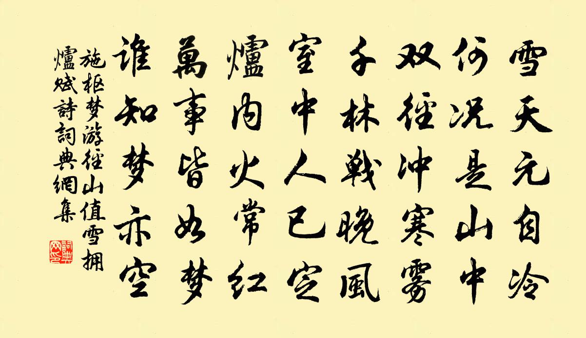 詩詞名句歷史字典書法欣賞書法字典國語詞典說文解字康熙字典古漢語字典標 題 作 者 詩 句 夢遊徑山值雪擁爐賦詩作者:施樞 朝代:宋代夢遊徑山值雪擁爐賦詩原文雪天元自冷,何況是山中。雙徑沖寒霧,千林戰晚風。室中人已定,爐內火常紅。萬事皆如夢,誰知夢亦空。詩詞問答問:夢遊徑山值雪擁爐賦詩的作者是誰?答:施樞問:夢遊徑山值雪擁爐賦詩寫於哪個朝代?答:宋代施樞夢遊徑山值雪擁爐賦詩書法欣賞夢遊徑山值雪擁爐賦詩書法作品詩詞推薦病中有懷吳泳〔宋代〕二年多病少佳懷,酒落杯中見影猜。青女降霜溪屋冷,白姑記日命宮災。柳州解崇崇頻作,孫子逐痁痁轉來。就使三月三十日丘葵〔宋代〕盎盎天地春,萬物日和煦。雲胡生五穀,不若草木數。天地一小變,六龍不行雨。東皇詎忍歸,田間已焦土。□□成都運司西園亭詩翠錦亭許將〔宋代〕闌乾竇溜長,窈窱空埃靜。修林密總翠,盡得錦城景。雲舒青青色,風散騷騷影。未為夜行人,共此晝夜永。依韻和吳正仲赤目見寄梅堯臣〔宋代〕尋常不病眼,青白看人多。暫見朱成碧,難逢扁與和。金篦舊說在,訶子古方磨。我自苦風痹,思君那得過。秋夜讀書有感陸游〔宋代〕久病畏長夏,枕簟如炮焚。扶持賴藥物,俛仰秋已分。清夜炷爐香,裊裊起孤雲。靈府豁蒙滯,舊學資鉏耘。言念答吳王上將顧處微詩陸雲〔魏晉〕一邈矣大昧。造化明明。物以曲全。人以直生。類聚百族。羣分萬形。員淵挺隋。方川吐瓊。二藹藹洪族。天祿攸偈頌一百零二首釋慧遠〔宋代〕庵內不知庵外事,鐵額銅頭不相似。定花板上打秋韃,猛虎舌頭書卍字。予以四韻記陸大夫三高圖自謂能省句矣後作絕晁說之〔宋代〕馬解馱經度碧空,便令王許伴支公。山童野仆立如石,忘卻儂曾在會中。折楊柳楊巨源〔唐代〕水邊楊柳麴塵絲,立馬煩君折一枝。惟有春風最相惜,殷勤更向手中吹。同儲十二洛陽道中作孟浩然〔唐代〕珠彈繁華子,金羈遊俠人。酒酣白日暮,走馬入紅塵。薌林五十詠碧蘆淙楊萬里〔宋代〕春筍肥堪菜,秋花暖可氈。何須雙野鴨,屏上五湖天。題西白山觀雪釋仲皎〔宋代〕西白名山處,那堪踏雪觀。四圍銀世界,一色玉峰巒。夜色和天冷,清輝放月寒。溪梅初一二,著意為渠看。唐雎說信陵君佚名〔先秦〕信陵君殺晉鄙,救邯鄲,破秦人,存趙國,趙王自郊迎。 唐雎謂信陵君曰:“臣聞之曰:事有不可知者,有不漢宮春佚名〔宋代〕四舞階蓂,花朝節後,二月陽春。觀音降誕,當年對此良辰。誰知好日,固多同、重現前身。已壯門楣全四德,富萬年春王吉昌〔元代〕浩氣流行,綿綿擁簇真禪定。頤神興。杳冥難醒。凝結玄黃孕。造化圓空,剔透靈台瑩。能常應。木童形勝。穩步劉梧州挽章呂祖謙〔宋代〕駟馬高車照路光,幡然改轍興何長。空山猿鶴驚無恙,同社雞豚樂未央。祗見歲華來冉冉,不知耆舊去堂堂。北邙題公震小景晁說之〔宋代〕萬古興亡歸白鷺,一時舒慘在青山。與君都下太平日,豈料思君鼙鼓間。無夢令 贈安靜散人馬鈺〔元代〕欲要病源除削。便把塵緣拈卻。心上去憂愁,性內真歡真樂。真樂。真樂。此者仙家一著。金陵雪中劉過〔宋代〕風幻寒威夜撲人,曉看雲腳四垂陰。牧羝塞上功名淚,騎馬藍關竄逐心。冷麵不春愁菀結,凍須如鐵恐蕭森。書爐城東宴楊維楨〔元代〕青驄轡,金牛車,一時賓從高陽徒。城東邸第三四區,天氣淡盪春三初,主人愛客傾中廚。卜歡不知清夜徂,絹纓名句推薦君子進德修業。忠信所以進德也。修辭立其誠,所以居業也。佚名《易傳·文言傳·乾文言》 黃葉古祠寒雨積,清山荒冢白雲多。于謙《岳忠武王祠》 斜日更穿簾幕,微涼漸入梧桐。晏殊《破陣子·燕子欲歸時節》 飛花兩岸照船紅,百里榆堤半日風。陳與義《襄邑道中》 別來春半,觸目柔腸斷。李煜《清平樂·別來春半》 竹疏虛檻靜,松密醮壇陰。張泌《女冠子·露花菸草》 轡搖銜鐵。蹴踏平原雪。張炎《清平樂·平原放馬》 人者多欲,其性尚私。來俊臣《羅織經·閱人卷第一》 芳菲歇去何須恨,夏木陰陰正可人。秦觀《三月晦日偶題》 拜華星之墜幾,約明月之浮槎。文天祥《回董提舉中秋請宴啟》