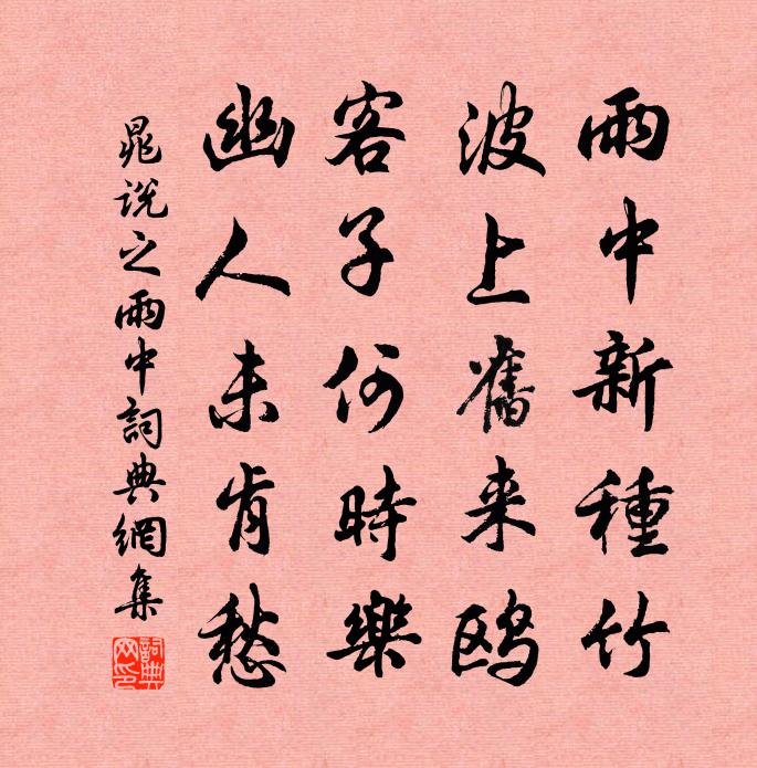 詩詞名句歷史字典書法欣賞書法字典國語詞典說文解字康熙字典古漢語字典標 題 作 者 詩 句 雨中作者:晁說之 朝代:宋代雨中原文雨中新種竹,波上舊來鷗。客子何時樂,幽人未肯愁。詩詞問答問:雨中的作者是誰?答:晁說之問:雨中寫於哪個朝代?答:宋代晁說之雨中書法欣賞雨中書法作品詩詞推薦上巳日祓禊渭濱應制韋嗣立〔唐代〕乘春祓禊逐風光,扈蹕陪鑾渭渚傍。還笑當時水濱老,衰年八十待文王。極相思(贈張浩)李氏〔宋代〕日紅疏翠密晴暄。初夏困人天。風流滋味,傷懷盡在,花下風前。後約已知君定,這心緒、盡日懸懸。鴛鴦兩處,再來常州昭禮出示虞山往來詩卷先是昭禮與予趙蕃〔宋代〕舟人厭牽挽,我輩樂縈紆。晨起愁分背,逢人屢問塗。看君著屐進,雅勝折腰趨。此段真高邁,詩中不可無。有感葛立方〔宋代〕但知鬼目為芝草,誰信羚羊破佛牙。娘子阿姨何處辨,時人識賣假金家。次王正之提刑韻,謝袁起岩知府送茉莉二檻范成大〔宋代〕千里移根自海隅,風颿破浪走天吳。散花忽到毗耶室,似欲橫機試病夫。燕寢香中暑氣清,更煩雲鬢插瓊英。明妝一落索仇遠〔宋代〕盡日西闌憑醉。新寒難睡。袖爐煙冷帳雲寬,倩倩倩、先溫被。空對短屏山水。清清無寐。卻思十里小紅樓,應不傅推官勸農七絕句擬和其五勸農回鄭剛中〔宋代〕五馬蕭蕭不醉歸,祗人阡陌卷旌旗。今朝故為勸農出,未與諸君泛酒池。杞梁墓汪遵〔唐代〕一叫長城萬仞摧,杞梁遺骨逐妻回。南鄰北里皆孀婦,誰解堅心繼此來。落花黎廷瑞〔宋代〕紅雪霏霏入燕泥,朝來猶是可憐枝。春風葵麥玄都觀,可是劉郎見事遲。相和歌辭。從軍行駱賓王〔唐代〕平生一顧念,意氣溢三軍。野日分戈影,天星合劍文。弓弦抱漢月,馬足踐胡塵。不求生入塞,唯當死報君。春秋戰國門靈輒周曇〔唐代〕失水枯鱗得再生,翳桑無地謝深情。朱輪未染酬恩血,公子何由見赤誠。洛陽道任翻〔唐代〕憧憧洛陽道,塵下生春草。行者豈無家,無人在家老。雞鳴前結束,爭去恐不早。百年路傍盡,白日車中曉。求富喜雨白居易〔唐代〕圃旱憂葵堇,農旱憂禾菽。人各有所私,我旱憂松竹。松乾竹焦死,眷眷在心目。灑葉溉其根,汲水勞僮僕。油雲即事劉應時〔宋代〕暖雲芳草媚晴川,花正嬌春柳欲眠。老景侵尋生事拙,舊巢歸燕自相憐。木蘭花慢 端午發鬆江張野〔元代〕恨無情畫舸,載離思,各西東。正佳節驚心,故人回首,應念匆匆。殷勤彩絲系臂,問如何、不系片帆風。醉里陽邕州陶弼〔宋代〕漢節護諸蠻,徘徊瘴癘間。少希銅馬式,老厭玉門關。次韻吳心機楊簡〔宋代〕洪範論時常,心官職雨暘。分龍何效竭,負扆久憂傷。禾槁幾於白,苗蘇尚可蒼。焦勞殊未已,詔旨欲盈箱。服椒法歌陳曄〔宋代〕青城山老人,服椒得妙訣。年過九十餘,貌不類期耋。再拜而請之,忻然為我說。蜀椒貳斤淨,解鹽六兩潔。糝鹽眠睡晁說之〔宋代〕病夫不睡情須怨,老子難眠思卻清。況復斗橫催角引,梅花爛熳散秋聲。錦標歸(待雪)曹勛〔宋代〕風攪長空,冷入寒雲,正是嚴凝初至。圍爐坐久,珠簾捲起,準擬六花飛砌。漸苒苒晴煙,更暗覺、遠天開霽。阻名句推薦法不阿貴,繩不撓曲。韓非及後人《韓非子·有度》 離情被橫笛,吹過亂山東。王安石《江上》 怒不過奪,喜不過予。荀子《荀子·修身》 晨興理荒穢,帶月荷鋤歸。陶淵明《歸園田居·其三》 不知馬骨傷寒水,惟見龍城起暮雲。王涯《塞下曲二首·其二》 無限枝頭好顏色,可憐開不為重陽。丘浚《詠菊》 衰楊古柳,幾經攀折,憔悴楚宮腰柳永《少年游·參差煙樹灞陵橋》 轅門菊酒生豪興,雁塞風雲愜壯遊。王瓊《九日登花馬池城》 詩成自寫紅葉,和恨寄東流。晏幾道《訴衷情·憑觴靜憶去年秋》 親賢臣,遠小人。諸葛亮《出師表/前出師表》