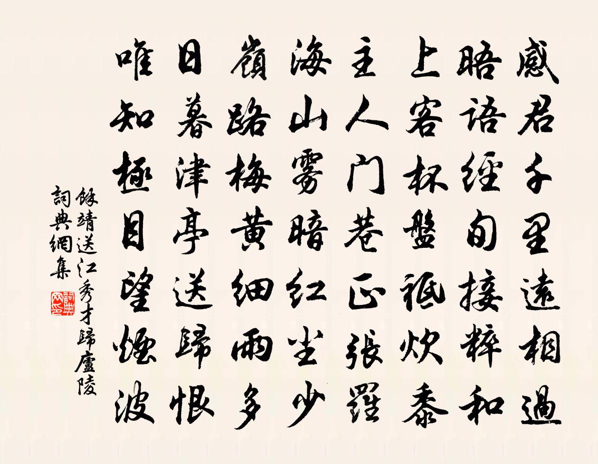 詩詞名句歷史字典書法欣賞書法字典國語詞典說文解字康熙字典古漢語字典標 題 作 者 詩 句 送江秀才歸廬陵作者:余靖 朝代:宋代送江秀才歸廬陵原文感君千里遠相過,晤語經旬接粹和。上客杯盤祗炊黍,主人門巷正張羅。海山霧暗紅塵少,嶺路梅黃細雨多。日暮津亭送歸恨,唯知極目望煙波。詩詞問答問:送江秀才歸廬陵的作者是誰?答:余靖問:送江秀才歸廬陵寫於哪個朝代?答:宋代余靖送江秀才歸廬陵書法欣賞送江秀才歸廬陵書法作品詩詞推薦視旱憩鏡田店楊萬里〔宋代〕走檄堪頻捧,嚴程敢少徐。雖晴恐非久,猶熱未全無。憩息翻增倦,馳驅減壯圖。詩成兼利害,失悶得清臞。白龍寺徐網〔宋代〕萬木梢頭見塔尖,道人於此卜幽潛。深林六月風敲竹,古寺三更月入龕。天旱蛟龍藏窟宅,水枯魚鱉露須髯。我來次韻子瞻贈梁交左藏蘇轍〔宋代〕彭城熊欲往台無熊檄,初喜熊東西合為一。將軍走馬隨春風,精銳千人森尺籍。口占佳句驚眾坐,手練強兵試鳴鏑句陳貫道〔宋代〕人間正作雲霓望,天半忽驚霖雨來。竹下范成大〔宋代〕松杉晨氣清,桑柘暑陰薄。稻穗黃欲臥,槿花紅未落。秋鶯尚嬌奼,晚蝶成飄泊。犬騃逐車馬,雞驚撲籬落。道逢奉和幸韋嗣立山莊侍宴應制劉憲〔唐代〕東山琴有謝安,琴枉道降鳴琴鑾。緹騎分初日,霓旌度曉寒。雲蹕岩間下,虹橋澗底盤。幽棲俄以屆,聖矚宛餘歡贈筆工沈秀榮仇遠〔宋代〕吾家歙石鋒芒出,不但挫墨亦挫筆。老懶作事苦不多,一筆才供兩三日。近知沈子藝希有,洗擇圓齊易入手。不論慈聖光獻皇后輓辭七首蘇頌〔宋代〕亭構依然揭大椿,宮闈無復駐飈輪。清衷念切承顏日,長樂悲深奉質辰。六御驂騑開道路,五陵松柏慘風塵。周南沁園春李道純〔元代〕得遇真傳,便知下手,成功不難。得癸生之際,抽鉛添汞,火休太燥,水莫令寒。鼓動巽風,扇開爐*,武煉方烹卜運算元歐陽修〔宋代〕極得醉中眠,迤邐翻成病。莫是前生負你來,今世里、教孤冷。言約全無定。是誰先薄倖。不慣孤眠慣成雙,奈奴泊定海夜哭李鄴嗣〔清代〕我實愁來此,荒荒天地昏。悲風嘶虎石,毅鬼立蛟門。國史千年寄,臣心一日論。關河戎馬在,何地可招魂?賈天錫惠寶薰乞詩多以兵衛森畫戟燕寢凝清香黃庭堅〔宋代〕衣篝麗紈綺,有待乃芬芳。當念真富貴,自薰知見香。園蔬十詠子姜劉子翬〔宋代〕新芽肌理膩,映日淨如空。恰似勻妝指,柔尖帶淺紅。暑雨後散策楊萬里〔宋代〕溪南稻紫似溪北,雨後山青非雨前。芒屨泥深涼不淺,今年六月個般天。和友人喜相遇十首李鹹用〔唐代〕為儒自愧已多年,文賦歌詩路不專。肯信披沙難見寶,只憐苫草易成編。燕昭寤寐常求駿,郭隗尋思未是賢。且固中秋月色甚佳病不及觀李流謙〔宋代〕斲月如冰輪,不知幾玉斧。寒光十萬里,余影到牖戶。我病欲強出,瘦骨怯風露。技癢時不禁,窗隙窺皓素。年年和武平學士歲晚禁直書懷五言二十韻歐陽修〔宋代〕多病淹殘歲,初寒臥直廬。朝廷務清靜,鈴索少文書。向學今為盛,優賢古莫如。靚深嚴禁署,閒宴樂群居。賜馬楊梅塢楊蟠〔宋代〕夏日紅相照,天晴塢自開。襄陽多稚子,摘贈故人來。題淮陰侯廟十首邵雍〔宋代〕韓信恃功前慮寡,漢皇負德尚權安。幽囚必欲擒來斬,固要加諸甚不難。惠山張蘊〔宋代〕石苔滑汰屋連斜,第二泉邊古佛家。一壑松風聽不了,卻留僧坐自煎茶。名句推薦波漂菰米沉雲黑,露冷蓮房墜粉紅杜甫《秋興八首》 微雨過,小荷翻。榴花開欲然。蘇軾《阮郎歸·初夏》 山高月小,水落石出。蘇軾《後赤壁賦》 學是一個尋常的家飯,當隨事而警惕。洪應明《菜根譚·概論》 漫惹爐煙雙袖紫,空將酒暈一衫青。納蘭性德《浣溪沙·伏雨朝寒愁不勝》 信宿漁人還泛泛,清秋燕子故飛飛。杜甫《秋興八首》 雲拼欲下星斗動,天樂一聲肌骨寒。劉禹錫《八月十五夜桃源玩月》 錦江近西煙水綠,新雨山頭荔枝熟。張籍《成都曲》 儒以文亂法,俠以武犯禁。韓非及後人《韓非子·五蠹》 兵務 神速,事貴合機。令狐德棻《周書·列傳·卷二十五》