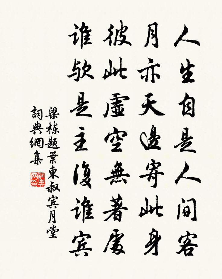 詩詞名句歷史字典書法欣賞書法字典國語詞典說文解字康熙字典古漢語字典標 題 作 者 詩 句 題葉東叔賓月堂作者:梁棟 朝代:宋代題葉東叔賓月堂原文人生自是人間客,月亦天邊寄此身。彼此虛空無著處,誰歟是主復誰賓。詩詞問答問:題葉東叔賓月堂的作者是誰?答:梁棟問:題葉東叔賓月堂寫於哪個朝代?答:宋代梁棟題葉東叔賓月堂書法欣賞題葉東叔賓月堂書法作品詩詞推薦君馬黃李白〔唐代〕君馬黃,我馬白。馬色雖不同,人心本無隔。共作遊冶盤,雙行洛陽陌。長劍既照曜,高冠何赩赫。各有千金裘,山莊勸酒張輯〔宋代〕清吟湘碧。馬首春風驛。聞說西湖梅早,又邀我、能詩客。書尺知到日。月隨人合璧。兒擬山莊勸酒,田家釀,盡山中桂雍裕之〔唐代〕八樹拂丹霄,四時青不凋。秋風何處起,先裊最長條。希年初度老友王希宣扁舟遠訪夙誼甚厚貺以十牟巘五〔宋代〕行年似啟期,顏發日夜改。此身尚我累,橡栗時自采。龍湫歌陸游〔宋代〕環湫巨木老不花,奫淪千尺龍所家。爪痕入木欲數寸,觀者心掉不敢嘩。去年大旱綿千里,禾不立苗麥垂死。林神乾明節祝聖壽四錫〔宋代〕漢家台榭與天通,甲觀蒼蒼紫氣中。佳節夜來宣受賀,壽杯朝進祝延洪。管弦嘈囋驚花發,風日晴和向雪融。宴次陸川尉吳子實死於李接之難曾豐〔宋代〕螻蟻仆臣命,乾坤君父恩。難於忘所本,可以喪其元。生素幾何字,殺青如許言。彼雖速亡我,我故自存存。寄統陸游〔宋代〕大兒挈藥囊,小兒負書笈。共作蘭亭游,詎必群賢集。言此二十年,白首終未踐。汝復守荊扉,經年不相見。楚越琵琶行 / 琵琶引白居易〔唐代〕元和十年,予左遷九江郡司馬。明年秋,送客湓浦口,聞舟中夜彈琵琶者,聽其音,錚錚然有京都聲。問其人,本點絳唇蔡伸〔宋代〕解紱朝天,滿城桃李繁陰市。彩舟難駐。忍聽驪歌舉。協贊中興,聖意方傾注。從今去。五雲深處。穩步沙堤路。扇陸暢〔唐代〕寶扇持來入禁宮,本教花下動香風。姮娥須逐彩雲降,不可通宵在月中。真戒大師求頌釋正覺〔宋代〕炷香坐羊氈,默默心住禪。仙桂萌兔窟,神珠媚龍淵。湛照自家事,出隨群動緣。應機分手眼,不翅有千千。贈封御史入台蘇味道〔唐代〕故事推三獨,茲辰對兩闈。夕鴉共鳴舞,屈草接芳菲。盛府持清橐,殊章動繡衣。風連台閣起,霜就簡書飛。凜凜寄殷堯藩先輩許渾〔唐代〕十載功名翰墨林,為從知己信浮沈。青山有雪諳松性,碧落無雲稱鶴心。帶月獨歸蕭寺遠,玩花頻醉庾樓深。思君牛頭寺司空圖〔唐代〕終南最佳處,禪誦出青霄。群木澄幽寂,疏煙泛泬寥。偈二首釋禧誧〔宋代〕韶山近日沒巴鼻,眼裡聞聲鼻嘗味。有時一覺到天明,不在床上不落地。 * 浪高魚化龍,痴人猶戽夜塘水。寫懷二首周文璞〔宋代〕往時陸荊門,自是天下雄。徒隸解散盡,何處尋樊翁。遂令一世士,默默逃虛空。至今大堤上,葉葉皆春風。句陶弼〔宋代〕兵堪渡海將軍老,史不占天處士間。賢者之孝二百四十首周紹林同〔宋代〕欲得忠臣者,求之孝子門。如何傅王子,尚復待人言。賀新郎(為德清趙令君賦小垂虹)吳文英〔宋代〕浪影龜紋皺。蘸平煙、青紅半濕,枕溪窗牖。千尺晴霞慵臥水,萬疊羅屏擁繡。漫幾度、吳船回首。歸雁五湖應不名句推薦鵝湖山下稻粱肥,豚柵雞棲半掩扉。王駕《社日》 創業還須深慮,恐貽害於子孫。王永彬《圍爐夜話·第三四則》 賭近盜,淫近殺。馮夢龍《警世通言·卷三十五》 一上高城萬里愁,蒹葭楊柳似汀洲。許渾《鹹陽城東樓 / 鹹陽城西樓晚眺 / 西門》 草木也知愁,韶華竟白頭。曹雪芹《唐多令·柳絮》 與朋友論學,須委曲謙下,寬以居之。王陽明《傳習錄·卷下·門人陳九川錄》 嘆寄與路遙,夜雪初積。姜夔《暗香疏影》 風雨淒淒,雞鳴喈喈。佚名《風雨》 為當時曾寫榴裙,傷心紅綃褪萼。吳文英《澡蘭香·林鐘羽淮安重午》 三五年時三五月,可憐杯酒不曾消。黃景仁《綺懷》