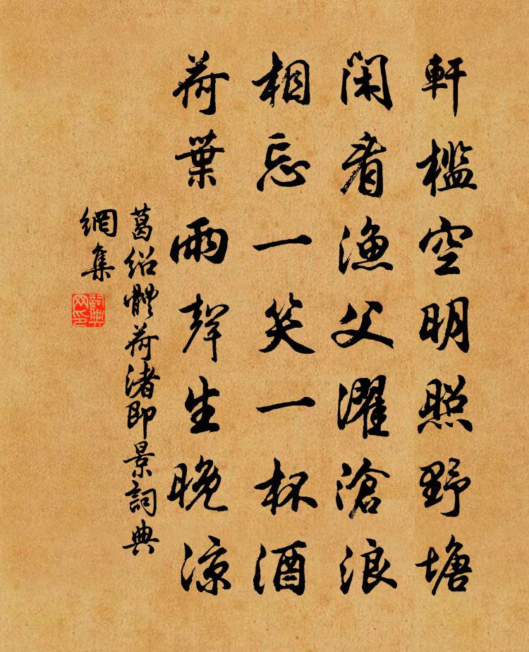 詩詞名句歷史字典書法欣賞書法字典國語詞典說文解字康熙字典古漢語字典標 題 作 者 詩 句 荷渚即景作者:葛紹體 朝代:宋代荷渚即景原文軒檻空明照野塘,閒看漁父濯滄浪。相忘一笑一杯酒,荷葉雨聲生晚涼。詩詞問答問:荷渚即景的作者是誰?答:葛紹體問:荷渚即景寫於哪個朝代?答:宋代葛紹體荷渚即景書法欣賞荷渚即景書法作品詩詞推薦池蓮詠倪瓚〔元代〕迴翔波間風,的歷葉上露。清池結素彩,華月映微步。雲陰花房斂,雨歇芳氣度。欲去拾明璫,踟躕惜遲暮。寄永叔石介〔宋代〕九龍行雨歲在子,皇天之命實勤止。泓湫水暖嗜欲飽,七龍嬉戲兩龍睡。卷藏密雲空自膏,畜聚甘雨不肯施。旱魃六叔母生日項安世〔宋代〕千歲光陰二十停,一停才向此時盈。律筒又報三陽近,歷草還飛四莢輕。冉冉春盤行細綠,泠泠臘琖瀉空清。不須送進士高樞拱辰石介〔宋代〕韓門有李漢,柳氏得晦之。其道卒無患,二子為藩離。吾才誠駑弱,十年空孜孜。韓閫與柳閾,豈敢輒潛窺。二氏大滌山王宗賢〔宋代〕穹崇千尺壓群巒,終日登臨興未闌。佳趣清幽塵自滌,升天猶有許君壇。海棠薛能〔唐代〕酷烈復離披,玄功莫我知。青苔浮落處,暮柳間開時。帶醉遊人插,連陰被叟移。晨前清露濕,晏後惡風吹。香少偈頌十三首釋智遇〔宋代〕華亭滿船猶不足,南泉驟步蹈不著。自余眼底紛,總見月忘指。至豐城懷溫叟叔異南秀欲題之叔異曲江磯之庵趙蕃〔宋代〕浩浩寒流急,蕭蕭落木高。江山故雙劍,人物欠三豪。客意已愁絕,風聲仍怒號。相思意無極,佇立首頻搔。和史侍郎游澹岩韻六首曾協〔宋代〕隱士洪崖可拍肩,尚留陳跡此山巔。祗應千古人如在,陵谷高深卻變遷。送鄭尚書赴南海韓愈〔唐代〕番禺軍府盛,欲說暫停杯。蓋海旂幢出,連天觀閣開。衙時龍戶集,上日馬人來。風靜鶢鶋去,官廉蚌蛤回。貨通感事楊時〔宋代〕權門車馬日紛紛,寂寞多應笑子云。玄白定知非世尚,解嘲那復強云云。如夢令王哲〔元代〕如知九九妙中談。明月分明照碧潭。會得雙關真箇理,前三三與後三升仙橋汪遵〔唐代〕題橋貴欲露先誠,此日人皆笑率情。應訝臨邛沽酒客,逢時還作漢公卿。頌十玄談還源釋印肅〔宋代〕明月堂前枯梅華,太陽門下雪交加。寶樓閣裹多怪敗,達哩摩尼吽{左口右發}吒。蕃女怨溫庭筠〔唐代〕萬枝香雪開已遍,細雨雙燕。鈿蟬箏,金雀扇,畫梁相見。雁門訊息不歸來,又飛回。初過大散關馬上作石介〔宋代〕柰何山色牽吟思,旋被江聲破睡魔。吟思睡魔兩相戰,誰知馬上有干戈。上冬日田園雜興十二絕自晨至午,起居飲食皆范成大〔宋代〕起傍東窗手把書,華顛種種不禁梳。朝餐欲到須巾裹,已有重來晚市魚。次韻歐陽全真過玉山見寄趙蕃〔宋代〕只道歐陽子,行飛入道山。報來猶佐幕,書至得開顏。過我不相見,底忙成往還。未知重回日,端復幾年間。南柯子/南歌子陳三聘〔宋代〕別後驚人遠,歸心怯櫓柔。晚天涼思冷於秋。冷浸一溪明月、水彌流。醉里狂仍在,吟餘趣極幽。夜深何用數更籌木圍曾極〔宋代〕寢殿重重設木圍,崎嶇天位不勝危。高人巢許應知此,占得箕山最坦夷。名句推薦縱浪大化中,不喜亦不懼。陶淵明《形影神三首》 長風蕭蕭渡水來,歸雁連連映天沒。盧思道《從軍行》 隋堤上、曾見幾番,拂水飄綿送行色。周邦彥《蘭陵王·柳》 花明玉關雪,葉暖金窗煙。李白《折楊柳》 庭中有奇樹,綠葉發華滋。佚名《庭中有奇樹》 相逢喚醒京華夢,吳塵暗斑吟發。詹玉《齊天樂·送童瓮天兵後歸杭》 自見者不明;自是者不彰老子《老子·道經·第二十四章》 人而無信,不知其可也。孔子弟子《論語·為政篇》 別路琴聲斷,秋山猿鳥吟。盧照鄰《送梓州高參軍還京》 志忍私,然後能公;行忍情性,然後能修荀子《荀子·儒效》