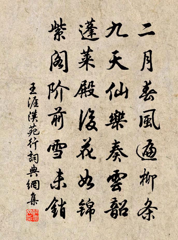 詩詞名句歷史字典書法欣賞書法字典國語詞典說文解字康熙字典古漢語字典標 題 作 者 詩 句 漢苑行作者:王涯 朝代:唐代漢苑行原文二月春風遍柳條,九天仙樂奏雲韶。蓬萊殿後花如錦,紫閣階前雪未銷。詩詞問答問:漢苑行的作者是誰?答:王涯問:漢苑行寫於哪個朝代?答:唐代問:漢苑行是什麼體裁?答:七絕王涯漢苑行書法欣賞漢苑行書法作品注釋全唐詩:卷346-19詩詞推薦閘柱袁說友〔宋代〕三丈圍寬兩木靈,千年閘骨狀如城。揚帆欲過心先動,擊柱才聞念已驚。東越梅梁猶逞異,南城老樹也為精。昔聞泛湖歸出樓中翫月五言謝惠連〔南北朝〕日落泛澄瀛,星羅游輕橈。憩榭面曲汜,臨流對回潮。輟策共駢筵,並坐相招要。哀鴻鳴沙渚,悲猨響山椒。亭亭送趙明叔分教潮陽胡仲弓〔宋代〕昌黎遺俗在,興教更煩君。地產無名木,春生半水芹。詩歌麟趾化,筆補鱷魚文。莫厭官氈冷,相期粉省芸。臨江仙蘇庠〔宋代〕獵獵風蒲初暑過,蕭然庭戶秋清。野航渡口帶煙橫。晚山千萬疊,別鶴兩三聲。秋水芙蓉聊盪槳,一樽同破愁城。贈蔡道人王之道〔宋代〕寶蓋山前蔡道人,十年學佛頗安貧。似聞親覓天衣老,為改令名作惠新。呈茅一霽先生黃庚〔宋代〕前輩凋零盡,如公尚典型。為僧眉獨白,見客眼長青。教子成三俊,傳家有六經。我來問奇字,應許扣柴扃。黃魯直食麵帖贊岳珂〔宋代〕山谷書法,本於天才。變而成家,如萬壑崖。骨瘦氣清,霜寒籟哀。故其言曰,法安出哉。我師我心,奚彼之儕。余在北門時每立春必前索宮中春詞十餘解今逢宋祁〔宋代〕漢宮節物重年華,寶勝迎春綽綽斜。不待東風吹煦力,剪刀催出上林花。自和李曾伯〔宋代〕老態龍鍾雪滿頭,黃花招我對清秋。東籬幸可安吾土,南服何堪典此州。莫憶風巾游漢渚,早呼雨笠訪滄洲。明年偈頌一百三十六首釋惟一〔宋代〕這裡如大火聚,近之則燎卻面門。直饒佛到來,未免退身有分。無夢令尹志平〔元代〕說破勞生如夢。個個昏迷虛夢。默地悟心開,達了真通清夢。清夢。清夢。誰信真人無夢。滿江紅黃機〔宋代〕萬灶貔貅,便直欲、掃清關洛。長淮路、夜亭警燧,曉營吹角。綠鬢將軍思飲馬,黃頭奴子驚聞鶴。想中原、父老九月於東逢雪李商隱〔唐代〕舉家忻共報,秋雪墮前峰。嶺外他年憶,於東此日逢。粒輕還自亂,花薄未成重。豈是驚離鬢,應來洗病容。漁村林太淵相訪劉克莊〔宋代〕不但親傳亦鮑參,妙年青乃過於藍。一斑昔已窺而見,三顧吾何德以堪。之子鳳兮真有種,汝曹犢耳可無慚。自嫌張工部輓詞樓鑰〔宋代〕敕局同寅舊,雌堂屢肯過。故人今有幾,朝士更無多。問信書猶濕,相望鬢已皤。忽聞埋璧痛,薤露不成歌。句李白〔唐代〕竹粉千腰白,桃皮半頰紅。山居即事釋紹嵩〔宋代〕獨立柴荊外,孤吟四望頻。晴山雲罨畫,深谷鳥聲春。老覺文章退,閒知氣味真。窮居那敢恨,虛白自為鄰。雜曲歌辭。妾薄命武平一〔唐代〕有女妖且麗,裴回湘水湄。水湄蘭杜芳,采之將寄誰。瓠犀發皓齒,雙蛾顰翠眉。紅臉如開蓮,素膚若凝脂。綽約崧高詩為九江趙使君壽楊冠卿〔宋代〕黍稷彧彧,去其螟螣。實維豐年,我庾維億。送林宗丞浙東議幕樓鑰〔宋代〕先生風骨天與清,孤松野鶴何瘦生。胸中落落笥五經,大篇短章筆縱橫。壯年文場諸老驚,俯仰世故雙鬢星。萬事名句推薦花門樓前見秋草,豈能貧賤相看老。岑參《涼州館中與諸判官夜集》 報導先生歸也,杏花春雨江南。虞集《風入松·寄柯敬仲》 玉門山嶂幾千重,山北山南總是烽。王昌齡《從軍行七首》 只匆匆眺遠,早覺閒愁掛喬木。史達祖《八歸·秋江帶雨》 月下飛天鏡,雲生結海樓。李白《渡荊門送別》 翠鈿曉寒輕,獨倚鞦韆無力。楊冠卿《如夢令·滿院落花春寂》 騎牛遠遠過前村,短笛橫吹隔隴聞。黃庭堅《牧童詩》 尿泡雖大無斤兩,秤鉈雖小壓千斤。吳承恩《西遊記·第三十一回》 渡頭餘落日,墟里上孤煙。王維《輞川閒居贈裴秀才迪》 高齋今夜雨,獨臥武昌城。徐禎卿《在武昌作》