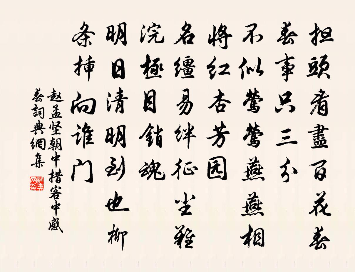 詩詞名句歷史字典書法欣賞書法字典國語詞典說文解字康熙字典古漢語字典標 題 作 者 詩 句 朝中措(客中感春)作者:趙孟堅 朝代:宋代朝中措(客中感春)原文擔頭看盡百花春。春事只三分。不似鶯鶯燕燕,相將紅杏芳園。名韁易絆,征塵難浣,極目銷魂。明日清明到也,柳條插向誰門。詩詞問答問:朝中措(客中感春)的作者是誰?答:趙孟堅問:朝中措(客中感春)寫於哪個朝代?答:宋代問:朝中措(客中感春)是什麼體裁?答:詞趙孟堅朝中措(客中感春)書法欣賞朝中措(客中感春)書法作品詩詞推薦和黃龍清老三首蘇軾〔宋代〕騎驢覓驢真可笑,以馬喻馬亦成痴。一天月色為誰好,二老風流各自知。百步洪二首蘇軾〔宋代〕佳人未肯回秋波,幼輿欲語防飛梭。輕舟弄水買一笑,醉中盪槳肩相摩。不學長安閭里俠,貂裘夜走胭脂坡。獨將登白雲亭元結〔唐代〕出門見南山,喜逐松逕行。窮高欲極遠,始到白雲亭。長山繞井邑,登望宜新晴。州渚曲湘水,縈迴隨郡城。九疑頌古十六首釋道寧〔宋代〕前箭猶輕後箭深,行人何事苦沉吟。翻身若解看方便,始信真鍮不博金。題指南軒二絕胡寅〔宋代〕老屋蕭疎四五椽,瓦爐時冷斷諸緣。客來若問名軒意,莫似維摩但默然。淮南王胡宿〔唐代〕貪鑄金錢盜寫符,何曾七國戒前車。長生不待爐中藥,鴻寶誰收篋里書。碧井床空天影在,小山人去桂叢疏。雲中田舍即事十首劉克莊〔宋代〕小榭無丹雘,低牆略塈茨。辛勤趨穡事,快活過花時。懶獻嘉禾頌,閒賡滯穗詩。幸生太平世,不樂復何為。寄酬盧侍御姚合〔唐代〕詩新得意恣狂疏,揮手終朝力有餘。今到詩家渾手戰,欲題名字倩人書。秋懷曹勛〔宋代〕胡騎連年頗內侵,胡塵漠漠翳高深。何當固趙如頗牧,遂佐興宛破邑尋。尚想鼓旗延大敵,要須風鶴有餘音。秋高挽蕭知縣二首陳淳〔宋代〕早擢儒科秀,旋驅仕路榮。平反東廣幕,撫字桂陽城。選調方優脫,朝階自坦行。如何中道處,遽爾輟千旌。贈南嶽馮處士二首曹唐〔唐代〕白石溪邊自結廬,風泉滿院稱幽居。鳥啼深樹劚靈藥,花落閒窗看道書。煙嵐晚過鹿裘濕,水月夜明山舍虛。支頤和松坡劉迂詩四首廖行之〔宋代〕平生湖海敝貂裘,一笑周南底滯留。豪放不妨詩李白,崢嶸何意吏朱游,悠悠世上難窮事,落落胸中肯著愁。高興庚子元日方回〔宋代〕臘天何故燠於春,恐為衣單念小民。略見雪才餘一寸,叵堪雨卻過三旬。野中薺麥不勝旺,市上杏桃無數新。白盡謁金門(詠木樨)曹勛〔宋代〕香乍起。滿院垂垂岩桂。未卷珠簾香已至。酒杯言笑里。葉下茸金繁蕊。別是清妍風致。更遠隨人聞細細。月華天晚登橫溪閣陸游〔宋代〕樓鼓聲中日又斜,憑高愈覺在天涯。空桑客土生秋草,野渡虛舟集晚鴉。瘴霧不開連六詔,俚歌相答帶三巴。故鄉翩翩水中舟王令〔宋代〕翩翩水中舟,既滿何用載。主舟者誰子,無乃忽於敗。兼濟雖期仁,過任適為害。自是人致然,已溺何足怪。南園雜詠清風亭陳宓〔宋代〕薰爐驅俗氛,茗碗破塵慮。披襟六月涼,乘此欲歸去。王氏山居鄒登龍〔宋代〕聞道山居好,林深遠俗情。茶煙燻壁暗,蘿月射窗明。學稼修禾譜,栽花識藥名。無人覺幽隱,為有讀書聲。水調歌頭 雪梅 以上丁藏鈔本續軒渠集卷九詞洪希文〔元代〕崖谷搖落盡,銀海眩花生。霏霏漾漾,閉門三日斷行人。我欲尋幽無路,但見砌平凹凸,粲粲盡堆瓊。片片勻如翦郊野鄭谷〔唐代〕蓼水菊籬邊,新晴有亂蟬。秋光終寂寞,晚醉自留連。野濕禾中露,村閒社後天。題詩滿紅葉,何必浣花箋?名句推薦櫪馬苦踡跼,籠禽念遐征。張九齡《秋晚登樓望南江入始興郡路》 淡雲孤雁遠,寒日暮天紅。徐昌圖《臨江仙·飲散離亭西去》 行多有病住無糧,萬里還鄉未到鄉。盧綸《逢病軍人》 一軌九州,同風天下房玄齡《晉書·載記·第十三章》 過雨西風,數葉井梧愁舞。吳文英《荔枝香近·七夕》 山驛淒涼,燈昏人獨寢。陸游《清商怨·葭萌驛作》 休別有魚處,莫戀淺灘頭。佚名《增廣賢文·上集》 數樹梨花,晚風吹墮半汀鷺。吳文英《齊天樂·新煙初試花如夢》 青山如黛遠村東,嫩綠長溪柳絮風。高珩《春日雜詠》 三百年間同曉夢,鐘山何處有龍盤。李商隱《詠史二首·其一》