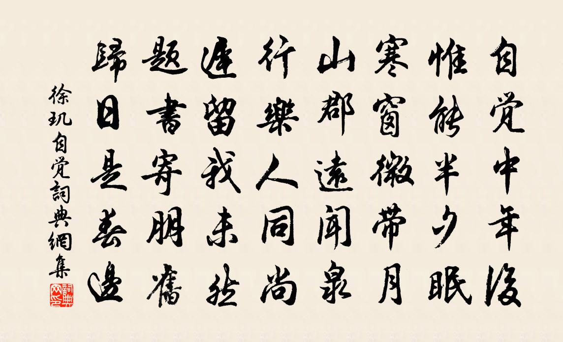 詩詞名句歷史字典書法欣賞書法字典國語詞典說文解字康熙字典古漢語字典標 題 作 者 詩 句 自覺作者:徐璣 朝代:宋代自覺原文自覺中年後,惟能半夕眠。寒窗微帶月,山郡遠聞泉。行樂人同尚,遲留我未然。題書寄朋舊,歸日是春邊。詩詞問答問:自覺的作者是誰?答:徐璣問:自覺寫於哪個朝代?答:宋代徐璣自覺書法欣賞自覺書法作品詩詞推薦古風其四李白〔唐代〕鳳飛九千仞。五章備彩珍。銜書且虛歸。空入周與秦。橫絕歷四海。所居未得鄰。吾營紫河車。千載落風塵。藥物張儀樓岑參〔唐代〕傳是秦時樓,巍巍至今在。樓面兩江水,千古長不改。曾聞昔時人,歲月不相待。題宓庵壁王洋〔宋代〕西風吹徹菊花黃,喚我東籬泛一觴。白髮插花休笑我,年年汝亦負重陽。和仲連兄城上晚步韓維〔宋代〕久積端居滯,聊為散步游。青苔跳怒黽,綠樹矯鳴鳩。雨暗橫舟浦,涼生調角樓。不妨乘晚興,更盡水西頭。滿禪人畫臨濟像請贊釋曇華〔宋代〕臨濟禿,無眼目,討便宜兮不知足。高懸羊頭賣狗肉,秤頭斤兩惜如玉。胸中更有一般毒,天下無人敢輕觸。乾德以後祀感生帝十首佚名〔宋代〕籩豆有踐,玉帛斯陳。神無常享,享於精線。次韻陳融甫支鹽年家見贈二首范成大〔宋代〕乃翁一經傳,播獲了家事。短檠寓真樂,尺璧豈良貴。年家有寧馨,令我喜無寐。加鞭翰墨場,一躍群空冀。二疊劉克莊〔宋代〕漢魏諸賢韻已卑,六朝人物復何為。平生老子羞由徑,不識蟲兒與玉兒。美周都監禱雨驗白玉蟾〔宋代〕旱魃為妖欲請雩,真人問雨幾時無。先將鳳表投金闕,擬向龍潭下鐵符。彈指雷鳴三霹靂,舉頭雲起一須叟。笑將次韻張問給事喜雨蘇轍〔宋代〕已收蠶麥無多日,旋喜山川同一雲。禾黍趁時青覆壠,池塘流潤淥生文。兩宮尚廢清晨集,中禁初消永夜薰。倉粟獨酌罷夜坐陸游〔宋代〕不見麴生久,惠然相與娛。安能論斗石,僅可具盤盂。聽雨蒙僧衲,挑燈擁地爐。勿生孤寂念,道伴大狸奴。摸魚兒(太湖)李演〔宋代〕又西風、四橋疏柳,驚蟬相對秋語。瓊荷萬笠花雲重,裊裊紅衣如舞。鴻北去。渺岸芷汀芳,幾點斜陽字。吳亭舊對鏡陸游〔宋代〕鏡中衰顏失敷腴,綠鬢已作霜蓬枯,兩肩聳聳似山字,曳杖更有蠻童扶。自驚何以致此老,亟欲修敬問起居;徐徐荔枝二首劉克莊〔宋代〕寂寂南州少物華,有園池處只梅茶。荔枝花發差平等,不問分家富貴家。短歌行子蘭〔唐代〕日月何忙忙,出沒住不得。使我勇壯心,少年如頃刻。人生石火光,通時少於塞。四季倏往來,寒暑變為賊。偷人杏花葛天民〔宋代〕陌上春泥苦未乾,絳唇漸吐不禁寒。海棠尚晚教誰伴,山帽衝風每自看。聲好最憐清曉賣,味甘長紀綠陰團。年年漫成李洪〔宋代〕能安寂寞興何長,自覺無機稱坐忘。一溉成功心尚在,五禽為戲學無方。病來乍怯衣裳裌,秋至新嘗橘柚香。欲識鷓鴣天石孝友〔宋代〕花漏聲乾月隱牆。琯灰迎曉透新陽。物情漸逐雲容好,歡意偏隨日腳長。山作鼎,玉為漿。壽杯叢處艷梅妝。醉鄉程帥父朝議年八十餘諸人作詩褒詠次韻一首蘇籀〔宋代〕郎潛華首寤鑾輿,連帥元戎十乘車。吏道薛公何必問,史才倚相妙稱書。雍容鳩杖朝裾偉,談笑蒲鞭法網疏。萬石讀韓杜集杜牧〔唐代〕杜詩韓筆愁來讀,似倩 * 癢處搔。天外鳳凰誰得髓?無人解合續弦膠。名句推薦不見南師久,謾說北群空。陳亮《水調歌頭·送章德茂大卿使虜》 金谷園中柳,春來似舞腰。李益《上洛橋》 桃李待日開,榮華照當年。李白《長歌行》 西施若解傾吳國,越國亡來又是誰。羅隱《西施》 波上馬嘶看棹去,柳邊人歇待船歸。溫庭筠《利州南渡》 馬蹄踏水亂明霞,醉袖迎風受落花。劉因《山家·馬蹄踏水亂明霞》 天涯倦客,山中歸路,望斷故園心眼。蘇軾《永遇樂·彭城夜宿燕子樓》 採得百花成蜜後,為誰辛苦為誰甜。羅隱《蜂》 憐夜冷孀娥,相伴孤照。吳文英《花犯·謝黃復庵除夜寄古梅枝》 騷屑西風弄晚寒,翠袖倚闌乾。納蘭性德《眼兒媚·詠紅姑娘》