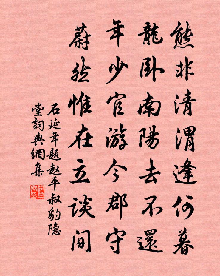詩詞名句歷史字典書法欣賞書法字典國語詞典說文解字康熙字典古漢語字典標 題 作 者 詩 句 題趙平叔豹隱堂作者:石延年 朝代:宋代題趙平叔豹隱堂原文熊非清渭逢何暮,龍臥南陽去不還。年少官游今郡守,蔚然惟在立談間。詩詞問答問:題趙平叔豹隱堂的作者是誰?答:石延年問:題趙平叔豹隱堂寫於哪個朝代?答:宋代石延年題趙平叔豹隱堂書法欣賞題趙平叔豹隱堂書法作品詩詞推薦春日鄭協律山亭陪宴餞鄭卿同用樓字宋之問〔唐代〕潘園枕郊郭,愛客坐相求。尊酒東城外,驂騑南陌頭。池平分洛水,林缺見嵩丘。暗竹侵山徑,垂楊拂妓樓。彩雲吳歌曹勛〔宋代〕水滿長洲月滿樓,姑蘇台榭鎖深秋。君王不見春花老,響靸廊中勝游。長歌行謝靈運〔南北朝〕倐爍夕星流。昱奕朝露團。粲粲烏有停。泫泫豈暫安。徂齡速飛電。頹節騖驚湍。覽物起悲緒。顧已識憂端。朽貌覺林寺王欽若〔宋代〕暫拂塵襟思倍清,竹風山色亂泉聲。安民功淺君恩重,又策羸蹄向古城。明發三衢三首楊萬里〔宋代〕拔盡新秧插盡田,出城一眼翠無邊。不關雨水愁行客,政是年年雨水天。句石延年〔宋代〕繁萼香瓊亂,殘英絳雪遺。亂後灞上鄭谷〔唐代〕柳絲牽水杏房紅,煙岸人稀草色中。日暮一行高鳥處,依稀合是望 * 。寄從叔杜荀鶴〔唐代〕三族不當路,長年猶布衣。苦吟天與性,直道世將非。雁夜愁痴坐,漁鄉老憶歸。為儒皆可立,自是拙時機。偈頌七十六首釋師範〔宋代〕一陽來復,萬匯發生。寒谷回春,冰河解凍。初十日早立寺門作趙蕃〔宋代〕春天陰晴無定姿,陰雲未卷晴風吹。青山表見花顏色,綠竹增添鷺羽儀。郭外不知誰是主,眼中今日我題詩。人生題射洪顯惠廟程公許〔宋代〕靈皇夙嗜祗江山,卜宅煙霞縹緲間。帶水淨涵青黤黮,畫屏中嵌玉孱顏。耽耽洞府自宮闕,裊裊天風來佩環。一炷題武關杜牧〔唐代〕碧溪留我武關東,一笑懷王跡自窮。鄭袖嬌嬈酣似醉,屈原憔悴去如蓬。山牆谷塹依然在,弱吐強吞盡已空。今日浮槎駱賓王〔唐代〕昔負千尋質,高臨九仞峰。真心凌晚桂,勁節掩寒松。忽值風飆折,坐為波浪沖。摧殘空有恨,擁腫遂無庸。渤海擬蘇少卿寄內張嵲〔宋代〕話別河樑上,踟躕古道邊。男兒重意氣,握節向幽燕。一來單于庭,五閏猶未還。黃雲愁瀚海,朔雪暗燕然。寒柳錢寺丞知白州李覯〔宋代〕大邑歌謠日尚新,忽驚千騎擁行塵。宦遊莫嘆登長道,天意先教福遠人。城在海隅門少客,地鍾陽氣景常春。政成臨江仙(元宵作)廖行之〔宋代〕春意茫茫春色里,又還幾度花期。淡晴時候盡融怡。梅腮翻白後,柳眼弄青時。正是江城天氣好,樓檯燈火星移。紫荷車范成大〔宋代〕綠英吐弱線,翠葉抱修莖。矗如青旄節,草中立亭亭。根有卻老藥,鱗皺友松苓。長生不暇學,聊冀病身輕。聰明泉劉沆〔宋代〕義山山下有靈泉,泉號聰明自古傳。四百年中三出相,不才何幸繼前賢。成德樂王表〔唐代〕趙女乘春上畫樓,一聲歌發滿城秋。無端更唱關山曲,不是征人亦淚流。征西舊卒許渾〔唐代〕少年乘勇氣,百戰過烏孫。力盡邊城難,功加上將恩。曉風聽戍角,殘月倚營門。自說輕生處,金瘡有舊痕。名句推薦都緣自有離恨,故畫作遠山長。歐陽修《訴衷情·眉意》 驚沙獵獵風成陣,白雁一聲霜有信。元好問《玉樓春·驚沙獵獵風成陣》 那裡是清江江上村,香閨里冷落誰瞅問?好一個憔悴的憑欄人。關漢卿《大德歌·冬》 瀉水置平地,各自東西南北流。鮑照《擬行路難十八首》 南園春半踏青時,風和聞馬嘶。歐陽修《阮郎歸·南園春半踏青時》 風驅急雨灑高城,雲壓輕雷殷地聲。劉基《五月十九日大雨》 宴爾新婚,以我御窮。佚名《谷風》 獨出前門望野田,月明蕎麥花如雪。白居易《村夜》 樂者,所以道樂也,金石絲竹,所以道德也;樂行而民鄉方矣。荀子《荀子·樂論》 越梅半拆輕寒里,冰清淡薄籠藍水。和凝《菩薩蠻·越梅半拆輕寒里》