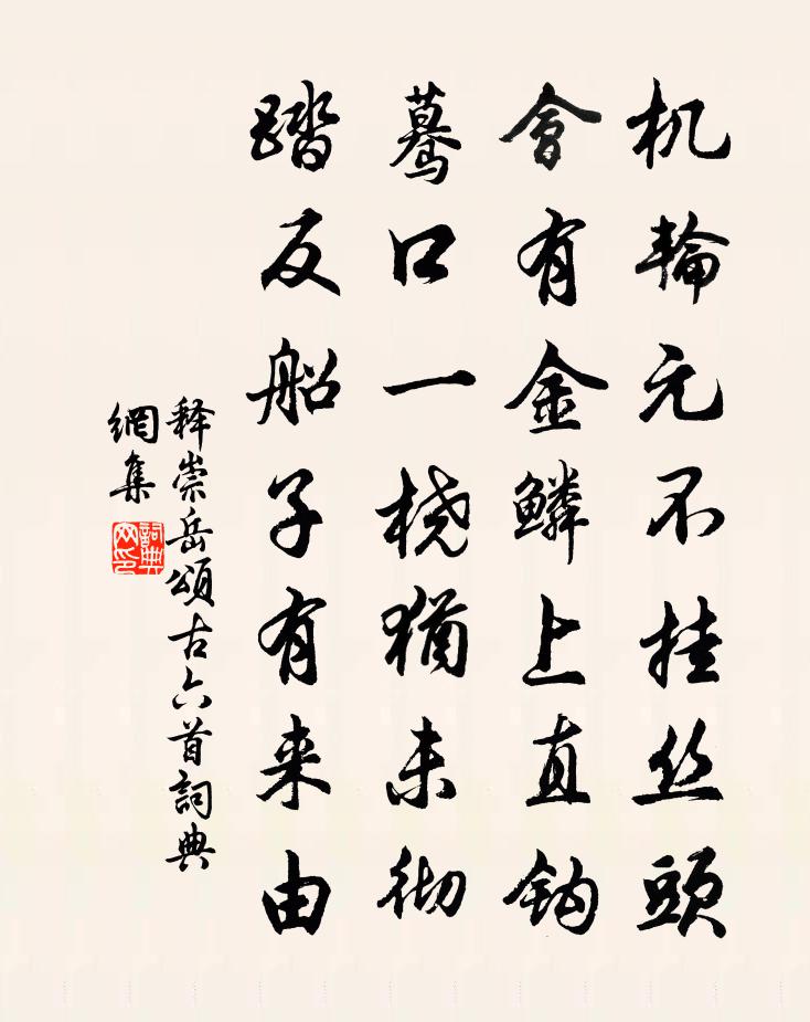 詩詞名句歷史字典書法欣賞書法字典國語詞典說文解字康熙字典古漢語字典標 題 作 者 詩 句 頌古六首作者:釋崇岳 朝代:宋代頌古六首原文機輪元不掛絲頭,會有金鱗上直鉤。驀口一橈猶未徹,踏反船子有來由。詩詞問答問:頌古六首的作者是誰?答:釋崇岳問:頌古六首寫於哪個朝代?答:宋代釋崇岳頌古六首書法欣賞頌古六首書法作品詩詞推薦題山橋十首王柏〔宋代〕滔滔利俗著人深,灑灑衿懷可出塵。指日洞陽斤斧息,開山一著要當人。贈陰陽家邱明遠曾豐〔宋代〕誰雲素手動朱門,我固知君有道存。鳳歷三元胸次具,龍圖八卦掌中翻。懸知地理善之善,正恐天機玄又玄。借使贈孫莘老七絕蘇軾〔宋代〕天目山前綠浸裙,碧瀾堂上看銜艫。作堤捍水非吾事,閒送苕溪入太湖。題李賓客舊居李虞〔唐代〕逢時不得致昇平,豈是明君忘姓名。眼暗發枯緣世事,今來無淚哭先生。念奴嬌陳三聘〔宋代〕餘霞飛綺,望長天、頃刻雲容凝碧。今夕江皋風力軟,明日波心頭白。客舸東流,語離深夜,遣我新愁積。春融花送張無夢歸天台查道〔宋代〕天台峻極橫海濱,金庭紫洞多真人。先生舍道心照鄰,上有羲軒為逸民。玉韞深山珠在水,圓折如虹難自晦。萬乘淮上雜詩六首梅堯臣〔宋代〕野雁不知數,翳然川上鳴。曾無設羅意,空自見船驚。渺渺拍波去,紛紛孤嶼盈。苦寒非塞外,霜落夜淮清。偈頌一百二十三首釋普度〔宋代〕聲前一句,格外一機。不墮古今,寧存凡聖。妙高台上,玉鑒光中。日日安居,時時禁足。風恬浪靜,海晏河清。讀本朝史有感十首項安世〔宋代〕非獨蘇仙念老窮,古靈亦復豐孤跨。白頭不得諸公力,惟有西塘八十翁。胡季亨贈集句古風,效其體奉酬楊萬里〔宋代〕秋氣集南澗,清風來故人。遺我一端綺,桃李不成春。大句乾元造,高詞媲皇墳。百衲收寸錦,一字買堪貧。苦恨論鄰人陸游〔宋代〕世通婚姻對門扉,禍福饑飽常相依。忿爭得直義愈非,不如一醉懹牒歸。即事李流謙〔宋代〕懶步東阡與北溪,一春心賞苦多違。墮紅藉藉痴蜂醉,稚綠陰陰乳燕飛。去國三年應自笑,封侯萬里不如歸。門前司馬光好學朱熹〔宋代〕司馬溫公幼時,患記問不若人。群居講習,眾兄弟既成誦,游息矣;獨下帷絕編,迨能倍誦乃止。用力多者收功遠次德施見和胡寅〔宋代〕頭如衰葆更加霜,身似陳茶不奈湯。春服又陪曾點詠,歸心尤美陸生裝。山川浮動風雲氣,草木欣榮日月光。剩種清曉捲簾歐陽玭〔唐代〕清曉意未愜,捲簾時一吟。檻虛花氣密,地暖竹聲深。秀色還朝暮,浮雲自古今。石泉驚已躍,會可洗幽心。置酒北郊外送張真甫還什邡晁公溯〔宋代〕高木已在望,不妨寬作程。相看愁饌徹,未用遽杯行。春暖姜肱被,川平雍齒城。遙知喜公至,雞犬亦歡迎。望月宋祁〔宋代〕早月始娟娟,西南寥泬天。魄中藏暗樹,輪外上虛弦。傍漢含銀淺,過雲漏葉鮮。遙知今夜鵲,猶得穩枝眠。詠華林書院樂史〔宋代〕能為孝義復為文,惟有君家事漸新。旌表已迎金殿敕,子孫常宴杏園春。親情廣闊追隨大,鼓笛喧勝嫁娶頻。更置八月十四至十六日無月二首郭印〔宋代〕秋中景色正蕭森,月色超然重古今。要使萬方傾素采,那知三日翳重陰。晦冥欲害天公眼,想像難忘海宇心。決斷偈頌八十五首釋妙倫〔宋代〕一夏九十日,今朝事已周。寒山逢拾得,把手話來由。且道個什麼,梨出青州,棗出鄭州。名句推薦慈母倚門情,遊子行路苦。王冕《墨萱圖·其一》 極目離離,遍地濛濛,官橋野塘。陳維崧《沁園春·詠菜花》 人悄悄,簾外月朧明。岳飛《小重山·昨夜寒蛩不住鳴》 法之不行,自於貴戚。司馬遷《史記·秦本紀》 雨中禁火空齋冷,江上流鶯獨坐聽。韋應物《寒食寄京師諸弟》 秋送新鴻哀破國,晝行飢虎齧空林。鄭思肖《二礪》 襄陽古道灞陵橋,詩興與秋高。完顏璹《朝中措·襄陽古道灞陵橋》 今夜鄜州月,閨中只獨看。杜甫《月夜》 逢人且說三分話,未可全拋一片心。佚名《增廣賢文·上集》 如今卻憶江南樂,當時年少春衫薄。韋莊《菩薩蠻·如今卻憶江南樂》
