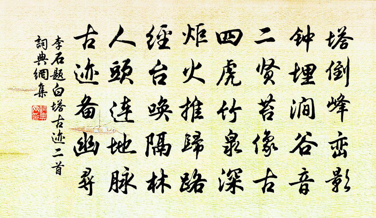 詩詞名句歷史字典書法欣賞書法字典國語詞典說文解字康熙字典古漢語字典標 題 作 者 詩 句 題白塔古蹟二首作者:李石 朝代:宋代題白塔古蹟二首原文塔倒峰巒影,鍾埋澗谷音,二賢苔像古,四虎竹泉深。炬火推歸路,經台喚隔林。人頭連地脈,古蹟備幽尋。詩詞問答問:題白塔古蹟二首的作者是誰?答:李石問:題白塔古蹟二首寫於哪個朝代?答:宋代李石題白塔古蹟二首書法欣賞題白塔古蹟二首書法作品詩詞推薦題賺蘭亭圖劉克莊〔宋代〕山陰繭紙見者希,辨才傳之於永師。行年八十手不釋,棲之樑上鬼莫窺。虬須天子欲得之,威以禍福僧詭辭。智勇丁未春五首劉克莊〔宋代〕端平淳祐兩匆匆,過眼光陰掣電同。六十一翁無出理,孤山長寄夢魂中。步西湖次韻徐南卿陳造〔宋代〕水月春猶淺,攜壺記此臨。雲煙澹閒寂,魚鳥媚清深。堤路俄人海,侯家或肉林。高樓下金彈,簾影眇深沈。隴西行謝惠連〔南北朝〕未若蔽牛。永保液瞞。嗟我君子。勖爾何言。漁父詞/漁父王諶〔宋代〕滿湖飛雪攪長空。急起呼兒上短蓬。箬笠具,畫圖同。鐵笛聲長曲未終。李留守相公見過,池上泛舟,舉酒話及翰林舊白居易〔唐代〕引棹尋池岸,移尊就菊叢。何言濟川後,相訪釣船中。白首故情在,青雲往事空。同時六學士,五相一漁翁。薰蕕吟邵雍〔宋代〕善惡之間,薰蕕可究。近薰必香,近蕕必臭。大滌洞天留題趙崇渭〔宋代〕一到琳宮事事幽,炎天正好暫時留。鶴仙共此泉流樂,氣象全勝白鷺洲。台州宴包知府樂語高斯得〔宋代〕使君五馬日邊來,猶是當年逸驥才。漢竹光榮知妙簡,召棠蔽芾喜重栽。試聽孝肅傳新令,佇看文清拜首台。盛事漢州塔二首郭印〔宋代〕相隨步屧轉穹隆,萬室鱗鱗指顧中。自笑情懷非曠士,誰知筋力已衰翁。吟餘尚惜西山日,立久翻憂北戶風。從此次吳司理見貽二絕韻裘萬頃〔宋代〕朱金得喪日悲懽,內樂知誰夢見顏。君有上池無限水,不將涓滴到人間。次韻答柳通叟問舍求田之詩黃庭堅〔宋代〕少日心期轉謬悠,蛾眉見妒且障羞。但令有婦如康子,安用生兒似仲謀。橫笛牛羊歸晚徑,捲簾瓜芋熟西疇。功名四皓像舒岳祥〔宋代〕商山深處養靈根,白髮昂藏滿面春。一出漢庭安漢嗣,頗疑傾得戚夫人。強酒白居易〔唐代〕若不坐禪銷妄想,即須行醉放狂歌。不然秋月春風夜,爭那閒思往事何?沁園春劉將孫〔宋代〕壬戌之秋,七夕既望,蘇子泛舟。正赤壁風清,舉杯屬客,東山月上,遺世乘流。桂棹叩舷,洞簫倚和,何事嗚嗚高宗郊祀前廟朝享太廟三十首真宗〔宋代〕秬鬯既將,黃鐘具奏。肅我祖考,祇栗以俟。於皇列聖,在帝左右。監觀於茲,雲車來下。古木陽枋〔宋代〕古木撐空萬丈青,鋪排峽險與江深。濃嵐欲滴春煙暝,畫出騷人一片心。題司空圖壁盧攜〔唐代〕姓氏司空貴,官班御史卑。老夫如且在,不用嘆屯奇。西樓韋應物〔唐代〕高閣一長望,故園何日歸。煙塵擁函谷,秋雁過來稀。貝宮夫人李賀〔唐代〕丁丁海女弄金環,雀釵翹揭雙翅關。六宮不語一生閒,高懸銀牓照青山。長眉凝綠幾千年,清涼堪老鏡中鸞。秋肌名句推薦玉璫緘札何由達,萬里雲羅一雁飛。李商隱《春雨》 明月不諳離恨苦。斜光到曉穿朱戶。晏殊《蝶戀花·檻菊愁煙蘭泣露》 而浮生若夢,為歡幾何?李白《春夜宴桃李園序 / 春夜宴從弟桃花園序》 風吹仙袂飄颻舉,猶似霓裳羽衣舞白居易《長恨歌》 西施若解傾吳國,越國亡來又是誰。羅隱《西施》 無人調護,自去經心。沈復《浮生六記·閨房記樂》 冬宜密雪,有碎玉聲。王禹偁《黃岡竹樓記》 蠶娘洗繭前溪淥,牧童吹笛和衣浴。貫休《春晚書山家屋壁二首》 胡蝶夢中家萬里,子規枝上月三更。崔塗《春夕》 博學之,審問之,慎思之,明辨之,篤行之。子思《中庸·第二十章》