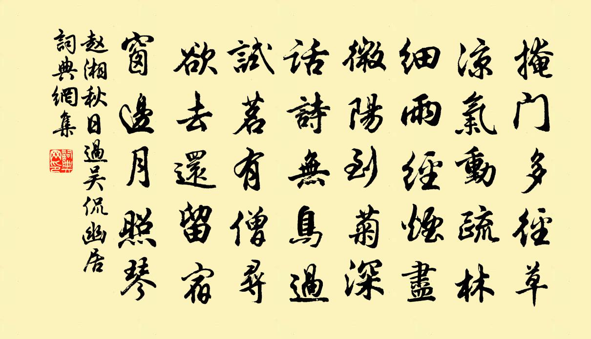 詩詞名句歷史字典書法欣賞書法字典國語詞典說文解字康熙字典古漢語字典標 題 作 者 詩 句 秋日過吳侃幽居作者:趙湘 朝代:唐代秋日過吳侃幽居原文掩門多徑草,涼氣動疏林。細雨經煙盡,微陽到菊深。話詩無鳥過,試茗有僧尋。欲去還留宿,窗邊月照琴。詩詞問答問:秋日過吳侃幽居的作者是誰?答:趙湘問:秋日過吳侃幽居寫於哪個朝代?答:唐代趙湘秋日過吳侃幽居書法欣賞秋日過吳侃幽居書法作品詩詞推薦題金山韓垂〔唐代〕靈山一峰秀,岌然殊眾山。盤根大江底,插影浮雲間。雷霆常間作,風雨時往還。象外懸清影,千載長躋攀。松鶴元稹〔唐代〕渚宮本坳下,佛廟有台閣。台下三四松,低昂勢前卻。是時晴景麗,松梢殘雪薄。日色相玲瓏,纖雲映羅幕。逡巡試筆偶書二首曹勛〔宋代〕道友山間四散居,忽然相會亦旬余。直須把盞如村醉,醉後歌歡更自加。後哀趙師秀〔宋代〕交交谷鳥哀,鬱郁澗松折。山民無還期,春物失怡悅。平生感斯人,難以常理說。共智己則愚,忽巧眾亦拙。芳名百丈山李忱〔唐代〕大雄真跡枕危巒,梵宇層樓聳萬般。日月每從肩上過,山河長在掌中看。仙峰不間三春秀,靈境何時六月寒。更有暑行憩新都驛陸游〔宋代〕細細黃花落古槐,江皋不雨轉輕雷。長空鳥破蒼煙去,落日人從綠野來。散策意行尋水石,脫巾高臥避氛埃。羈游鷓鴣天 己酉之秋,苕溪記所見姜夔〔宋代〕京洛風流絕代人,因何風絮落溪津。籠鞋淺出鴉頭襪,知是凌波縹緲身。紅乍笑,綠長顰,與誰同度可憐春。鴛鴦被酒羅與之〔宋代〕人間笑口信難開,十事常嗟九不諧。忙裡始知閒氣味,老來方見少情懷。清商憭栗歲無幾,玄發蕭疏生有涯。誰謂惜花張籍〔唐代〕春潭足芳樹,水清不如素。幽人愛華景,一一空山暮。月出潭氣白,游魚暗沖石。夜深春思多,酒醒山寂寂。和韋承慶過義陽公主山池五首杜審言〔唐代〕野興城中發,朝英物外求。情懸朱紱望,契動赤泉游。海燕巢書閣,山雞舞畫樓。雨余清晚夏,共坐北岩幽。徑轉陳履常惠詩有曾門一老之句不肖二十五歲謁見張耒〔宋代〕南豐冢木已蕭蕭,猶有門人守一瓢。文彩自應傳壺奧,典刑猶可想風標。紛紛但見侏儒飽,寂寂誰歌隱士招。十載逢楊開府韋應物〔唐代〕少事武皇帝,無賴恃恩私。身作里中橫,家藏亡命兒。朝持樗蒲局,暮竊東鄰姬。司隸不敢捕,立在白玉墀。驪山老身釋文珦〔宋代〕老身到此合稱翁,雙足蹣跚兩耳聾。聊托迂疎民世表,幸無名字到官中。生期槁木寒灰盡,性與孤猿野鶴同。去歲一真姑趙師秀〔宋代〕忽然能不食,飲水度中年。此事知難偽,令人信有仙。形容無血色,衣服有香菸。聽說瑤池路,猶如在目前。望海潮張藻〔宋代〕露零金井,塵清玉宇,雙蓂呈瑞新秋。佳氣鬱蔥,祥煙繚繞,玉門初誕風流。賓客競回眸。慶虎頭食肉,燕頷封侯偶以拙詩數首寄呈裴少尹侍郎蒙以盛制四篇…美而謝之白居易〔唐代〕投君之文甚荒蕪,數篇價直一束芻。報我之章何璀璨,累累四貫驪龍珠。毛詩三百篇後得,文選六十卷中無。一麋家釀頗勁戲作陸游〔宋代〕千古英雄骨作塵,不如一醉卻關身。鼎來雖恨王陵戇,熟味方知孟子醇。試問浩歌遺世事,何如酣枕養天真?竹林題呂季升谷隱堂兼寄居仁李處權〔宋代〕莘野隱於耕,傅岩隱於築。叔夜隱於鍛,君平隱於卜。四子隱不同,抗志俱超俗。夫君無所事,掃跡隱於谷。優遊北山之高壽北山何先生金履祥〔宋代〕咨爾夫子,設教於鄉。即命於家,長此泮宮。贈葉子仁真德秀〔宋代〕花正紛紅俄駭綠,月才掛壁又沈銘。世間萬事都如此,莫遣雙眉浪自愁。名句推薦水繞陂田竹繞籬,榆錢落盡槿花稀。張舜民《村居·水繞陂田竹繞籬》 蕭蕭江上荻花秋,做弄許多愁。賀鑄《眼兒媚·蕭蕭江上荻花秋》 佇久河橋欲去,斜陽淚滿。吳文英《三姝媚·過都城舊居有感》 別有幽愁暗恨生,此時無聲勝有聲。白居易《琵琶行 / 琵琶引》 與朋友交遊,須將他們好處留心學來,方能受益王永彬《圍爐夜話·第二則》 投軀報明主,身死為國殤。鮑照《代出自薊北門行》 乍見翻疑夢,相悲各問年。司空曙《雲陽館與韓紳宿別》 臣子恨,何時滅!駕長車,踏破賀蘭山缺。岳飛《滿江紅·寫懷》 貞女貴徇夫,捨生亦如此。孟郊《列女操 / 烈女操》 富而不驕,貴而不舒。司馬遷《史記·五帝本紀》