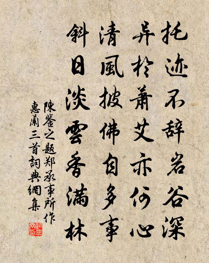 詩詞名句歷史字典書法欣賞書法字典國語詞典說文解字康熙字典古漢語字典標 題 作 者 詩 句 題鄭承事所作惠蘭三首作者:陳鑒之 朝代:宋代題鄭承事所作惠蘭三首原文托跡不辭岩谷深,異於蕭艾亦何心。清風披佛自多事,斜日淡雲香滿林。詩詞問答問:題鄭承事所作惠蘭三首的作者是誰?答:陳鑒之問:題鄭承事所作惠蘭三首寫於哪個朝代?答:宋代陳鑒之題鄭承事所作惠蘭三首書法欣賞題鄭承事所作惠蘭三首書法作品詩詞推薦何處堪避暑白居易〔唐代〕何處堪避暑,林間背日樓。何處好追涼,池上隨風舟。日高飢始食,食竟飽還游。游罷睡一覺,覺來茶一甌。眼明次韻答崔元初王冕〔元代〕樓居依約近蓬萊,每見天官簇仗來。星繞紫微雙闕近,日臨仙掌五雲開。旌旗影動黃金表,龍馬風生白玉台。遙望次韻天官韓尚書七月十八日風雨中觀潮予內直周必大〔宋代〕大筆真能挾風雨,小才何敢助涓埃。古今奇觀須秋半,好約重銜伯雅杯。和曾令綽買宅貽景仁韓維〔宋代〕久治孤學慕軻丘,投老還鄉寡所求。蓬華隨緣安靜默,林泉乘興訪深幽。高門此地成君志,方駕何時寫我憂。白首送李冠冠善吹中管李建勛〔唐代〕勻如春澗長流水,怨似秋枝欲斷蟬。可惜人間容易聽,清聲不到御樓前。吟窗邵棠〔宋代〕獨坐吟殘幾度春,小窗元不受塵昏。夜深村落無更點,只把梅花記月痕。正月初四日聽新樂成絕句張鎡〔宋代〕嗚嗚胡笛鷓鴣聲,三疊鳴獸舞袖輕。燈市花村舊歡醉,如今自厭邈無情。吳興道中秦觀〔宋代〕僶俛蓽門下,十年守一方。胡為御舟者,挽我置此傍。青山不肯盡,流水故意長。雖雲道理遠,瓦樽有酒漿。二月十九日度大庾嶺題雲封寺四首楊萬里〔宋代〕梅山未到未教休,到得梅山始欲愁。知道望鄉看不見,也須一步一回頭。書事王維〔唐代〕輕陰閣小雨,深院晝慵開。坐看蒼苔色,欲上人衣來。杭州修廣師法喜堂王安石〔宋代〕浮屠之法與世殊,洗滌萬事求空虛。師心以此不掛物,一堂收身自有餘。堂陰置石雙嵽嵲,石腳立竹青扶疏。一來木蘭花慢 贈彈琵琶者張伯淳〔元代〕愛當壚年少,將雅調,寄幽情。盡百喙春和,群喧夜寂,老鳳孤鳴。都來四條弦里,有無窮、舊譜與新聲。寫出天寄故人劉方齋文天祥〔宋代〕溪頭濁潦擁魚蝦,笑殺漁翁下釣差。棹取扁舟湖海去,悠悠心事寄蘆花。書景雲軒壁李覯〔宋代〕二江斜入似娥眉,盡日憑高把酒巵。貧賤別應無好處,猛忙中是我閒時。吳娘曲陸游〔宋代〕鏡奩蠶出千黑蟻,釵梁梅小雙青豆。吳娘十四未知愁,羅衣已覺傷春瘦。閒尋女伴過西家,鬥草歸來日未斜。睡睫啼禽梅堯臣〔宋代〕盆繭未成絲,破褲勸可脫。安知增羞顏,赤脛衣短褐。答王尚書問履道池舊橋白居易〔唐代〕虹梁雁齒隨年換,素板朱欄逐日修。但恨尚書能久別,莫愁川守不頻游。重移舊柱開中眼,亂種新花擁兩頭。李郭鵲橋仙(丁巳七夕)趙師俠〔宋代〕明河風細,鵲橋雲淡,秋入庭梧先墜。摩孩羅荷葉傘兒輕,總排列、雙雙對對。花瓜應節、蛛絲卜巧,望月穿針樓題汪水雲詩卷十一首劉師復〔宋代〕杖藜引客入漁家,盡敞蓬窗作供茶。三面闌乾詩思闊,湖光千頃浸荷花。遺懷雜賦孫嵩〔宋代〕宇宙迂疏一布衣,謀身畢竟是邪非。能知道義丘山重,定看榮華草芥微。世事悠悠蝴蝶夢,人情擾擾桔槔機。英雄名句推薦白雁亂飛秋似雪,清露生涼夜。吳西逸《清江引·秋居》 儉則傷事,侈則傷貨管仲《管子·乘馬》 雪紛紛,掩重門,不由人不斷魂,瘦損江梅韻。關漢卿《大德歌·冬》 雪嶺金河獨向東,吳山楚澤意無窮清江《送婆羅門》 為報今年春色好。花光月影宜相照。李清照《蝶戀花·上巳召親族》 斟酌姮娥,九秋宮殿冷。史達祖《齊天樂·中秋宿真定驛》 養其小者為小人,養其大者為大人。孟子《孟子·告子章句上·第十四節》 東飛烏鵲西飛燕。盈盈一水經年見。陳師道《菩薩蠻·七夕》 自奉必須儉約,宴客切勿流連。朱柏廬《朱子家訓·全文》 風勁角弓鳴,將軍獵渭城。王維《觀獵》