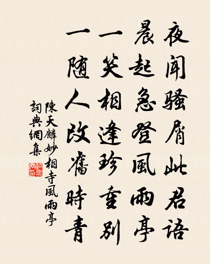 詩詞名句歷史字典書法欣賞書法字典國語詞典說文解字康熙字典古漢語字典標 題 作 者 詩 句 妙相寺風雨亭作者:陳天麟 朝代:宋代妙相寺風雨亭原文夜聞騷屑此君語,晨起急登風雨亭。一笑相逢珍重別,一隨人改舊時青。詩詞問答問:妙相寺風雨亭的作者是誰?答:陳天麟問:妙相寺風雨亭寫於哪個朝代?答:宋代陳天麟妙相寺風雨亭書法欣賞妙相寺風雨亭書法作品詩詞推薦奉和聖制送張說上集賢學士賜宴(賦得私字)李元紘〔唐代〕碩儒延鳳沼,金馬被鴻私。饌玉趨丹禁,箋花降紫墀。銜恩傾旨酒,鼓舞詠康時。暫覯群書緝,逾昭盛業丕。接筵示能仁長老祖秀胡寅〔宋代〕此世示可出,太虛無古今。一塵絕點染,萬象羅蕭森。白雲從何來,舒捲亦無心。流風散遠影,花雨釋重陰。俄然春日陸游〔宋代〕久拋朝幘嬾重彈,華發蕭然二寸冠。不恨淒涼侵晚境,猶能語笑向春盤。銀杯酒色家家綠,篛笠煙波處處寬。一片論語攻乎異端章陳普〔宋代〕墨氏似仁楊似義,佛如美色與淫聲。刀圭烏喙甜如蜜,何況專攻欲盡精。陳天予喜拙者得謝作詩相慶次韻以報來辱吳芾〔宋代〕一自同簪獬豸冠,幾經離合幾悲歡。荷君終始於人厚,知我疏慵涉世難。聞道休 * 自適,惠在貽問更相寬。交遊詐者吟邵雍〔宋代〕詐者固疑人,天下盡行詐。不信天下人,其間無真話。務中晚作張耒〔宋代〕官事一酒瓮,寢齋低竹檐。朝昏睡過半,老病醉相兼。樓晚雙旗裊,城昏疊鼓嚴。隔江吹笛處,空碧帖新蟾。高宗郊前朝獻景靈宮二十一首真宗〔宋代〕嘉薦既終,神貺其復。麥我思成,靈光下燭。孝孫承之,載祗載肅。敷錫庶民,函蒙祉福。玉燭新·花穿簾隙透吳文英〔宋代〕花穿簾隙透。向夢裡銷春,酒中延晝。嫩篁細掐,想思字、墮粉輕黏D139袖。章台別後,展繡絡、紅蔫香舊。送天柱馮先生李絢〔宋代〕閒馳風馭恣飄飄,因失仙班幾度朝。紫閣舊憐秦樹老,赤城新別海山遙。飛鳧又說春經岳,叱橘曾令夜探潮。不是時賢明鑑裁唐士恥〔宋代〕時賢明鑑裁,鑒裁信奇歟。識此希世寶,謂其僧區區。未冠已溢聲,賢書上宸庭。不一而止足,竟壓四海英。直入七夕遇雨訪石堂先生熊禾〔宋代〕高高不可問,神光終朦朧。雲錦不成報,謾爾欺盲聾。柱維久傾折,會有補煉功。吾廬釋行海〔宋代〕二月吾廬感物華,傷春多在別人家。今年莫使春憔悴,能有幾番歸看花。蘇文忠二詩帖贊岳珂〔宋代〕物隨春而欣榮,詩之偶成,何間乎虎跑之與女城。縱筆而書,冰谷梅英。尺是歲月之與所因,予皆不必強評。惟當五貺詩太湖硯皮日休〔唐代〕求於花石間,怪狀乃天然。中瑩五寸劍,外差千疊蓮。月融還似洗,雲濕便堪研。寄與先生後,應添內外篇。老嘆陸游〔宋代〕齒髮衰殘久退休,衡茅荒寂更禁秋。一年用力身猶倦,百不關心夢亦愁。遠浦臥看鳧泛泛,深林時聽鹿呦呦。天台七十翁吟五言古體十首方回〔宋代〕世短心徒長,日暮道更遠。偶榮匪運泰,驟落非命蹇。王侯死無葬,將相謫不返。賤窮齒禿缺,尚許噉糲飯。配享杏孫何〔宋代〕殷紅鄙桃艷,淡白笑梨花。落處飄微霰,繁時疊碎霞。苑宜開帝里,壇稱在儒家。麗日明珠箔,清香襲絳紗。三峰寺真山民〔宋代〕寂寞煙林噪亂鴉,青鞋步入野僧家。雲深不礙鐘聲郵,日轉還移塔影斜。廊下蝸黏沿砌蘚,佛前蜂戀插瓶花。竹床泛湖十絕句陳造〔宋代〕底許行庖旋不空,小舟如纖浪花中。盤珍俎實隨供給,亦有紅衣載短蓬。名句推薦寧不知傾城與傾國。佳人難再得。李延年《李延年歌》 謫仙何處,無人伴我白螺杯。黃庭堅《水調歌頭·遊覽》 漸老念鄉國,先歸獨羨君。簡長《送僧南歸》 金風細細。葉葉梧桐墜。晏殊《清平樂·金風細細》 綠淨春深好染衣。際柴扉。賀鑄《釣船歸·綠淨春深好染衣》 還背垂虹秋去,四橋煙雨,一宵歌酒。吳文英《瑞龍吟·送梅津》 曉霧將歇,猿鳥亂鳴;陶弘景《答謝中書書》 清露晨流,新桐初引,多少遊春意。李清照《念奴嬌·春情》 成事不說,遂事不諫,既往不咎。孔子弟子《論語·八佾篇》 鐵衣霜露重,戰馬歲年深。戎昱《塞下曲·其六》