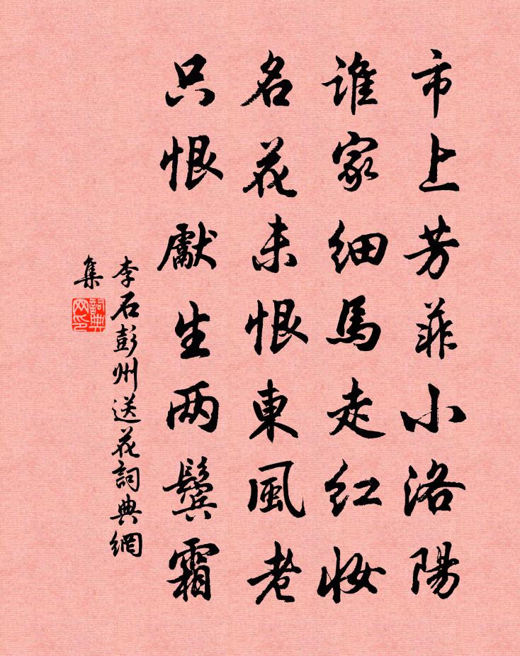 詩詞名句歷史字典書法欣賞書法字典國語詞典說文解字康熙字典古漢語字典標 題 作 者 詩 句 彭州送花作者:李石 朝代:宋代彭州送花原文市上芳菲小洛陽,誰家細馬走紅妝。名花未恨東風老,只恨先生兩鬢霜。詩詞問答問:彭州送花的作者是誰?答:李石問:彭州送花寫於哪個朝代?答:宋代李石彭州送花書法欣賞彭州送花書法作品詩詞推薦紹興以後祀五方帝六十首佚名〔宋代〕[姑洗為羽]燁燁其光,炳炳其靈。窅其如容,剡其如聲。扇以景風,導以朱游。我德匪類,神其安留。野外新秋鄧深〔宋代〕平野寬無際,層雲撥不開。曉容收雨後,涼意送秋來。春曉汪莘〔宋代〕曉來雨初晴,天宇淨如拭。隔籬見花柳,春氣亂五色。東君渾不管,但為閒者得。我方獵鵾鵬,溟南復溟北。擬和御製郊祀詩李洪〔宋代〕郊禋饗帝就圜丘,誠格蒼穹靈既留。夜陟紫壇飈馭下,天臨黃道矞雲浮。槐林雙闕恩方渙,禾黍三登歲有秋。幸睹首夏二首方回〔宋代〕寒燠分時序,生成續化工。竊遲登麥日,肯怨落花風。春氣何曾絕,天機豈易窮。誰雲老圃淡,早著石榴紅。水仙子·瑣窗風雨古今情喬吉〔元代〕瑣窗風雨古今情,夢繞雲山十二層,香銷燭暗人初定。酒醒時愁未醒,三般兒挨不到天明。劃地羅幃靜,森地鴛被和李雁湖晚春即事八首吳泳〔宋代〕避人不必武陵源,盪有芙蓉溪有蓀。弄水澆花心自遠,何妨酌客兩三尊。真陽縣晝睡縣舍素絲堂張耒〔宋代〕見君堂下小荷葉,驚我客中春已空。一覺西堂亭午睡,悠悠春夢逐春風。千里丈蓄酒尊形狀孛窣某酒後以短項翁目之不鍾孝國〔宋代〕少陵先生時不偶,老瓦盆中醉林莽。江湖散人名益窮,魚殼傾尊不論斗。孤風異行同襟期,食鮭未必富三九。凌煙吳興黃浦亭庾中郎別詩鮑照〔南北朝〕風起洲渚寒。雲上日無輝。連山眇煙霧。長波迥難依。旅鴈方南過。浮客未西歸。已經江海別。復與親眷違。奔景秋霽潼關驛亭許渾〔唐代〕霽色明高巘,關河獨望遙。殘雲歸太華,疏雨過中條。鳥散綠蘿靜,蟬鳴紅樹凋。何言此時節,去去任蓬飄。魏昭父惠新刻李西台諸公帖二首趙蕃〔宋代〕墨妙初聞探錦囊,刻成愈覺爛生光。登登打就分來處,雨合新篁夏日涼。和任大夫贈別胡寅〔宋代〕未老先衰負疾憂,敢貪榮祿尚為州。已慚騷客能招隱,更愧疲民欲借留。斤斧且廳存夜氣,江湖那得獻辰猷。新詩如夢令(賦梁燕)辛棄疾〔宋代〕燕子幾曾歸去。只在翠岩深處。重到畫梁間,誰與舊巢為主。深許。深許。聞道鳳凰來住。梅花張道洽〔宋代〕天然標格閬風鄉,薄薄鉛華淡淡妝。月地向誰孤弄影,雪天驀地忽聞香。征鞍處處頻回首,羌管聲聲欲斷腸。天上詠籠鶯納蘭性德〔清代〕何處金衣客,棲棲翠幙中。有心驚曉夢,無計囀春風。謾逐梁間燕,誰巢井上桐。空將雲路翼,緘恨在雕籠。詠史皎然〔唐代〕獨負高世資,冥冥寄浮俗。卞子去不歸,何人辯荊玉。鬻舂意不淺,污跡身豈辱。鸞鎩樂迍邅,虬蟠甘窘束。五噫九日初四日分韻得然字徐璣〔宋代〕去載羈旅身,千里望群賢。今夕良燕會,況乃佳節前。涼風日已多,歲序日已遷。春時種藂菊,秋花滿籬邊。采之韋皋徐鈞〔宋代〕撫邊年久賦徭寬,善政春秋俗自安。蜀道雖危今坦易,登天不比向時難。題徐氏滋德堂用老謝丈韻趙蕃〔宋代〕一時人物韓與蘇,題榜制名夫豈疏。保家匪乏千金產,教子必以萬卷書。江河源從濫觴起,拱把可取合抱余。方今名句推薦妾家高樓連苑起,良人執戟明光里。張籍《節婦吟·寄東平李司空師道》 舟非水不行,水入舟則沒佚名《孔子家語·六本》 天平山上白雲泉,雲自無心水自閒。白居易《白雲泉》 湛湛長江去,冥冥細雨來。杜甫《梅雨》 危橋屬幽徑,繚繞穿疏林。柳宗元《巽公院五詠·苦竹橋》 多謝月相憐,今宵不忍圓。朱淑真《菩薩蠻·山亭水榭秋方半》 又有牆頭千葉桃,風動落花紅蔌蔌。元稹《連昌宮詞》 若言言悅耳,事事快心,便把此生埋在鴆毒中矣。洪應明《菜根譚·概論》 向河梁、回頭萬里,故人長絕。辛棄疾《賀新郎·別茂嘉十二弟》 慮澹物自輕,意愜理無違。謝靈運《石壁精舍還湖中作》
