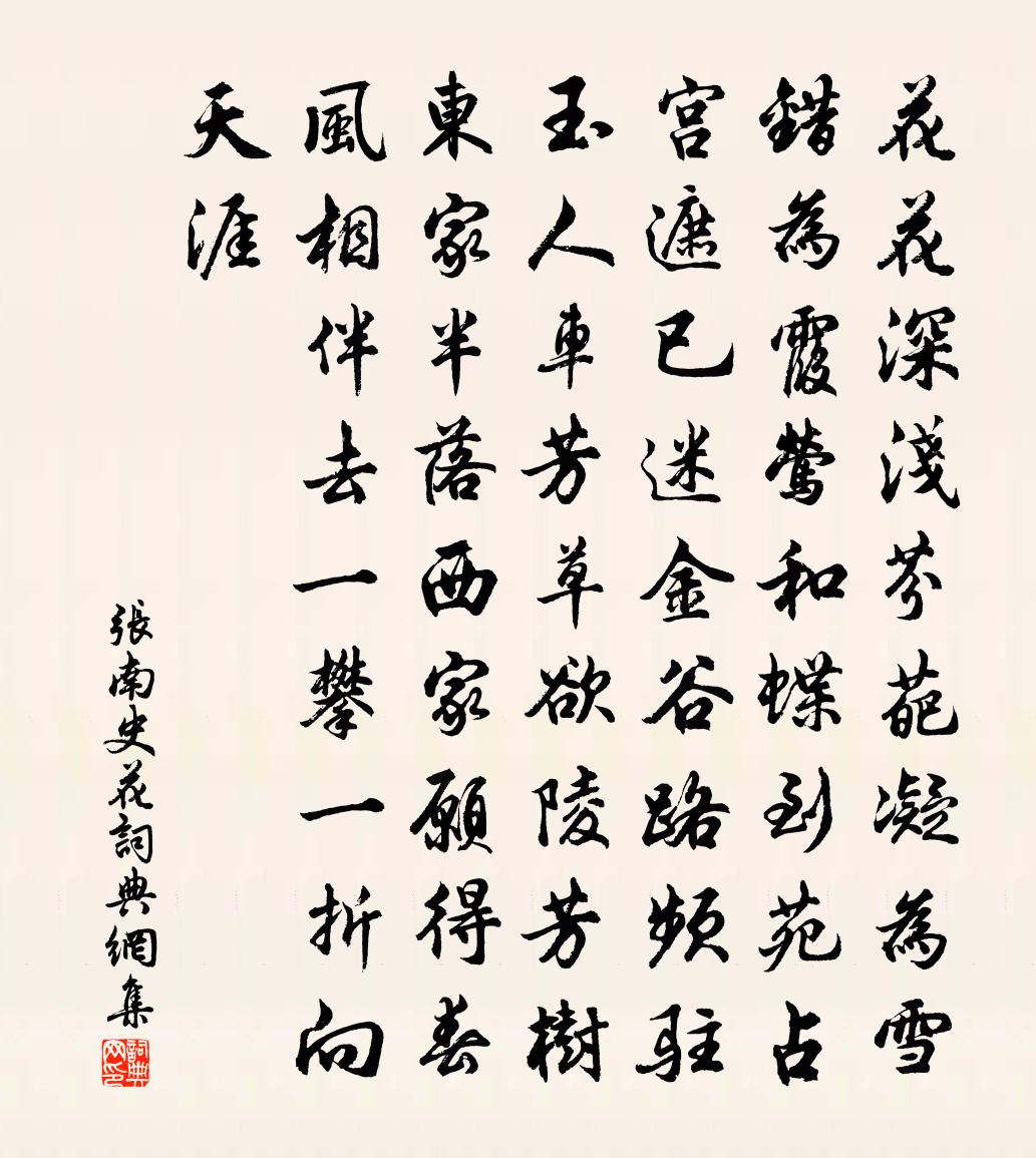 詩詞名句歷史字典書法欣賞書法字典國語詞典說文解字康熙字典古漢語字典標 題 作 者 詩 句 花作者:張南史 朝代:唐代花原文花,花。深淺,芬葩。凝為雪,錯為霞。鶯和蝶到,苑占宮遮。已迷金谷路,頻駐玉人車。芳草欲陵芳樹,東家半落西家。願得春風相伴去,一攀一折向天涯。詩詞問答問:花的作者是誰?答:張南史問:花寫於哪個朝代?答:唐代問:花是什麼體裁?答:雜言張南史花書法欣賞花書法作品注釋全唐詩:卷296_26詩詞推薦和趙南塘離支五絕劉克莊〔宋代〕側生海畔遠難將,風日尤能變色漿。借問驛馳丞相府,何如輦致道山堂。喜遷鶯(壽楊韓州·正月初五)杜東〔宋代〕生申華席。便占卻新春,前頭五日。椒頌梅英,金幡彩縷,好個早春天色。使君以仁得壽,和氣融春無極。人總道讀西漢王令〔宋代〕漢得孤秦萬弊時,當年丞相要無為。洛陽年少空流涕,誰謂書生果有知。己卯十月一日至燕越五日罹狴犴有感而賦文天祥〔宋代〕落落南冠自結纓,桁楊臥起影縱橫。坐移白石知何世,夢斷青燈問幾更。國破家亡雙淚暗,天荒地老一身輕。黃粱江梅王安石〔宋代〕江南歲盡多風雪,也有紅梅漏泄春。顏色凌寒終慘澹,不應搖落始愁人。西廳夏竦〔宋代〕階除盡日微風度,簾幕先秋暑氣還。莫訝使君臨案久,雨晴端正見南山。溫陵殘臘書懷寄崔尚書徐夤〔唐代〕濟川無楫擬何為,三傑還從漢祖推。心學庭槐空發火,鬢同門柳即垂絲。中興未遇先懷策,除夜相催也課詩。江上蝶戀花(詠枕兒)歐陽修〔宋代〕寶琢珊瑚山樣瘦。緩髻輕攏,一朵雲生袖。昨夜佳人初命偶。論情旋旋移相就。幾疊鴛衾紅浪皺。暗覺金釵,磔磔自題白居易〔唐代〕老宜官冷靜,貧賴俸優饒。熱月無堆案,寒天不趁朝。傍看應寂寞,自覺甚逍遙。徒對盈樽酒,兼無愁可銷。上後樂劉先生左史十首用襄陽詩兩句行藏堅晚程公許〔宋代〕厚德最耐看,士當論志遠。沄沄物歸根,混混泉有本。眼明長庚曉,心知歲華晚。後生須榘獲,所願加餐飯。雜興顧逢〔宋代〕等閒白卻少年頭,悟得空時總不愁。畢竟生來何所有,只如水上一浮漚。羅漢贊釋大觀〔宋代〕藕竅藏身,不形一縷。掀潘風雲,澤遍大地。彼其隱現大小之不同,終莫能逃乎應量之器。明眼人前,可賤可貴。題瑩上人二畫右剡溪陸游〔宋代〕天地又秋風,溪山憶剡中。孤舟幸閒著,借我訪支公。禱雨木欄堂四首陳造〔宋代〕池上客熟無那,池中魚不自濡。安得涼煙泛坐,綠荷盡日跳珠。梅岩趙崇釠〔宋代〕嵌空天影落元間,更著梅花迥莫攀。休說橫斜欠清淺,此岩正不減孤山。杏花天辛棄疾〔宋代〕牡丹昨夜方開遍。畢竟是、今年春晚。荼付與薰風管。燕子忙時鶯懶。多病起、日長人倦。不待得、酒闌歌散。副贈王典史五首熊禾〔宋代〕自從大道裂,教法日益殊。文學與政事,往往成兩途。簿書吏應俗,佔畢儒誠迂。二者不相能,世道良可吁。生朝前一日過隆慶十里得老人書中詩因用尊韻洪咨夔〔宋代〕燈花太喜酒樽空,客路真成印雪鴻。出寒曲中迷灞滻,籌邊圖裹認維松,汗鞮虱胄心猶壯,篷矢桑弧鬢已翁。東望青青西門槐王安石〔宋代〕人情甘阿諛,我獨倦請謁。尤於權門疏,萬事亦已拙。平生江湖期,夢寐不可遏。青青西門槐,少解馬上暍。寄趙宰三首陳造〔宋代〕頫江山水簷楹外,壯觀風煙畫軸中。詩客去留俱不惡,緩搖吟轡倚天風。名句推薦願天上人間,占得歡娛,年年今夜。柳永《二郎神·炎光謝》 江上小堂巢翡翠,苑邊高冢臥麒麟。杜甫《曲江二首》 離堂思琴瑟,別路繞山川。陳子昂《春夜別友人二首·其一》 東邊日出西邊雨,道是無晴卻有晴。劉禹錫《竹枝詞二首·其一》 殘日東風,不放歲華去。吳文英《祝英台近·除夜立春》 人有喜慶,不可生妒忌心;人有禍患,不可生喜幸心。朱柏廬《朱子家訓·全文》 林下春晴風漸和,高崖殘雪已無多。王守仁《春晴》 知是人家花落盡,菜畦今日蝶來多。高啟《春暮西園》 夜市賣菱藕,春船載綺羅。杜荀鶴《送人游吳》 長亭路,年去歲來,應折柔條過千尺。周邦彥《蘭陵王·柳》