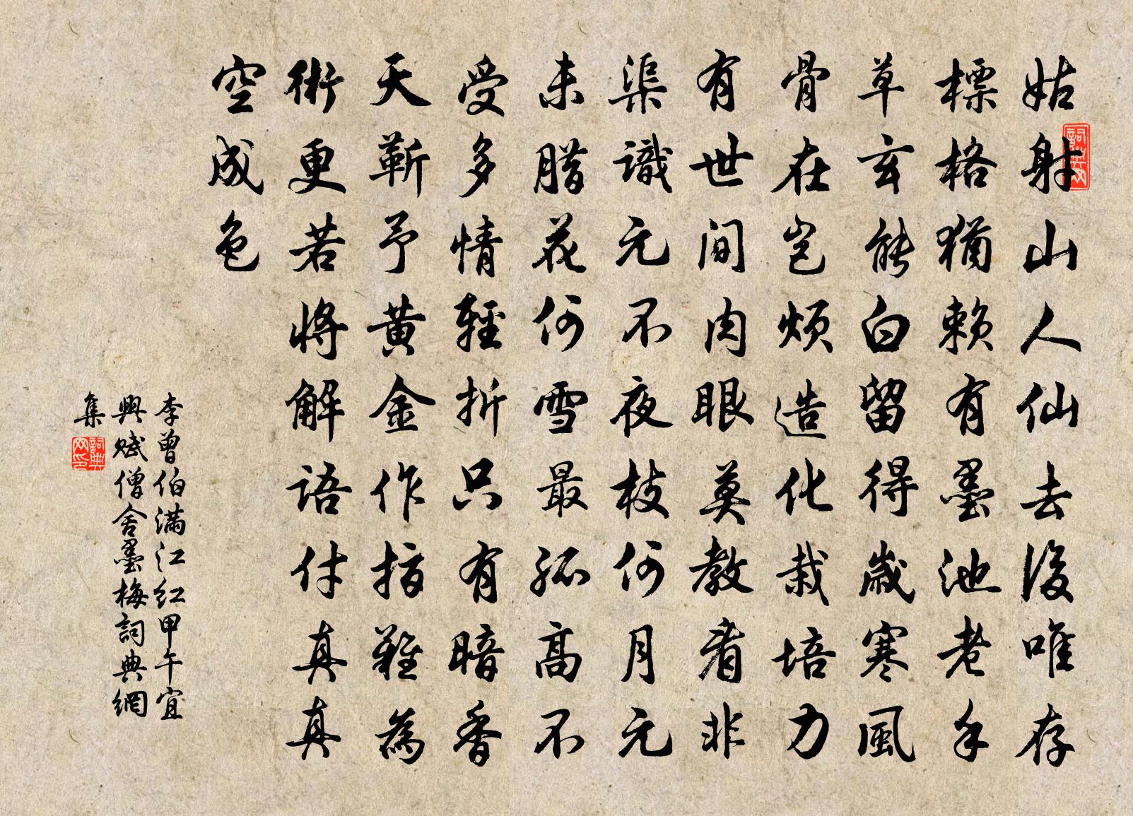 詩詞名句歷史字典書法欣賞書法字典國語詞典說文解字康熙字典古漢語字典標 題 作 者 詩 句 滿江紅(甲午宜興賦僧舍墨梅)作者:李曾伯 朝代:宋代原文姑射山人,仙去後、唯存標格。猶賴有、墨池老手,草玄能白。留得歲寒風骨在,豈煩造化栽培力。有世間、肉眼莫教看,非渠識。元不夜,枝何月。元未臘,花何雪。最孤高不受,多情輕折。只有暗香天靳予,黃金作指難為術。更若將、解語付真真,空成色。詩詞問答問:《滿江紅(甲午宜興賦僧舍墨梅)》的作者是誰?答:李曾伯問:該詩寫於哪個朝代?答:宋代書法欣賞滿江紅(甲午宜興賦僧舍墨梅)書法作品詩詞推薦香山范成大〔宋代〕抖擻軒裳一哄塵,任教空翠滴烏巾。老身已到籃輿上,處處青山是故人。楚望史彌寧〔宋代〕樓上詩聲繚屋樑,樓前寒葉舞秋光。明霞點破江碧聊,斷雁叫群驚夕陽。太常樂章三十首其二十七第二楊億〔宋代〕偃伯靈台,功成作樂。以昭德容,以清戎索。萬邦會同,群慝簫勺。盡善盡美,侔彼韶箾。山中感友生見訪釋智圓〔宋代〕講餘多滯疾,林下掩重扉。度日人稀到,殘陽鳥獨歸。山光來有勢,雲影去何依。世態那堪說,唯君念息機。題黃唐伯一經堂楊萬里〔宋代〕人言天地生仲尼,不知仲尼生兩儀。易中先自有太極,生天生地誰得知。一經以後脈為六,六經以前一經足。學子送從弟歸河朔李嘉祐〔唐代〕故鄉那可到,令弟獨能歸。諸將矜旄節,何人重布衣。空城流水在,荒澤舊村稀。秋日平原路,蟲鳴桑葉飛。過吳門二十四韻李紳〔唐代〕煙水吳都郭,閶門架碧流。綠楊深淺巷,青翰往來舟。朱戶千家室,丹楹百處樓。水光搖極浦,草色辨長洲。憶作換巢鸞鳳(梅意花庵作春情)史達祖〔宋代〕人若梅嬌。正愁橫斷塢,夢繞溪橋。倚風融漢粉,坐月怨秦簫。相思因甚到纖腰。定知我今,無魂可銷。佳期晚,寄王提舉何夢桂〔宋代〕地到偏方苦雪霜,蒼生寒谷望春陽。一麾使節來天上,萬口行碑在路傍。里役莊成民弛擔,關征法簡旅行糧。只今送洪景盧舍人北使周必大〔宋代〕嘗記揮毫草檄初,必知鳴鏑集單于。由來筆下三千牘,可勝軍中十萬夫。已許乞盟朝渭上,不妨持節過幽都。吾君江皋贈別韋莊〔唐代〕金管多情恨解攜,一聲歌罷客如泥。江亭系馬綠楊短,野岸維舟春草齊。帝子夢魂煙水闊,謝公詩思碧雲低,風前客亭陸游〔宋代〕荻浦煙汀並海涯,一枝柔櫓語咿啞。久從野老非生客,慣寓僧廬勝在家。乘興村村俱有酒,逢春處處可尋花。朝來送鄉友歸釋文珦〔宋代〕青春欲盡時,鳥啼花亂飛。共起思鄉恨,君歸吾未歸。臨分重執手,老淚涇荷衣。虞師晉師滅夏陽穀梁赤〔先秦〕非國而曰滅,重夏陽也。虞無師,其曰師,何也?以其先晉,不可以不言師也。其先晉何也?為主乎滅夏陽也。夏定風波(獨登多景樓)仲殊〔宋代〕花戟雲幡擁上方。畫簾風細度春香。銀 * 前多遠景。人靜。鐵城西面又斜陽。山色入江流不盡,古今一夢莫思量因官人請陞座釋重顯〔宋代〕曉天雲靜冷涵霜,滿檻風清敵夜光。莫謂座間人不識,孤明孤影射虛堂。聞許棠及第因寄桂雍貫休〔唐代〕時清道合出塵埃,清苦為詩不仗媒。今日桂枝平折得,幾年春色並將來。勢扶九萬風初極,名到三山花正開。更有慕巢尚書書雲室人慾為置一歌者,非所安也。白居易〔唐代〕東川已過二三春,南國須求一兩人。富貴大都多老大,歡娛太半為親賓。如愁翠黛應堪重,買笑黃金莫訴貧。他日生查子趙師俠〔宋代〕庭虛任雀喧,院靜無人到。回首十年非,賴得知幾早。心隨香篆銷,意與梅花好。萬事轉頭空,一笑吾身老。亥月徐璣〔宋代〕亥月霜澄霽,幽窗晚更明。文書隨意閱,蘭菊與心清。洗硯須池暖,燃香得火輕。妻拿渾笑我,作計亦平平。名句推薦君行四月草萋萋,柳花桃花半委泥。納蘭性德《送蓀友》 藏世界於一粟,佛法何其大;貯乾坤於一壺,道法何其玄。程登吉《幼學瓊林·卷四·釋道鬼神》 青楓颯颯雨淒淒,秋色遙看入楚迷。李攀龍《送明卿之江西》 儉節則昌,淫佚則亡。墨子《墨子·06章 辭過》 又疑瑤台鏡,飛在青雲端。李白《古朗月行》 恨身翻不作車塵,萬里得隨君。歐陽炯《巫山一段雲·春去秋來也》 三山半落青天外,二水中分白鷺洲李白《登金陵鳳凰台》 山明水淨夜來霜,數樹深紅出淺黃。劉禹錫《秋詞二首》 鴻羽難憑芳信短,長安猶近歸期遠。盧祖皋《倦尋芳·香泥壘燕》 殊方日落玄猿哭,舊國霜前白雁來。杜甫《九日五首·其一》