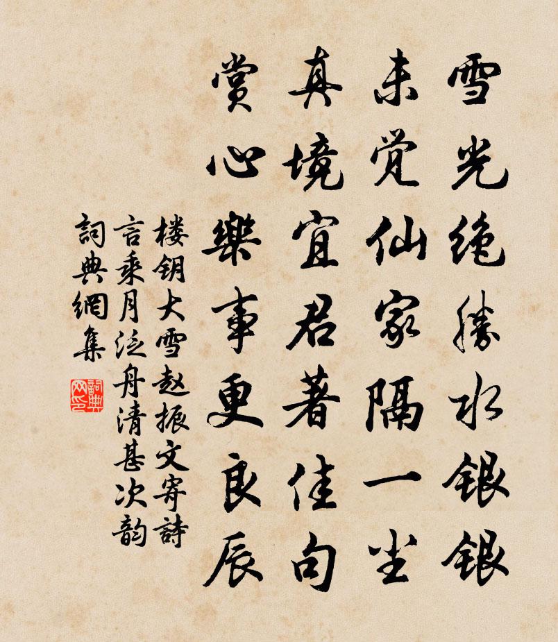 詩詞名句歷史字典書法欣賞書法字典國語詞典說文解字康熙字典古漢語字典標 題 作 者 詩 句 大雪趙振文寄詩言乘月泛舟清甚次韻作者:樓鑰 朝代:宋代原文雪光絕勝水銀銀,未覺仙家隔一塵。真境宜君著佳句,賞心樂事更良辰。詩詞問答問:《大雪趙振文寄詩言乘月泛舟清甚次韻》的作者是誰?答:樓鑰問:該詩寫於哪個朝代?答:宋代書法欣賞大雪趙振文寄詩言乘月泛舟清甚次韻書法作品詩詞推薦次韻韓子師雪中二首韓元吉〔宋代〕九門疊璧耀朝暾,不比千燈作上元。天與蕊珠開漢殿,人將冰玉奉堯樽。寒威已覺邊聲靜,春意都隨詔語溫。夜入次韻吳僧魁一山十絕方回〔宋代〕七十三回生一陽,子年未半升我堂。筠溪牧潛即汝是,一系驢橛須耐霜。點絳唇 上太夫人壽王寂〔元代〕阿母瑤池,夢迴風露青冥曉。六宮儀表。曹大家風好。滿眼兒孫,大國金花誥。頭如葆。未嘗聞道。冷笑西河老。戲謝富相公惠班筍三首邵雍〔宋代〕應物功夫出世間,豈容人可強躋攀。我儂自是不知量,增塿須求比泰山。擬古陸游〔宋代〕坐臥北窗下,百事廢不治。脫粟與大布,衣食裁自支。溫飽豈不欲,違道予心悲。地下見先人,所冀尚有辭。鶴沖天(大石調)柳永〔宋代〕閒窗漏永,月冷霜花墮。悄悄下簾幕,殘燈火。再三追往事,離魂亂、愁腸鎖。無語沈吟坐。好天好景,未省展眉昨雖移韻於蘭然石鼎聯章不可以不成也再賦一鄭清之〔宋代〕好惡移人信有力,宮姬尚取崑崙織。剛姿未必廣平愛,皓首誰憐趙岐息。夷車衡茝蓀芷荃,富矣離騷夸博識。靈均吳武氏表兄廖行之〔宋代〕我家蒸湘東復東,君嘗過我從嫗翁。我時總角君未冠,相與遊戲如鴻濛。無何君作十年別,遠指沅水雲能窮。兒時上清喻良能〔宋代〕積雨新晴翠靄浮,好風掖我上清游。白頭捧檄真聊爾,那忍深文學杜周。題方仙翁點易圖陸宗亮〔宋代〕雲鎖瑤扉童未起,樹搖涼露鶴初還。曲肱道士清溪水,心在羲皇未畫前。醉吟五首方回〔宋代〕淵明年十九,謝公破苻堅。此時尚可為,未及出仕年。太傅一丘志,永言負東山。道子國寶輩,日趣晉祚遷。參軍送秦鍊師陳陶〔唐代〕紫府靜沈沈,松軒思別吟。水流寧有意,雲泛本無心。錦洞桃花遠,青山竹葉深。不因時賣藥,何路更相尋。送別史友六首敖陶孫〔宋代〕諸君置膜外論,之子真箇中人。冀北何限千駟,東市初逢一麟。正旦呈諸僚友張伯玉〔宋代〕拂霧酴酥酒滿巡,越山如鬣水如鱗。日邊雖望龍庭遠,海上初傳鳳歷新。好景融融來破雪,和風細細欲黏人。莫言南浦(洞天)史浩〔宋代〕一箭舜弦風,向曉來、輕寒初報麥秀。蝶股歇花須,韶光老,鶯聲倦聞呼友。池塘綠暗,數竿粉節天然瘦。對茲美奉和幸大薦福寺(寺乃中宗舊宅)趙彥昭〔唐代〕寶地龍飛後,金身佛現時。千花開國界,萬善累皇基。北闕承行幸,西園屬住持。天衣拂舊石,王舍起新祠。剎鳳晨起出南堂陸游〔宋代〕曉枕華胥誰喚回,下堂拽杖一悠哉!啼鴉已逐晨光起,飛鷺初沖宿靄來。石路少行生蔓草,柴扉多閉長莓苔。身閒絕句二首張耒〔宋代〕門前山樹插雲青,雨足山前稻水平。桑柘半空蠶事了,綠陰深處囀殘鶯。菊無可〔唐代〕東籬搖落後,密艷被寒催。夾雨驚新拆,經霜忽盡開。野香盈客袖,禁蕊泛天杯。不共春蘭並,悠揚遠蝶來。風入松趙聞禮〔宋代〕麴塵風雨亂春晴。花重寒輕。珠簾卷上還重下,怕東風、吹散歌聲。棋倦杯頻晝永,粉香花艷清明。十分無處著閒名句推薦憑高遠望,見家鄉、只在白雲深處。王瀾《念奴嬌·避地溢江書於新亭》 野客預知農事好,三冬瑞雪未全消。戴復古《除夜》 不可同日而語畢沅《續資治通鑑·宋紀·宋紀七十三》 官無常貴而民無終賤。有能則舉之,無能則下之。墨子《墨子·08章 尚賢(上)》 古之為政,愛人為大戴聖《禮記·哀公問》 留春不住,費盡鶯兒語。王安國《清平樂·春晚》 一晌憑欄人不見,鮫綃掩淚思量遍。馮延巳《鵲踏枝·梅落繁枝千萬片》 來是空言去絕蹤,月斜樓上五更鐘。李商隱《無題四首》 侯門一入深如海,從此蕭郎是路人。崔郊《贈去婢》 事業文章隨身銷毀,而精神萬古如新洪應明《菜根譚·概論》