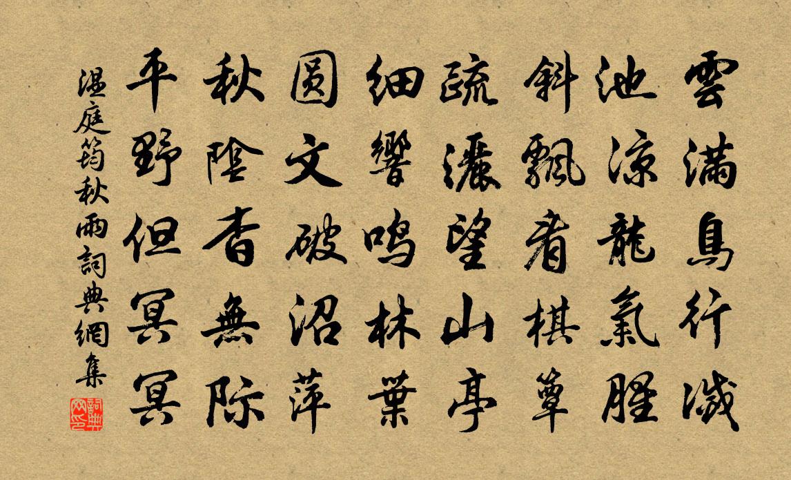 詩詞名句歷史字典書法欣賞書法字典國語詞典說文解字康熙字典古漢語字典標 題 作 者 詩 句 秋雨作者:溫庭筠 朝代:唐代秋雨原文雲滿鳥行滅,池涼龍氣腥。斜飄看棋簟,疏灑望山亭。細響鳴林葉,圓文破沼萍。秋陰杳無際,平野但冥冥。詩詞問答問:秋雨的作者是誰?答:溫庭筠問:秋雨寫於哪個朝代?答:唐代問:秋雨是什麼體裁?答:五律問:溫庭筠的名句有哪些?答:溫庭筠名句大全溫庭筠秋雨書法欣賞秋雨書法作品注釋全唐詩:卷583-3詩詞推薦鸚鵡曲馮子振〔元代〕逃吳辭楚無家住。解寶劍贈津父。十年間隸越鞭荊,怒卷秋江潮雨。想空城組練三千,白馬素車回去。又逡巡月上東林寺酬韋丹刺史靈澈〔唐代〕年老心閒無外事, * 草座亦容身。相逢盡道休官好,林下何曾見一人。謝送蠟梅三首曾幾〔宋代〕天將何物染江梅,白玉花成栗玉開。一種暗香全似舊,小罌和雪送春來。七夕蒲壽宬〔宋代〕盈盈一水望牽牛,欲渡銀河不自由。月照纖纖織素手,為君裁出翠雲裘。答胡叔賢周必大〔宋代〕朱顏青綬憶秦淮,白鷺洲疑鰲駕來。側畔交遊欣作者,中間賡和負康哉。新春漸覺風光好,陳跡時將日記開。惟有鷓鴣天(不寐)辛棄疾〔宋代〕老病那堪歲月侵。霎時光景值千金。一生不負溪山債,百藥難治書史淫。隨巧拙,任浮沈。人無同處面如心。不妨無夢令馬鈺〔元代〕二鼓孤清妙用。顛倒倒顛看供。遍地長黃芽,便覺箇中無夢。無夢。無夢。八味水流梁棟。偈頌一百零二首釋紹曇〔宋代〕祖翁田地絕邊垠,契券分明孰敢侵。削盡春風閒草木,松濤翻月竹篩金。潼川路施運判生日魏了翁〔宋代〕朔歇饕寒凝不禁,地雷應合戰群陰。悠悠未快功名手,渺渺誰覘造物心。三壽作朋剛已復,二陽初動卦為臨。經綸翰林侍讀學士尚書右丞李公輓辭三首蘇頌〔宋代〕儒雅名公子,承平輔相孫。台儀尊右轄,世職重高門。富貴今如夢,便蕃歿有恩。邇英前席地,無復進嘉言。次韻答賈耘老蘇軾〔宋代〕五年一夢南司州,饑寒疾病為子憂。東來六月井無水,仰看古堰橫奔牛。平生管鮑我知子,今日陳蔡誰從丘。夜航白石岩錢文婉〔宋代〕兩道蟠溪鎖碧山,飄然仙帶綠迴環。千岩林木溝渠下,萬頃滄田指掌間。霜月天邊清興遠,金鐘雲里夢魂間。夕陽答歐陽宅之周必大〔宋代〕安流咫尺異逾淮,有興何妨疊棹來。茗椀茅柴殊易耳,萍虀豆粥豈難哉。談鋒不怕通宵直,燕席寧辭逐日開。況是海棠周弼〔宋代〕海棠最佳須老叢,遠及百年花始紅。歷看名葩此為盛,剛柯硬葉交相映。倚石攢青二三丈,雨膏倒吸胭脂上。仿佛漁家傲(福建道中)陳與義〔宋代〕今日山頭雲欲舉。青蛟素鳳移時舞。行到石橋聞細雨。聽還住。風吹卻過溪西去。我欲尋詩寬久旅。桃花落盡春無爛柯山汪忱〔宋代〕山作危梁千尺橫,一天金泛月波清。幽禽不復驚棋響,深谷猶能答斧聲。塔壞尚余鴻雁意,井荒誰放轆轤鳴。試將燕台四首夏李商隱〔唐代〕前閣雨簾愁不捲,後堂芳樹陰陰見。石城景物類黃泉,夜半行郎空柘彈。綾扇喚風閶闔天,輕帷翠幕波淵旋。蜀魂齊天樂(螢)王沂孫〔宋代〕碧痕初化池塘草,熒熒野光相趁。扇薄星流,盤明露滴,零落秋原飛磷。練裳暗近。記穿柳生涼,度荷分暝。誤我登鳳凰樓再依李白鳳凰台韻乾隆〔清代〕謫仙當日事狂游,槌碎黃鶴夸風流。有無較版則且置,格高興逸吞山邱。故宮登樓名偶似,遠眺欲見蓬瀛洲。陡思授經台(乃南山一峰耳,非復有築處。)蘇軾〔宋代〕劍舞有神通草聖,海山無事化琴工。此台一覽秦川小,不待傳經意已空。名句推薦修竹畔,疏簾里。歌余塵拂扇,舞罷風掀袂。謝逸《千秋歲·詠夏景》 已知泉路近,欲別故鄉難。夏完淳《別雲間》 秋風別蘇武,寒水送荊軻。庾信《擬詠懷二十七首·其二十六》 若非群玉山頭見,會向瑤台月下逢李白《清平調·其一》 翠貼蓮蓬小,金銷藕葉稀。李清照《南歌子·天上星河轉》 落魄江南載酒行,楚腰纖細掌中輕。杜牧《遣懷》 金陵津渡小山樓,一宿行人自可愁。張祜《題金陵渡》 脫衣換得商山酒,笑把離騷獨自傾。王禹偁《清明日獨酌》 夜雪初霽,薺麥彌望。姜夔《揚州慢·淮左名都》 若言琴上有琴聲,放在匣中何不鳴?蘇軾《琴詩》