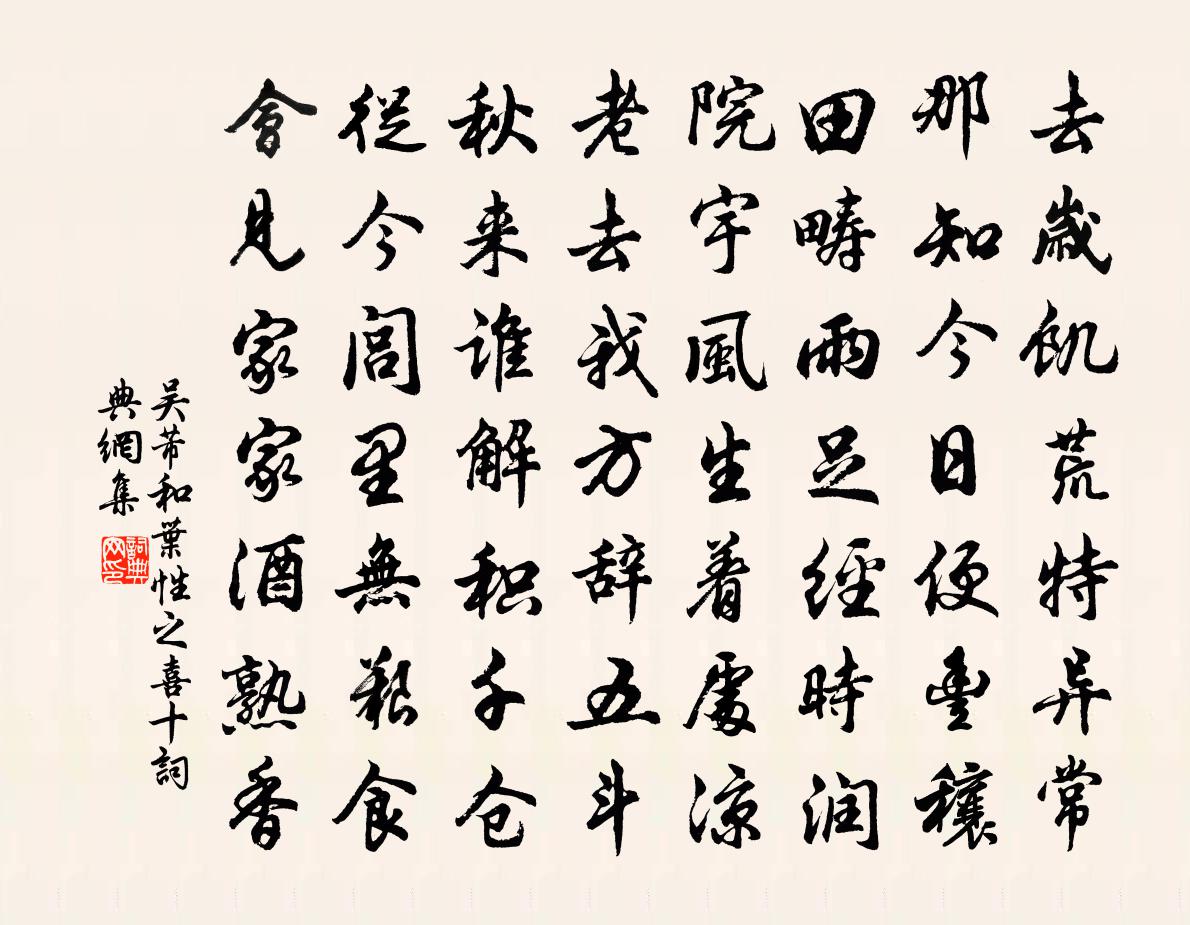 詩詞名句歷史字典書法欣賞書法字典國語詞典說文解字康熙字典古漢語字典標 題 作 者 詩 句 和葉性之喜十作者:吳芾 朝代:宋代和葉性之喜十原文去歲饑荒特異常,那知今日便豐穰。田疇雨足經時潤,院宇風生著處涼。老去我方辭五斗,秋來誰解積千倉。從今閭里無艱食,會見家家酒熟香。詩詞問答問:和葉性之喜十的作者是誰?答:吳芾問:和葉性之喜十寫於哪個朝代?答:宋代吳芾和葉性之喜十書法欣賞和葉性之喜十書法作品詩詞推薦壬子歲雲峰寫望汪莘〔宋代〕西極層雲最上層,碧雲峰著白雲楞。六龍頂佩斜陽下,恰似青紗一點燈。看書有感羅公升〔宋代〕齠齔趨庭日,真期萬里程。開編十行下,刻燭五言成。頗笑阿時學,方懷覽古情。只言如昨日,不悟已前生。客里澗錄招飲次日乃生朝葛天民〔宋代〕平生南磵古遺民,初度招呼我輩人。每聽謔談須絕倒,極知老氣政輪囷。杯盤滿坐添燈火,兒女成行勸主賓。但願滿江紅華岳〔宋代〕……正秋容萬里,十分明潔。后羿久忘逃去處,東方尚憶來年月。但無端、燕賀賦聲詩,容凡客。禁直寄崔員外鄭畋〔唐代〕銀台樓北蕊珠宮,夐與人間路不同。在省五更春睡侶,早來分夢玉堂中。頌古四十五首釋如珙〔宋代〕問你地藏知不知,下頭註腳萬千千。算沙入海徒疲倦,不若教他了目前。減字木蘭花 自詠王哲〔元代〕小名十八。讀至孝經章句匝。為慶清朝。愛向樽前舞六么。呼盧總會。六隻骰兒三沒賽。傻得唯新。刮鼓叢中第一木蘭花/玉樓春莫將〔宋代〕少陵長被花為惱。況是梅花非草草。臨歧爭奈不吟詩,此度詩人宜可老。詩成莫惜尊罍倒。不醉花前花解笑。醒時蝶戀花 青田舟中宋褧〔元代〕無數好山攢碧樹。山下郵亭,亭下牽舟路。山色娛人相指顧。時時又被灘聲妒。寒日光陰容易度。雲去雲來,那更直廬閒二首程珌〔宋代〕紫宸朝退曉光寒,百吏奔曹一吏閒。便可雲卿稱散秩,柰何名籍尚人間。武康碧落觀胡傳美〔唐代〕仙宮碧落太微書,遺蹟依然掩故居。幢節不歸天杳邈,煙霞空鎖日幽虛。不逢金簡扳雲洞,可惜瑤台疊蘚除。欲脫後過書塢夜坐周南〔宋代〕下駕官橋黃峴東,二十五里名新豐。慈竹色如蘆葦白,石楠頂結櫻朱紅。紙灰養火冬將盡,趺坐看書暖漸融。且蓄小重山(農人以夜雨晝晴為夜春)趙師俠〔宋代〕樂歲農家喜夜春。朝來收宿霧,快新晴。雲移日轉午風輕。香羅薄,喧暖困遊人。積水滿春塍。綠波翻鬱郁,露秧已亥雜詩 75龔自珍〔清代〕不能古雅不幽靈,氣體難躋作者庭。毀殺流傳遺下女,自障紈扇過旗亭。前日石上松王安石〔宋代〕前日石上松,斸移沙水際。青青折釵股,俯映幽人砌。蟠根今鬯茂,落子還蒼翠。三年一楮葉,世事真期費。篔簹谷二首竹答文同〔宋代〕我實仙陂百世孫,二年生長感君恩。近聞官滿將歸去,更望臨時莫洗園。御舟應制曹勛〔宋代〕玉蓮翠葉粲成川,十里湖光碧浸天。桂楫壓波橫斷浦,鉤簾絲管接薰弦。送師相陳大觀文喻良能〔宋代〕化國熙熙日自遲,棠陰無訟草含滋。何人剩伐南山石,大刻詳書德政碑。惱從兄李群玉〔唐代〕芳草萋萋新燕飛,芷汀南望雁書稀。武陵洞裡尋春客,已被桃花迷不歸。初成遺老齋待月軒藏書室三首其三藏書室蘇轍〔宋代〕讀書舊破十年功,老病茫然萬卷空。插架都將付諸子,閉關猶得養衰翁。案頭螢火從乾死,窗里飛蠅久未通。自見名句推薦晴浦晚風寒,青山玉骨瘦。董以寧《卜運算元·雪江晴月(回文,倒讀《巫山一段雲》 只解沙場為國死,何須馬革裹屍還。徐錫麟《出塞》 君子之心事,天青日白,不可使人不知洪應明《菜根譚·概論》 不吹毛而求小疵,不洗垢而察難知。韓非及後人《韓非子·大體》 橫笛驚征雁,嬌歌落塞雲。岑參《奉陪封大夫九日登高》 湖清霜鏡曉,濤白雪山來。李白《送友人尋越中山水》 臥看滿天雲不動,不知雲與我俱東。陳與義《襄邑道中》 剛待不思量,吹一片、簫聲過牆。項鴻祚《太常引·客中聞歌》 邯鄲驛里逢冬至,抱膝燈前影伴身。白居易《邯鄲冬至夜思家》 陰陰溪曲綠交加,小雨翻萍上淺沙。晁沖之《春日·陰陰溪曲綠交加》