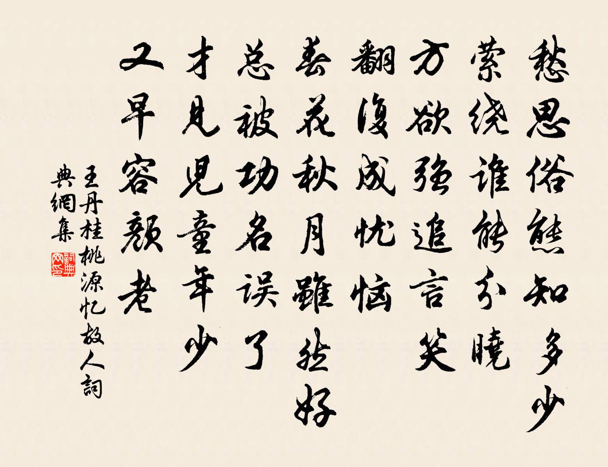 詩詞名句歷史字典書法欣賞書法字典國語詞典說文解字康熙字典古漢語字典標 題 作 者 詩 句 桃源憶故人作者:王丹桂 朝代:元代桃源憶故人原文愁思俗態知多少。縈繞誰能分曉。方欲強追言笑。翻復成憂惱。春花秋月雖然好。總被功名誤了。才見兒童年少。又早容顏老。詩詞問答問:桃源憶故人的作者是誰?答:王丹桂問:桃源憶故人寫於哪個朝代?答:元代問:桃源憶故人是什麼體裁?答:詞王丹桂桃源憶故人書法欣賞桃源憶故人書法作品詩詞推薦夢蝶柯夢得〔宋代〕一覺千年一轉機,覺來還是夢還非。當時夢裡如為蝶,便好穿花傍水飛。冬日寄住庵僧釋子淳〔宋代〕落葉積莓苔,柴扉半不開。幽林雲密覆,花鳥恨空來。偈頌一百六十首釋宗杲〔宋代〕水底泥牛嚼生鐵,憍梵缽提咬著舌。海神怒把珊瑚鞭,須彌山王痛不徹。追餞正輔表兄至博羅賦詩為別蘇軾〔宋代〕孤臣南遊墮黃菅,君亦何事來牧蠻。艤舟蜑戶龍岡窟,置酒椰葉桄榔間。高談已笑衰語陋,傑句尤覺清詩孱。博羅塞下感懷朱慶餘〔唐代〕塞下閒為客,鄉心豈易安。程塗過萬里,身事尚孤寒。竟日風沙急,臨秋草木殘。何年方致主,時拂劍塵看。自九里平水至雲門陶山歷龍瑞禹祠而歸凡四日陸游〔宋代〕我來恰值暮春初,晝漏微長小雨余。苔蝕秦碑亡舊刻,龍歸禹穴護遺書。燕巢已壘泥猶濕,花片雖殘葉尚疏。到處從駕游內苑應制岳飛〔宋代〕敕報游西內,春光靄上林。花圍千朵錦,柳捻萬株金。燕繞龍旗舞,鶯隨鳳輦吟。君王多雨露,化育一人心。清平樂 送張都事子敬秩滿北歸 天下同文盧摯〔元代〕朱弦三嘆。寶瑟凝塵滿。更奈芙蓉秋思晚。湘浦離歌欲斷。往年尊俎風流。憶君送客江樓。此日江縷送客,忘懷賴挽林法曹實甫二首劉克莊〔宋代〕昔我叨馳馹,惟君伴聚螢。病翁尚佔畢,良友忽幽冥。古有東方贊,今無貞曜銘。不知吟幾些,叫得屈原醒。金剛隨機無盡頌能淨業障分第十六釋印肅〔宋代〕花殘晚壑風,煙寺一聲鍾。若能從此人,直下悟心宗。偈頌七十六首釋子益〔宋代〕古佛心,即於今。春風浩浩,春雨霖霖,高山流水少知音。答判班孫待制見寄歐陽修〔宋代〕三朝竊寵幸逢辰,晚節恩深許乞身。無用物中仍老病,太平時得作閒人。鳴琴酌酒留嘉客,引水栽花過一春。惟恨寄贈柳殿院開授崇儀使赴邊上潘閬〔宋代〕從來長見說兵機,今日君恩志豈違。驄馬不騎騎鐵馬,繡衣休掛掛戎衣。雄師已聽心皆伏,醜虜將聞魄盡飛。應笑漁家傲郭應祥〔宋代〕白古餘杭多俊俏。風流不獨夸蘇小。又見尊前人窈窕。花枝裊。貪看忘卻朱顏老。曲巷橫街深更杳。追歡買笑須年浪淘沙劉禹錫〔唐代〕八月濤聲吼地來,頭高數丈觸山回。須臾卻入海門去,捲起沙堆似雪堆。和左司張員外自洛使入京中路先赴長安…韋侍御等諸公孫逖〔唐代〕忽睹雲間數雁回,更逢山上正花開。河邊淑氣迎芳草,林下輕風待落梅。秋憲府中高唱入,春卿署里和歌來。共言起來許月卿〔宋代〕起來霜月冷颼颼,清興催人不自由。萬戶千門胡蝶夢,五更三點黑貂裘。旦公待旦霜如雪,時夜如詩月似鉤。明日贈薛鼎臣侍御(一作送劉崇德尉睦州建德縣)張祜〔唐代〕一命前途遠,雙曹小邑閒。夜潮人到郭,春霧鳥啼山。淺瀨橫沙堰,高岩峻石斑。不堪曾倚棹,猶復夢升攀。萬年宮張仲信〔宋代〕頻將衣食結圜圊,天樂旌幢降彩雲。二十四年功行滿,眾真推讓武夷宮。次韻毛君山房即事十首蘇轍〔宋代〕案牘稀疏意自開,夜闌幽夢曉方回。青苔紅葉騷人事,時見詩簡去又來。東晉仙人借舊山,定應天意許公閒。郡人名句推薦華表月明歸夜鶴,嘆當時、花竹今如此吳文英《金縷歌·陪履齋先生滄浪看梅》 江頭宮殿鎖千門,細柳新蒲為誰綠?杜甫《哀江頭》 內官初賜清明火,上相閒分白打錢。韋莊《長安清明》 誠信者,天下之結也。管仲《管子·樞言》 寒蟬淒切,對長亭晚,驟雨初歇。柳永《雨霖鈴·寒蟬淒切》 年年越溪女,相憶采芙蓉。杜荀鶴《 * 怨》 往年同在鸞橋上,見倚朱闌詠柳綿。韓偓《寒食日重遊李氏園亭有懷》 違山十里,蟪蛄之聲,猶在於佚名《孔子家語·子路初見》 葉潤林塘密,衣乾枕席清。杜甫《水檻遣心二首》 戚施不可使仰左丘明《國語·晉語·胥臣論教誨之力》