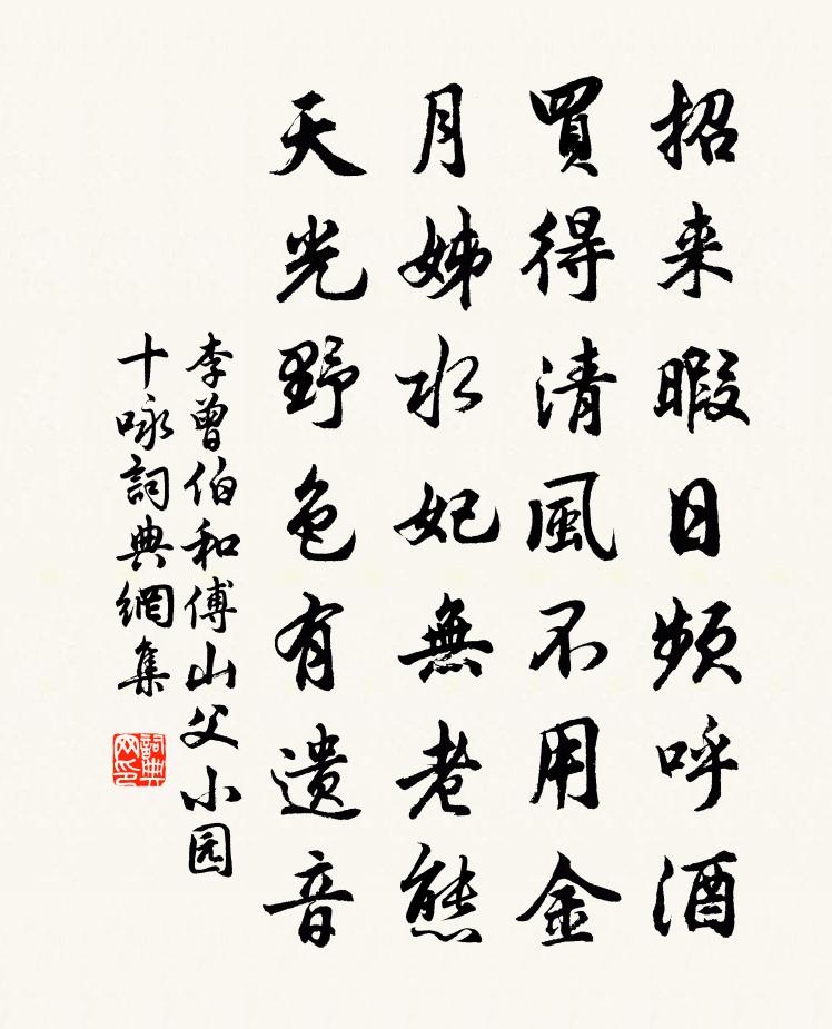 詩詞名句歷史字典書法欣賞書法字典國語詞典說文解字康熙字典古漢語字典標 題 作 者 詩 句 和傅山父小園十詠作者:李曾伯 朝代:宋代和傅山父小園十詠原文招來暇日頻呼酒,買得清風不用金。月姊水妃無老態,天光野色有遺音。詩詞問答問:和傅山父小園十詠的作者是誰?答:李曾伯問:和傅山父小園十詠寫於哪個朝代?答:宋代李曾伯和傅山父小園十詠書法欣賞和傅山父小園十詠書法作品詩詞推薦句 * 彥〔宋代〕已聽恩波生茗椀,更看皇澤下雞竿。滿江紅·倦客新豐辛棄疾〔宋代〕倦客新豐,貂裘敝、征塵滿目。彈短鋏、青蛇三尺,浩歌誰續。不念英雄江左老,用之可以尊中國。嘆詩書、萬卷送杜兵侍以華文待制知遂寧府魏了翁〔宋代〕敝貂沖寒馬聲濕,餘杭門外送歸客。去年曾送六朱幡,今年又送四千石。更有三令相後先,采不盈筐去如織。蒙蒙記牡丹事二首劉克莊〔宋代〕西洛名園墮劫灰,揚州風物更堪哀。縱攜買笑千金去,難喚能行一朵來。尚書汪公得請奉祠餞者十有四人分韻賦某得敢呂祖謙〔宋代〕鼎食味苦濃,藿食味苦淡。同生不同嗜,羊棗與昌歜。孰能游其間。進退兩無憾。尚書古仙伯,雅尚本真澹。禁塗仙跡岩題詩二十三首經閣佚名〔宋代〕寶閣莊嚴金玄耀,風鈴震響玉丁東。甍飛傑出青霄上,道典珍藏在此中。閒賦姜特立〔宋代〕人生浮脆若風煙,障簏操籌亦可憐。但得樽中長有酒,不須身後更留錢。頌古八首釋元聰〔宋代〕因我得禮你,莫放屁撒屎。帶累天下人,錯認自家底。懷蔣力父鑒倉王邁〔宋代〕人生聚散類團沙,偶得聊驂餞歲華。竹杖徐忘了木橋,村醪小酌勝如茶。鄉情喜似輕千里,詩味相投各一家。便好題馬遠畫冊五首宋高宗〔宋代〕不禱自安緣壽骨,人間難得是清名。淺斟仙酒紅生頰,永保長生道自成。送循倅黃必昌之官李昴英〔宋代〕好風佳月說龍川,人喜新來別乘賢。才盡優為千里式,學今有用四書全。黃門祠下揮吟筆,丞相嶺頭先著鞭。莫但燕山亭(中秋諸王席上作)曾覿〔宋代〕河漢風清,庭戶夜涼,皓月澄秋時候。冰鑒乍開,跨海飛來,光掩滿天星斗。四卷珠簾,漸移影、寶階鴛甃。還又游洞岩徐文卿〔宋代〕跨馬絕風煙,夜與雲俱宿。彈琴向窗間,微月掛森木。曉行岩上路,一溪緣淨綠。路窮入其中,溪流貫山腹。岩開題質龜軒李新〔宋代〕百歲才容山鬼知,九淵那許季鹹窺。事明告我肯三瀆,謀既協人何兩疑。曳尾詎堪從太史,刳腸猗嘆漏神蓍。試看莞山淨明庵小參示眾釋曇華〔宋代〕三十三州七十僧,驢腮馬頷得人憎。諸方若具羅籠手,今日無因到淨明。瀟湘齊己〔唐代〕寒清健碧遠相含,珠媚根源在極南。流古遞今空作島,逗山沖壁自為潭。遷來賈誼愁無限,謫過靈均恨不堪。畢竟十疊劉克莊〔宋代〕才得幾朝渾拆遍,只消一霎又吹空。何曾學舞能回雪,便不為台與避風。代書答姜七崔九張說〔唐代〕婀娜金閨樹,離披野田草。雖殊兩地榮,幸共三春好。花殊鳥飛處,葉鏤蟲行道。真心獨感人,惆悵令人老。奉和御製冊府元龜了畢夏竦〔宋代〕文德洽隆平,蓬山蠹簡盈。漢金方盡購,秦石諒難程。稽古承先志,宣猷聚世英。刊修百家備,紬繹十年成。休汰過猷講主桑瀆精舍陸游〔宋代〕寂寞衡門傍水開,放翁曳杖此徘徊。林疏時見釣篷過,風急忽聞菱唱來。講罷繩床懸塵柄,齋余童子供茶杯。解衣名句推薦天上若無修月戶,桂枝撐損向西輪。米芾《中秋登樓望月》 泥落畫梁空,夢想青春語。吳文英《生查子·秋社》 無田似我猶欣舞,何況田間望歲心。曾幾《蘇秀道中》 少壯不努力,老大徒傷悲!佚名《長歌行》 移舟水濺差差綠,倚檻風擺柄柄香鄭谷《蓮葉》 同是人,類不齊,流俗眾,仁者希。李毓秀《弟子規·親仁》 近水知魚性,近山識鳥音。佚名《增廣賢文·上集》 春風倚棹闔閭城,水國春寒陰復晴。劉長卿《別嚴士元》 世間花葉不相倫,花入金盆葉作塵。李商隱《贈荷花》 和平處事,勿矯俗為高;正直居心,勿設機以為智。王永彬《圍爐夜話·第六五則》