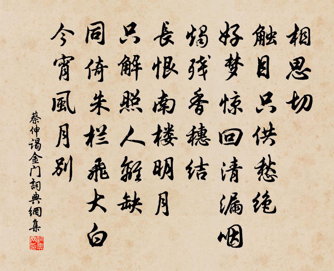 詩詞名句歷史字典書法欣賞書法字典國語詞典說文解字康熙字典古漢語字典標 題 作 者 詩 句 謁金門作者:蔡伸 朝代:宋代謁金門原文相思切。觸目只供愁絕。好夢驚回清漏咽。燭殘香穗結。長恨南樓明月。只解照人離缺。同倚朱欄飛大白。今宵風月別。詩詞問答問:謁金門的作者是誰?答:蔡伸問:謁金門寫於哪個朝代?答:宋代問:謁金門是什麼體裁?答:詞蔡伸謁金門書法欣賞謁金門書法作品詩詞推薦浣女詞楊維楨〔元代〕處女溪邊浣,使君溪上游。使君來乞飲,瓢棄在沙頭。李公擇過高郵見施大夫與孫莘老賞花詩憶與仆蘇軾〔宋代〕汝陽真天人,絹帽著紅槿。纏頭三百萬,不買一微哂。共夸青山峰,曲盡花不隕。當時謫仙人,逸韻謝封畛。詩成踏莎行洪邁〔宋代〕院落深沈,池塘寂靜。簾鉤卷上梨花影。寶箏拈得雁難尋,篆香消盡山空冷。釵鳳斜敧,鬢蟬不整。殘紅立褪慵看瀑布二首王阮〔宋代〕造物小兒不任事,一天元氣從淋漓。雲中雨降自應爾,山上水行誰激之。幽林洶洶虛籟作,赫日粲粲寒光垂。謫仙歸來王冕〔元代〕頭白歸來驚面生,東家西家知我名。友朋投老漸凋落,兒女向年俱長成。野梅花開尚古色,山風吹雨墮寒聲。最喜晁子綺建炎民謠〔宋代〕晁子綺,澶淵{今河南濮陽西}人。詠之孫{《宋詩紀事補遺》卷四九}。無調名 誓丹陽王哲〔元代〕子孫入道,七祖出離地獄。子孫得道,九祖生天。如退道,累祖先。雜言示子聿陸游〔宋代〕福莫大於不材之木,禍莫慘於自躍之金。鶴生於野兮何有於軒?桐爨則已兮豈慕為琴?古今共戒玉自獻,卷舒要似山居遣興釋紹嵩〔宋代〕百衲老空林,疏慵倦九箴。浮沉千古事,去住兩鄉心。絕頂無禪侶,忘言有匣琴。感多聊自遣,時復一閒吟。白鷺洲余懷〔清代〕洲前白鷺幾時飛?芳草王孫歸未歸?二水依然台下過,阿誰演念家山破。重陽高適〔唐代〕節物驚心兩鬢華,東籬空繞未開花。百年將半仕三已,五畝就荒天一涯。豈有白衣來剝啄,一從烏帽自欹斜。真成頌古三十二首釋明辯〔宋代〕鶖子已圓無漏種,換卻身形總不知。通途一貫非他物,午夜胡僧步雪歸。喜故人至王操〔宋代〕地僻無賓侶,柴門晝始開。雞山寒葉落,江國故人來。話舊驚霜鬢,論詩滯酒杯。相留喜同宿,不寐曙光回。句賀德英〔宋代〕易描通臂狀,難寫斷腸聲。只因錯寫天文表,流落人間一紀零。浣沙溪趙彥端〔宋代〕水到桐江鏡樣清。有人還似水清明。尊前無語更盈盈。翠袖舞衫何日了,白頭歸去幾時成。老來猶有惜花情。梁鼓吹曲 鶴樓峻沈約〔南北朝〕鶴樓峻。連翠微。因嚴設險池永歸。唇亡齒懼。薄言震。耀靈威。凶眾稽顙。天不能違。金湯無所用。功烈長巍巍題詩長老壁楊時〔宋代〕維摩病士意超然,邊腹便便但晝眠。共說平時忙底事,烹茶煮藥過殘年。留春令朱彝尊〔清代〕針樓殘燭,鏡台剩粉,醉眠曾許。長記羅賬夢回初,響幾點催花雨。別淚連絲繁主薄,剩定情詩句。一樣霜天月仍虔州景德寺榮師湛然堂蘇軾〔宋代〕卓然精明念不起,兀然灰槁照不滅。方定之時慧在定,定慧寂照非兩法。妙湛總持不動尊,默然真入不二門。語息詠鄰女東窗海石榴李白〔唐代〕魯女東窗下,海榴世所稀。珊瑚映綠水,未足比光輝。清香隨風發,落日好鳥歸。願為東南枝,低舉拂羅衣。無由名句推薦喜得故人同待詔,擬沽春酒醉京華。高啟《清明呈館中諸公》 千里搭長棚,沒有不散的筵席。曹雪芹《紅樓夢·第七十二回》 半竿落日,兩行新雁,一葉扁舟。賀鑄《眼兒媚·蕭蕭江上荻花秋》 旅客三秋至,層城四望開。杜審言《登襄陽城》 不義不昵,厚將崩。左丘明《左傳·隱公·隱公元年》 柳外斜陽,水邊歸鳥,隴上吹喬木。辛棄疾《念奴嬌·登建康賞心亭呈史致道留守》 恨蕭蕭、無情風雨,夜來揉損瓊肌。李清照《多麗·詠白菊》 弟子入則孝,出則弟,謹而信,泛愛眾,而親仁,行有餘力,則以學文。孔子弟子《論語·學而篇》 丈夫志,當景盛,恥疏閒。蘇舜欽《水調歌頭·滄浪亭》 君子不自大其事,不自尚其功戴聖《禮記·表記》