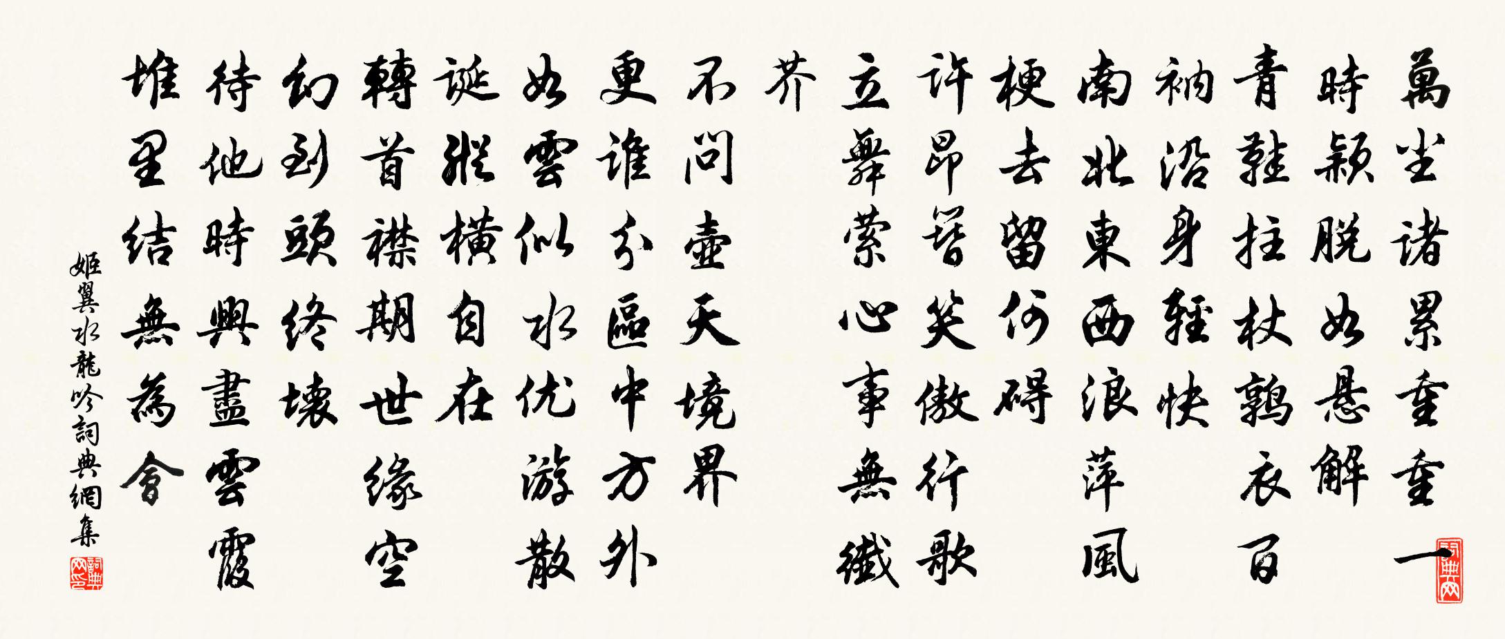 詩詞名句歷史字典書法欣賞書法字典國語詞典說文解字康熙字典古漢語字典標 題 作 者 詩 句 水龍吟作者:姬翼 朝代:元代水龍吟原文萬塵諸累重重,一時穎脫如懸解。青鞋拄杖,鶉衣百衲,沿身輕快。南北東西,浪萍風梗,去留何礙。許昂簪笑傲,行歌立舞,縈心事,無纖芥。不問壺天境界。更誰分、區中方外。如雲似水,優遊散誕,縱橫自在。轉首襟期,世緣空幻,到頭終壞。待他時興盡,雲霞堆里,結無為會。詩詞問答問:水龍吟的作者是誰?答:姬翼問:水龍吟寫於哪個朝代?答:元代問:水龍吟是什麼體裁?答:詞姬翼水龍吟書法欣賞水龍吟書法作品詩詞推薦奉和御製要毬徐鉉〔唐代〕上閒精習渥窪驄,玉鏤花鞍錦覆騣。金埒無塵初裛,朱旗向日自生風。雷傳畫鼓偏增氣,星度飛毬欲映空。共道宸月洲李賈友山捧檄來淦訪我梅下示教禁休物語鄒登龍〔宋代〕庭前有奇樹,幽艷發寒柯。寂寂眾芳歇,綿綿生意多。孤根依嶺表,高節委岩阿。清友今何在,悠悠空逝波。寄戲劉道淵陳襄〔宋代〕陸羽茶亭枕水隈,為言無酒且徘徊。山中此物尤難得,應是劉生不肯來。江陵洪咨夔〔宋代〕三海先聲壯,重城大勢連。竹為人世界,燈結水因緣。風物詩囊裹,英雄淚眼邊。江平洲露碧,沙市穩開舡。詠懷八十二首·其七十九阮籍〔魏晉〕林中有奇鳥,自言是鳳凰。清朝飲醴泉,日夕棲山岡。高鳴徹九州,延頸望八荒。適逢商風起,羽翼自摧藏。一去送李雲在學錄牟巘五〔宋代〕橫經之暇即吟詩,三載如常匪激隨。聽雨不知官獨蛉,看雲自與意俱遲。翬飛黌宇生新敬,鵠立儒衣動去思。還恐雜詠五言八首劉克莊〔宋代〕埋向西陵里,千年不復晨。未知台上妓,歌舞樂何人。石傘峰書堂祖無擇〔宋代〕伊人高步接夔龍,舊隱荒涼石傘峰。莘野躬耕聞往事,傳岩代築見遺蹤。草茅豈合掩崇業,竹帛終能紀茂庸。朝暮和津喜雪二首吳芾〔宋代〕六花一夜降中天,飛繞吾廬頓滿前。紀出仙家新窟宅,疑非塵世舊山川。但驚岩上青松老,不見天邊白雁連。賴有尉侄寄百雀圖劉克莊〔宋代〕猶子知余嗜,封來半尺綃。誰將一兔穎,寫作百鷦鷯。具體侔針粟,卑飛集葦苕。笑他九萬里,辛苦上雲霄。嘉興界葉紹翁〔宋代〕平野無山見盡天,九分蘆葦一分煙。悠悠綠水分枝港,撐出南鄰放鴨船。太湖詩銷夏灣皮日休〔唐代〕太湖有曲處,其門為兩崖。當中數十頃,別如一天池。號為銷夏灣,此名無所私。赤日莫斜照,清風多遙吹。沙嶼辟陽城高適〔唐代〕荒城在高岸,凌眺俯清淇。傳道漢天子,而封審食其。 * 且不戮,茅土孰雲宜。何得英雄主,返令兒女欺。母儀滿江紅 送徐大山姚燧〔元代〕崇仁送行役,回首十周星。因今常武丞去,衣繡記曾經。西北桃源山峻,東北洞庭春盡,浩浩際滄溟。鄂渚玉薪米訓兒童兒首人子陳淳〔宋代〕人子勤於孝,無時志不存。夜來安寢息,早起問寒暄。逢鄉友齊己〔唐代〕無況來江島,逢君話滯留。生緣同一國,相識共他州。竹影斜青蘚,茶香在白甌。猶憐心道合,多事亦冥搜。中興樂(即濕羅衣)牛希濟〔唐代〕池塘暖碧浸晴暉,濛濛柳絮輕飛。紅蕊凋來,醉夢還稀。春雲空有雁歸,珠簾垂。東風寂寞,恨郎拋擲,淚濕羅衣問答梅堯臣〔宋代〕金鑿落,留贈行人須滿酌。銀缾況有宜城醪,及取春風花照灼。天香·詠龍涎香王沂孫〔宋代〕孤嶠花蟠煙,層濤蛻月,驪花夜采鉛水。訊遠槎風,夢深薇露,化作斷魂心字。紅瓷侯火,還乍識、冰環玉指。一送趙進臣持閩憲節陳文蔚〔宋代〕任官自古惟賢材,天子耳目寄外台。祥刑所擊切民命,可不於此欽恤哉。猗嗟東南俗脆弱,獨有閩嶺高崔嵬。山川名句推薦燕語如傷舊國春,宮花一落已成塵。李益《隋宮燕》 人不通今古,馬牛如襟裾。佚名《增廣賢文·上集》 春愁凝思結眉心,綠綺懶調紅錦薦。顧敻《玉樓春·拂水雙飛來去燕》 余凡事喜獨出己見,不屑隨人是非。沈復《浮生六記·浪遊記快》 君子以同道為朋,小人以同利為朋脫脫《宋史·列傳·卷七十八》 紫燕一雙嬌語碎,翠屏十二晚峰齊,夢魂消散醉空閨。毛熙震《浣溪沙·花榭香紅煙景迷》 青山朝別暮還見,嘶馬出門思舊鄉。李頎《送陳章甫》 池邊釣女日相隨,妝成照影竟來窺孟浩然《高陽池送朱二》 綠葉翠莖,冒霜停雪。左思《三都賦》 支離東北風塵際,漂泊西南天地間。杜甫《詠懷古蹟五首·其一》
