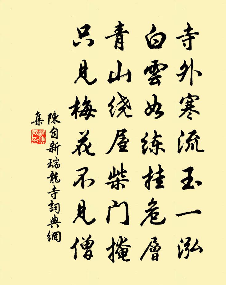 詩詞名句歷史字典書法欣賞書法字典國語詞典說文解字康熙字典古漢語字典標 題 作 者 詩 句 瑞龍寺作者:陳自新 朝代:宋代瑞龍寺原文寺外寒流玉一泓,白雲如練掛危層。青山繞屋柴門掩,只見梅花不見僧。詩詞問答問:瑞龍寺的作者是誰?答:陳自新問:瑞龍寺寫於哪個朝代?答:宋代陳自新瑞龍寺書法欣賞瑞龍寺書法作品詩詞推薦與潘述集湯衡宅懷李司直縱聯句皎然〔唐代〕幽獨何以慰,友人顧茅茨。——湯衡已忘歲月念,載說清閒時。——潘述旭日舒朱槿,柔風引綠葹。——皎然迢迢飯昭果寺張耒〔宋代〕飄然乘興游,殽酒笑俗具。僧居致野飯,草草亦有趣。山僧慣迎客,煮茗新泉注。岩花得春遲,晚秀見紅素。蕭蕭嘉魚池寧某〔宋代〕四百峰巒隱畫屏,翠光樓閣起山溟。高侔太岳千山小,勢鎮乾坤萬古青。石洞猿啼煙月落,嘉池龍起水雲腥。臨流次韻和盛博士寄贈李四寺丞因以述懷楊億〔宋代〕錢郎滿腹貯精神,坐上詩成壓倒人。相識祇從拋竹馬,留歡長是膾金鱗。西園宴喜期清夜,曲水追隨約暮春。不到廣陵贈別李白〔唐代〕玉瓶沽美酒,數里送君還。系馬垂楊下,銜杯大道間。天邊看淥水,海上見青山。興罷各分袂,何須醉別顏。木蘭花令王觀〔宋代〕銅駝陌上新正後。第一風流除是柳。勾牽春事不如梅,斷送離人強似酒。東君有意偏撋就。慣得腰肢真箇瘦。阿誰西江月張孝祥〔宋代〕汗鑄九金神鼎,隋書小字蓮經。剛風劫火轉清冥。護守應煩仙聖。昨夢歸來帝所,今朝壽我親庭。只將此寶伴長生正月二日葛天民〔宋代〕小巷春陰獨掩扉,峭寒著盡過冬衣。老來情緒無多子,禁得梅花似雪飛。詠酒二首汪遵〔唐代〕九醞松醪一曲歌,本圖閒放養天和。後人不識前賢意,破國亡家事甚多。萬事銷沈向一杯,竹門啞軋為風開。秋宵六十五春寒吟七首方回〔宋代〕病骨春寒欠酒澆,關山滿眼雁程遙。有人恨過江淹賦,何處魂堪宋玉招。六十五翁來日短,百千萬事迅風瓢。平生藍橋驛見元九詩白居易〔唐代〕藍橋春雪君歸日,秦嶺秋風我去時。每到驛亭先下馬,循牆繞柱覓君詩。瑞鷓鴣華岳〔宋代〕華月樓前見玉容。鳳釵斜褪鬢雲松。梅花體態香凝雪,楊柳腰肢瘦怯風。幾向白雲尋楚□,難憑紅葉到吳宮。別來村舍雜書陸游〔宋代〕讀書乃一癖,我亦不自知。坐書窮至老,更欲傳吾兒。吾兒復當傳,百世以為期。君看北山公,太行尚可移。後苑賞花應製楊億〔宋代〕雲羅霞綺媚芳辰,瓊圃花開爛漫春。風遞清香隨鳳輦,波涵倒影落龍津。仙葩四照烘初日,濃艷千苞賜近臣。向晚送春林景熙〔宋代〕蜀魄聲聲訴綠陰,誰家門巷落花深。遊絲不系春暉住,愁絕天涯寸草心。送翁員外承贊黃滔〔唐代〕誰言吾黨命多奇,榮美如君歷數稀。衣錦還鄉翻是客,回車謁帝卻為歸。鳳旋北闕虛丹穴,星復南宮逼紫微。已分歲旦立春張鎡〔宋代〕讚美平時萬口同,聳觀造化協天功。聖朝家法皆仁德,寬大應符帝詔中。前太守仲求石問留題因和三首吳芾〔宋代〕不解追時好,尤非治郡才。故山猿鶴怨,應怪未怪來。村居吳可〔宋代〕鑿井耕田僅萬家,農夫農婦畢絲麻。夜來得雨陂塘足,村北村南罷踏車。泗州除夜雪中黃師是送酥酒二首蘇軾〔宋代〕暮雪紛紛投碎米,春流咽咽走黃沙。舊遊似夢徒能說,逐客如僧豈有家。冷硯欲書先自凍,孤燈何事獨成花。使君名句推薦為學日益,為道日損。損之又損,以至於無為。老子《老子·德經·第四十八章》 飛花兩岸照船紅,百里榆堤半日風。陳與義《襄邑道中》 何當共剪西窗燭,卻話巴山夜雨時。李商隱《夜雨寄北》 獨行潭底影,數息樹邊身。賈島《送無可上人》 因思杜陵夢,鳧雁滿回塘。溫庭筠《商山早行》 路出寒雲外,人歸暮雪時。盧綸《李端公 / 送李端》 林外鳴鳩春雨歇,屋頭初日杏花繁。歐陽修《田家》 春悄悄,夜迢迢。碧雲天共楚宮遙。晏幾道《鷓鴣天·小令尊前見玉簫》 花隱掖垣暮,啾啾棲鳥過。杜甫《春宿左省》 佇立傷神。無奈輕寒著摸人。朱淑真《減字木蘭花·春怨》