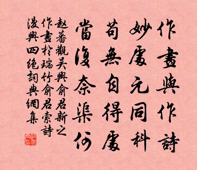 詩詞名句歷史字典書法欣賞書法字典國語詞典說文解字康熙字典古漢語字典標 題 作 者 詩 句 觀吳興俞君新之作畫於瑞竹俞君索詩漫興四絕作者:趙蕃 朝代:宋代原文作畫與作詩,妙處元同科。苟無自得處,當復奈渠何。詩詞問答問:《觀吳興俞君新之作畫於瑞竹俞君索詩漫興四絕》的作者是誰?答:趙蕃問:該詩寫於哪個朝代?答:宋代書法欣賞觀吳興俞君新之作畫於瑞竹俞君索詩漫興四絕書法作品詩文賞析【原題】:觀吳興俞君新之作畫於瑞竹俞君索詩漫興四絕句詩詞推薦臨江仙·鬥草階前初見晏幾道〔宋代〕鬥草階前初見,穿針樓上曾逢。羅裙香露玉釵風。靚妝眉沁綠,羞臉粉生紅。流水便隨春遠,行雲終與誰同。酒醒次韻韓川奉祠西太乙宮四首黃庭堅〔宋代〕泰壇下瑞雲黃,雨師灑道塵香。便面猶承墜露,金鉦半吐東牆。落花強至〔宋代〕林間花自飛,物理不應悲。偶對飄殘地,休論艷發時。有情香水面,無數點河湄。蜂蝶含餘意,徘徊繞舊枝。次王狀元晚菊二絕喻良能〔宋代〕並與杞同賦,舊嘗聞雪堂。先生澹無欲,亦復愛清香。記夢晁說之〔宋代〕山上多曲木,澗底有勁草。乃知窮達性,多隨勢所到。此語自夢中,景物殊浩浩。頗逢平生人,嘆息老非少。獨不送高郎中北使杜審言〔唐代〕北狄願和親,東京發使臣。馬銜邊地雪,衣染異方塵。歲月催行旅,恩榮變苦辛。歌鐘期重錫,拜手落花春。月蝕詩盧仝〔唐代〕新天子即位五年,歲次庚寅,斗柄插子,律調黃鐘。森森萬木夜僵立,寒氣贔屓頑無風。爛銀盤從海底出,出來照時平後春日思歸劉長卿〔唐代〕一尉何曾及布衣,時平卻憶臥柴扉。故園柳色催南客,春水桃花待北歸。嘲苗振王逵〔宋代〕伯起雄豪世莫偕,官高祿重富於財。田從汶上天出生,堂自明州地架來。十雙畫船風破浪,兩行紅粉夜傳杯。自憐送謝刑部使君赴召胡仲弓〔宋代〕擿奸方喜俗無嘩,一札飛來墨敕斜。職業已升金掌貴,吏民空擁彩旗遮。疑車趣召二千石,輿頌觀傳十萬家。桃李早行賈島〔唐代〕早起赴前程,鄰雞尚未鳴。主人燈下別,羸馬暗中行。蹋石新霜滑,穿林宿鳥驚。遠山鍾動後,曙色漸分明。和張文伯黃悅之席上賦雪王之道〔宋代〕功成三白到春回,好放雲天萬里開。今夜子猷方對客,卻煩安道過溪來。同君俞、季永步至普濟寺,晚泛西湖以歸,得楊萬里〔宋代〕閣日微陰不礙晴,杖藜小倦且須行。湖山有意留儂款,約束疏鍾未要聲。孝宗皇帝靈駕發引詩蔡戡〔宋代〕舜禹相傳日,元非倦萬幾。慈闈躬至養,別殿奉遺衣。易月心何忍,通喪禮不違。煌煌新廟號,萬古播音徽。和潘判官送酒韻王炎〔宋代〕由來高士憐曲糵,為有和氣如三春。一朝驟見四從事,使我頌德思伯倫。官醅亦自有妙理,風味不如家釀醇。掀髯十蟲吟舒岳祥〔宋代〕蟲有賣油公,什伍處陰濕。長腳如蠨蛸,愛莫能助細走不及。兒童反接之,邀其吐微汗。所挾雖不多,坐此遭攟拾滿庭芳(賞梅)葛立方〔宋代〕臘雪方凝,春曦俄漏,畫堂小秩芳筵。玉台仙蕊,簾外冪瑤煙。莫話青山萬樹,聊須對、一段孤妍。杯行處,香參景安和章來再次韻謝設醴四首陳造〔宋代〕道裝人映醉中姝,十二分行儼翠裾。遙想翻階麗清禁,似今群艷簉庭除。單于曉角武元衡〔唐代〕胡兒吹角漢城頭,月皎霜寒大漠秋。三奏未終天便曉,何人不起望鄉愁。馬上見華山強至〔宋代〕身寄秦川紫翠間,舉頭行坐對南山。忽來煙際逢仙掌,更覺天邊慰客顏。霖雨不知何日作,片雲猶向此時閒。三峰名句推薦紅橋路,正一派、畫船蕭鼓中流住。納蘭性德《摸魚兒·午日雨眺》 柳帶搖風漢水濱,平蕪兩岸爭勻。牛希濟《臨江仙·柳帶搖風漢水濱》 竹里繰絲挑網車,青蟬獨噪日光斜。李賀《南園十三首》 思君若汶水,浩蕩寄南征。李白《沙丘城下寄杜甫》 遊人不管春將老,來往亭前踏落花。歐陽修《豐樂亭遊春·其三》 語來江色暮,獨自下寒煙。李白《尋雍尊師隱居》 九萬里風鵬正舉。李清照《漁家傲·天接雲濤連曉霧》 相呴以濕,相濡以沫,不如相忘於江湖。莊子《莊子·內篇·大宗師》 遊絲冉冉花枝靜,青壁迢迢白鳥過。王守仁《春晴》 以卵投石也。盡天下之卵,其石猶是也,不可毀也墨子《墨子·47章 貴義》
