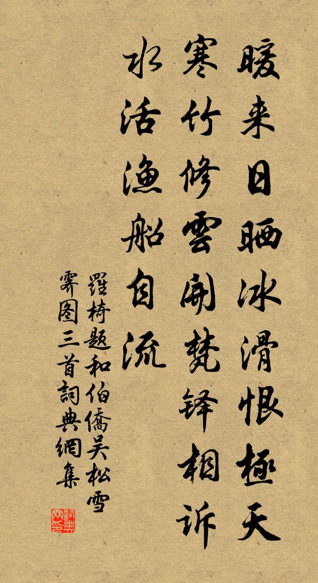 詩詞名句歷史字典書法欣賞書法字典國語詞典說文解字康熙字典古漢語字典標 題 作 者 詩 句 題和伯僑吳松雪霽圖三首作者:羅椅 朝代:宋代題和伯僑吳松雪霽圖三首原文暖來日曬冰滑,恨極天寒竹修。雲開梵鐸相訴,水活漁船自流。詩詞問答問:題和伯僑吳松雪霽圖三首的作者是誰?答:羅椅問:題和伯僑吳松雪霽圖三首寫於哪個朝代?答:宋代羅椅題和伯僑吳松雪霽圖三首書法欣賞題和伯僑吳松雪霽圖三首書法作品詩詞推薦和陳長卿五人同集韻王洋〔宋代〕愛廛書均宅畝,書雨矩漸經書營。湖泛書輕舟遁,峰排老岫嶸。牧之推上第,吏部絕心兵。列爵分全服,和聲奏大送胡康老王灼〔宋代〕北人事鞍馬,笑夸太行高。豈知相風色,孤帆寄江濤。雄圖攪方寸,不憚舟師勞。一見武功天,騰踏當有遭。皇崗遣興王柏〔宋代〕初向坡頭下,風霜入鬢毛。味長濡竹簡,焰短沃蘭膏。家與人俱瘦,年隨氣轉高。朱顏無藥駐,窗下勿徒勞。士穎弟作真率會次韻樓鑰〔宋代〕何羨祖希情好隆,朱陳累世意交通。舅甥巾屨頻相接,兄弟樽罍喜更同。參坐幸容攻愧子,主盟全賴適齋翁。日來病眼有作釋寶曇〔宋代〕短短秋檐合近書,經旬看碧卻成朱。半生始識空花面,咫尺還應拄杖扶。淚睫隕珠緣底事,金篦刮臘未全疏。自憐洛都游寓韋應物〔唐代〕東風日已和,元化亮無私。草木同時植,生條有高卑。罷官守園廬,豈不懷渴飢。窮通非所乾,跼促當何為。佳辰九日和於使君思上京親故靈澈〔唐代〕清晨有高會,賓從出東方。楚俗風煙古,汀洲草木涼。山情來遠思,菊意在重陽。心憶華池上,從容鴛鷺行。壽崔西清二首洪咨夔〔宋代〕武侯王佐材,有膽大如屋。愛之莫助之,只手挈全蜀。淋漓出師表,所舉良且淑。孔鸞非不佳,健翮欠鴻鵠。先生題湘中館楊萬里〔宋代〕江欲浮秋去,山能渡水來。娵隅蠻語雜,欸乃楚聲哀。寒早當緣閏,詩成未費才。愁邊正無柰,歡伯一相開。我豈望天門山李白〔唐代〕天門中斷楚江開,碧水東流至此回。兩岸青山相對出,孤帆一片日邊來。句陳公舉〔宋代〕清曉蛙聲引啼鴃,夕陽牛背立歸鴉。西江月(為趙元父賦雪梅圖)詹玉〔宋代〕裉粉輕盈瓊靨,護香重疊冰綃。數枝誰帶玉痕描。夜夜東風不掃。溪上橫斜影淡,夢中落莫魂銷。峭寒未肯放春嬌八景勝概劍峽遲鸞方鳳〔宋代〕峽中候帝子,青鳥空徘徊。搔首叩玄律,何當化鶴來。南征彭秋宇〔宋代〕聖皇神武志規恢,南國胡為貢未來。銅柱地荒雲隔斷,珠崖天盡雁飛回。秋風曾見秦師出,曉日今聞漢詔哀。中國示畫者劉克莊〔宋代〕眉宇巑屼鬢禿殘,愧君模寫向冰紈。削瓜古有形相肖,擲果今無眾聚觀。且可夷猶狎鷗鷺,不消夭矯比龍鸞。去為題隔師松齋張舜民〔宋代〕未解子荊流可枕,冷笑陶令琴無弦。臨流有耳安用洗,續弦得膠還自煎。不禁巢邊黃口鬧,不作竿上鮎魚緣。但欲梧桐陶夢桂〔宋代〕妝點山居要碧梧,向來培植費工夫。一株隨風成仙去,留得孫枝乞鳳雛。惠上人房宴別權德輿〔唐代〕方袍相引到龍華,支策開襟路不賒。法味已同香積會,禮容疑在少施家。逸民羽客期皆至,疏竹青苔景半斜。究竟宴交代寧國孟知府致語口號文天祥〔宋代〕玉堂學士催班鷺,粉省潛郎趣佩麟。來往神仙同碧落,後先岳牧總詞人。陽坡共喜瓜時及,朝路相期柳色新。握手還汪正夫山陽小集鄭獬〔宋代〕汪子文章何偉奇,如觀天子乘輿儀。怛然暴見殊驚疑,舌拄上齶兩目痴。定神屏氣試引窺,漸識羽衛行相隨。金吾名句推薦獨舞紛如雪,孤飛曖似雲。陳子昂《詠主人壁上畫鶴寄喬主簿崔著作》 馬逢伯樂而嘶,人遇知己而死。羅貫中《三國演義·第六十回》 自是浮生無可說。人間第一耽離別。王國維《蝶戀花·滿地霜華濃似雪》 驕奢淫逸,所自邪也。左丘明《左傳·隱公·隱公三年》 朝來嗔寂寞,不肯試新衣。馮夢龍《喻世明言·卷一》 還君明珠雙淚垂,恨不相逢未嫁時。張籍《節婦吟·寄東平李司空師道》 才可用者,非大害而隱忍。來俊臣《羅織經·治下卷第三》 十有九人堪白眼,百無—用是書生。黃景仁《雜感》 望處雨收雲斷,憑闌悄悄,目送秋光。柳永《玉蝴蝶·望處雨收雲斷》 欲知悵別心易苦,向暮春風楊柳絲。李白《下途歸石門舊居》