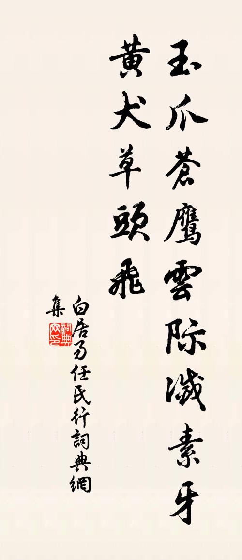 詩詞名句歷史字典書法欣賞書法字典國語詞典說文解字康熙字典古漢語字典標 題 作 者 詩 句 任氏行作者:白居易 朝代:唐代任氏行原文玉爪蒼鷹雲際滅,素牙黃犬草頭飛。詩詞問答問:任氏行的作者是誰?答:白居易問:任氏行寫於哪個朝代?答:唐代問:白居易的名句有哪些?答:白居易名句大全白居易任氏行書法欣賞任氏行書法作品詩詞推薦戊午三月晦二首司空圖〔唐代〕隨風逐浪劇蓬萍,圓首何曾解最靈。筆硯近來多自棄,不關妖氣暗文星。牛夸棋品無勍敵,謝占詩家作上流。豈似思故人華岳〔宋代〕芳酒一樽雖甚□,故人千里奈思何。柳挼池閣條偏細,花近檐楹香更多。九張機佚名〔宋代〕六張機。雕花鋪錦半離披。蘭房別有留春計。爐添小篆,日長一線,相對繡工遲。雜興宋祁〔宋代〕寒暑亟徂謝,日月如崩波。稚容不再妍,戚戚奈老何。聞有遯世客,安處西山阿。手操九籥契,晝夜養丹砂。藥成寄蕭國器李處權〔宋代〕路貧不在扊扅炊,調苦誰聞食菜時。枉道故於尋尺見,求人曷以斗升為。夷吾不去齊何患,叔向方來晉可知。得士送馬特失薦還蘇回舟中作強至〔宋代〕一客空歸顏色低,眾人氣亦喪虹霓。淚添酒盞霜天闊,目斷帆檣海日西。交臂散零如木葉,別腸縈轉似山蹊。遙知武陵春万俟詠〔宋代〕燕子飛來花在否,微雨退、掩重門。正滿院梨花雪照人。獨自個、怯黃昏。輕風淡月總消魂。羅衣暗惹啼痕。謾覷光化儲丈晨興摘郡圃桃見惠梅每顆有重十三兩劉學箕〔宋代〕金盤磊磈大如瓜,照乘驪珠未足夸。大矣芳苞美實,爛然紅臉璨朝霞。臙脂細擘漿流液,珠琲輕揮路帶華。一冼宿次韻徐廷獻機宜送自釀石室酒范成大〔宋代〕一語為君評石室,三杯便可博涼州。百年兀兀同渠住,何處能生半點愁?立春帖子皇帝閣周必大〔宋代〕暖律催花花,晴暉活柳枝。發生雖有信,造化本無私。始生七章章八句上皇子嘉王生辰陳傅良〔宋代〕獵人愛麛麌,漁人愛鯤鮞。萬物欣自遂,況也民秉彝。家有舉桉婦,人有譍門兒。王心至於此,壽不數耆頤。送湯中丞和蕃皇甫曾〔唐代〕繼好中司出,天心外國知。已傳堯雨露,更說漢威儀。隴上應回首,河源復載馳。孤峰問徒御,空磧見旌麾。春草雜興王昌齡〔唐代〕握中銅匕首,粉銼楚山鐵。義士頻報讎, * 不曾缺。可悲燕丹事,終被狼虎滅。一舉無兩全,荊軻遂為血。誠知對蓮花戲寄晁應之張耒〔宋代〕平池碧玉秋波瑩,綠雲擁扇青瑤柄。水宮仙女鬬新妝,輕步凌波踏明鏡。彩橋下有雙鴛戲,曾托鴛鴦問深意。半開偈頌一百三十六首釋惟一〔宋代〕生本不有,死亦無空。湖光晴瀲灩,山色雨蒙瀧。賦園中所有十首蘇轍〔宋代〕萱草朝始開,呀然黃鵠觜。仰吸日出光,口中爛如綺。纖纖吐須鬣,冉冉隨風哆。朝陽未上軒,粲粲幽閒女。美女生查子呂本中〔宋代〕殘春霧雨餘,小院黃昏後。說道覓新詞,把酒來相就。酴醿插髻雲,歲歲長如舊。不是做詞遲,卻怕添伊瘦。送公儀龍圖知杭州梅堯臣〔宋代〕在昔漢中微,我祖入吳門。公今領名都,千騎擁高軒。與古異出處,素節古本原。江觀白馬潮,水花長鯨奔。山飄別李十一五絕元稹〔唐代〕巴南分與親情別,不料與君床並頭。為我遠來休悵望,折君災難是通州。京城每與閒人別,猶自傷心與白頭。今日次同叔見寄二首胡仲弓〔宋代〕獨坐看詩話,瓶梅相對清。瓦燈寒不暈,雪屋夜偏明。煨栗填飢腹,煎茶長道情。睡魔排遣盡,窗外聽雞聲。名句推薦自是相思抽不盡,卻教風雨怨秋聲。鄭燮《詠芭蕉》 榮螈,蜥蜴。佚名《爾雅·釋魚》 坐上別愁君未見,歸來欲斷無腸。蘇軾《臨江仙·送王緘》 脊令各有思歸恨,日月相催雪滿顛。黃庭堅《次元明韻寄子由》 有大略者,不可責以捷巧;有小智者,不可任以大功。劉安及其門客《淮南子·主術訓》 美人結長想,對此心悽然。李白《折楊柳》 搜句忌於顛倒,裁章貴於順序劉勰《文心雕龍·章句》 棘枝風哭酸,桐葉霜顏高。孟郊《秋懷十五首》 龜言此地之寒,鶴訝今年之雪。庾信《小園賦》 誰分去來鄉國事,悽然,曾是承平兩少年。陳洵《南鄉子·己巳三月自郡城歸鄉過區菶吾西園話舊》