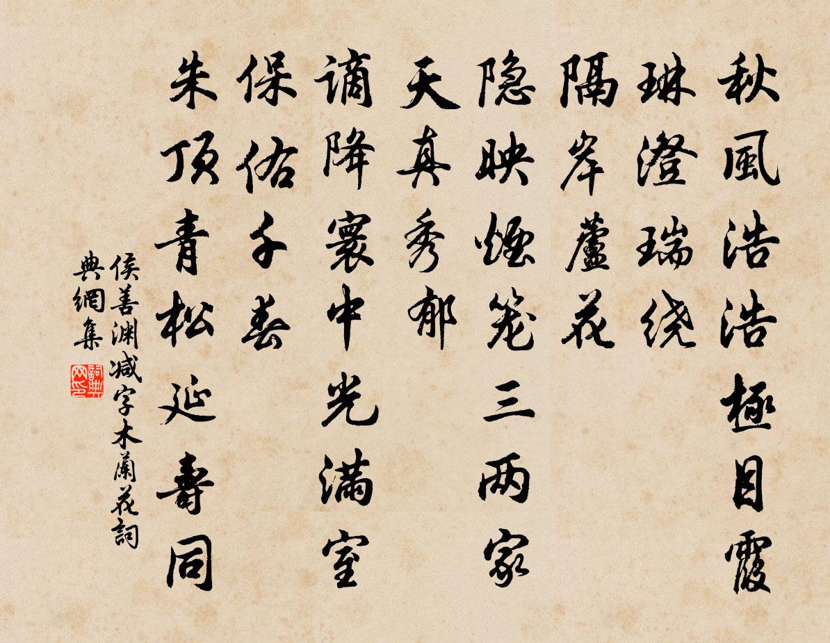 詩詞名句歷史字典書法欣賞書法字典國語詞典說文解字康熙字典古漢語字典標 題 作 者 詩 句 減字木蘭花作者:侯善淵 朝代:元代減字木蘭花原文秋風浩浩,極目霞琳澄瑞繞。隔岸蘆花。隱映煙籠三兩家。天真秀郁。謫降寰中光滿室。保佑千春。朱頂青松延壽同。詩詞問答問:減字木蘭花的作者是誰?答:侯善淵問:減字木蘭花寫於哪個朝代?答:元代問:減字木蘭花是什麼體裁?答:詞侯善淵減字木蘭花書法欣賞減字木蘭花書法作品詩詞推薦句劉筠〔宋代〕榮河帶繞中天閣,空樂星懸大士居。送別傅郎中安道持節閩中林光朝〔宋代〕忽然鄉思若為收,莫到三茅最上頭。二月樂甌看負弩,一天南盪想行舟。過家上冢從今數,落絮飛花合晝游。料得塘上閒作齊己〔唐代〕閒行閒坐藉莎煙,此興堪思二古賢。陶靖節居彭澤畔,賀知章在鏡池邊。鴛鴦著對能飛繡,菡萏成群不語仙。形影送劉德修殿院直閣將漕潼川二首楊萬里〔宋代〕半世西風吹盛名,晚同朝路慰平生。一言半語到金石,四海九州成弟兄。雪嶺錦城君理棹,青鞋黃帽我皈耕。長江和題溪莊趙希逢〔宋代〕遙望鞦韆露短牆,垂垂楊柳拂西慶。漲天無處著飛絮,過雨殘紅驚褪妝。禁火寒庖成辟穀,而飢醉腹喜如囊。人生題湖城縣西道中槐樹吳融〔唐代〕零落欹斜此路中,盛時曾識太平風。曉迷天仗歸春苑,暮送鸞旗指洛宮。一自煙塵生薊北,更無訊息幸關東。而今鷗鷺世界張煒〔宋代〕閒飛蘆葦疑成序,獨立菰蒲似不群。愁思無邊煙水闊,畫家詩境合平分。住東岩釋居靜〔宋代〕月生一,東岩乍住增愁寂。紅塵世路有多端,米麵倉儲無顆粒。崖為伴,泉為匹,颯颯清風來入室。山王地暗中忙紹興祀皇地祗十五首佚名〔宋代〕至厚至深,其動也剛。精誠默通,或出其藏。神之言歸,化斯有光。相我炎圃,萬世無疆。即事陸游〔宋代〕還鄉吳語熟,伏枕越吟悲。接客寒溫簡,過鄰几杖隨。獨嗟親舊少,不覺歲時移。陌上人爭看,風欹白接籬。醉眠亭張先〔宋代〕松陵江畔客,築室從何年。世俗徒紛紛,不知李子賢。在彼既不知,不如醉且眠。聲名袞袞誰知命,醉非愛酒眠非送嚴秀才下第東歸徐鉉〔唐代〕世胄今為旅,多才懶自營。坦懷君子道,惜別故人情。歸棹春潮滿,郊居海月明。雄文不輕售,須待最高名。春日王炎〔宋代〕小憑筍輿行稻田,麥芒桑蕾春無邊。勒迴風物未全好,小雨班班天護寒。入門烏鵲枝頭語,鴻雁好音慈母喜。車馬和張倅湖上十絕姜特立〔宋代〕夕寒山水閟清暉,歸到華堂月半扉。傾倒錦囊無賸語,風光那得更相違。四賓主賓中賓釋正覺〔宋代〕平生心事結眉頭,滿面風埃鬢已秋。大底出門無伎術,奈何今日路貧愁。鷓鴣天趙善括〔宋代〕畫鷁翩翩去似飛。季鷹何事忽思歸。風湍自送征帆隱,雲巘須將彩筆揮。江作酒,海為卮。為君滿酌不須辭。酒酣次韻前人醵更生會三首陳著〔宋代〕世變如輪到厄年,危魂飛繞萬山巔。冥心前路追陶令,回首中原屬漢淵。樹鵲頻驚枝上月,醯雞苟活瓮中天。悠悠送張翬下第歸江東蕭穎士〔唐代〕俱飛仍失路,彩服邇清波。地積東南美,朝遺甲乙科。客愁千里別,春色五湖多。明日舊山去,其如相望何。送盧管記仙客北伐沈佺期〔唐代〕羽檄西北飛,交城日夜圍。廟堂盛徵選,戎幕生光輝。雁行度函谷,馬首向金微。湛湛山川暮,蕭蕭涼氣稀。餞途金陵雜興二百首蘇泂〔宋代〕伯玉文章一世雄,買碑人去更無蹤。欲尋水館風亭處,只在西門折柳東。名句推薦素娥惟與月,青女不饒霜。李商隱《十一月中旬至扶風界見梅花》 力分者弱,心疑者背。尉繚《尉繚子·攻權》 桃花春色暖先開,明媚誰人不看來。周朴《桃花》 思悠悠,恨悠悠,恨到歸時方始休。白居易《長相思·汴水流》 記問之學,不足以為人師。戴聖《禮記·學記》 道存則國存,道亡則國亡。荀子《荀子·君道》 勿以身貴而賤人,勿以獨見而違眾。姜子牙《六韜·龍韜·立將》 王粲登臨寥落際。雁飛不斷天連水。王庭筠《鳳棲梧·衰柳疏疏苔滿地》 兩岸荔枝紅,萬家煙雨中。李師中《菩薩蠻·子規啼破城樓月》 義膽包天,忠肝蓋地,四海無人識。施耐庵《念奴嬌·天南地北》