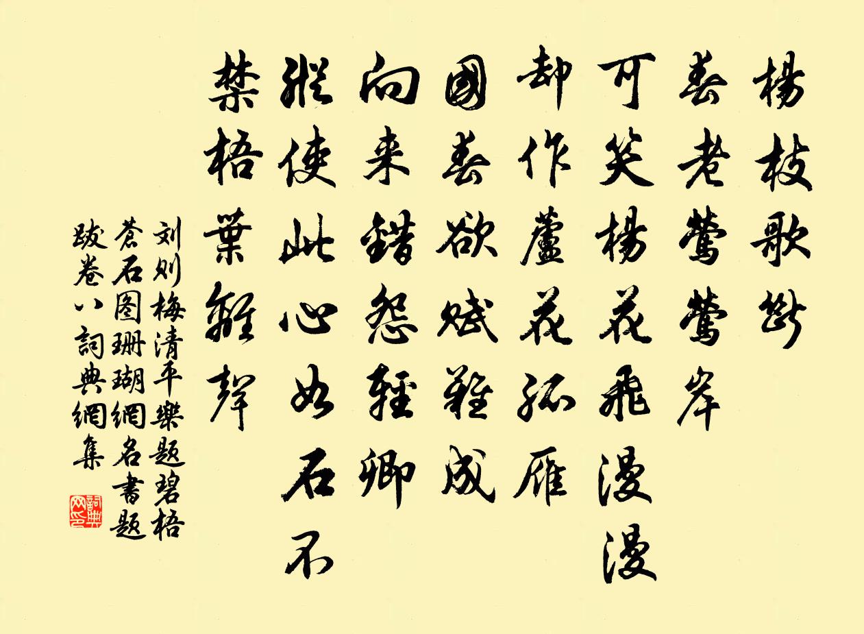 詩詞名句歷史字典書法欣賞書法字典國語詞典說文解字康熙字典古漢語字典標 題 作 者 詩 句 清平樂 題碧梧蒼石圖 珊瑚網名書題跋卷八作者:劉則梅 朝代:元代原文楊枝歌斷。春老鶯鶯岸。可笑楊花飛漫漫。卻作蘆花孤雁。國春欲賦難成。向來錯怨輕卿。縱使此心如石,不禁梧葉離聲。詩詞問答問:《清平樂 題碧梧蒼石圖 珊瑚網名書題跋卷八》的作者是誰?答:劉則梅問:該詩寫於哪個朝代?答:元代問:該詩是什麼體裁?答:詞書法欣賞清平樂 題碧梧蒼石圖 珊瑚網名書題跋卷八書法作品詩詞推薦次韻景仁飲宋溫之南軒二首蘇轍〔宋代〕白髮迎新歲,播然國老更。感時能細說,對酒任徐行。畫軸高分品,詩詞妙入評。疏狂先醉倒,應許恃鄉情。飲闌寄宋明府黃滔〔唐代〕北闕秋期南國身,重關煙月五溪雲。風蟬已有數聲急,賴在陶家柳下聞。春日雜興方岳〔宋代〕綠陰芳樹鳥啼春,與客相攜發興新。半落杏花初過雨,微酸梅子已生仁。每尋詩去必遷坐,穩跨牛歸不問津。筋力道中朱槔〔宋代〕疢憂倦征行,金火方牴牾。宵分餉群仆,乘月問前路。小兒何自至,檝我陳洲渡。暗浪擊層崖,平沙起驚鷺。奔蒼西園十詠方物亭吳中復〔宋代〕草林蟲魚部,披尋自古無。飛沉天產異,生植土風殊。物色隨心匠,形容記繪圖。虛亭玩真意,浩思滿江湖。江梅引王吉昌〔元代〕萬斜不作一靈孤。妙容模。契虛無。覺海縱橫,獨耀越驪珠。雲靜水寒無點翳,清淨體,穿山透壁殊。無人野上傲望前山雪寄葉山人蘇泂〔宋代〕煙雲出沒微微白,知道前山雪出來。應在山中望城郭,爛銀宮闕是蓬萊。定風波(次楊茶使七夕韻)京鏜〔宋代〕何必穿針上彩樓。剖瓜插竹訴窮愁。聞道天孫相會處,銀漢無津,不待泛蘭舟。動是隔年尋素約,何似,每逢清夢感皇恩(大石標韻)周邦彥〔宋代〕露柳好風標,嬌鶯能語。獨占春光最多處。淺顰輕笑,未肯等閒分付。為誰心子裡,長長苦。洞房見說,雲深無路勸農六首張嵲〔宋代〕皇恩力本勸農耕,老稚爭隨刺史行。楊柳垂村麴塵色,殊鄉時節近清明。再用前韻贈鹽城四士陳造〔宋代〕行李小盤薄,海西裨海東。交情半新故,生世有遇逢。從我二三子,草木臭味同。業工畫眉嫵,飾此水雪容。高軒江上寄山陰崔少府國輔孟浩然〔唐代〕春堤楊柳發,憶與故人期。草木本無意,榮枯自有時。山陰定遠近,江上日相思。不及蘭亭會,空吟祓禊詩。送德安五休司戶孫應時〔宋代〕相逢何必早,傾蓋已知心。璞玉常金質,高山流水音。眼中江漢闊,別後雪雲深。莫作窮途難,功名始自今。三段錦賈似道〔宋代〕麻頭青項翅銷金,休白牙長六足明。更有異常腰背闊,蜀川三段錦花名。頌古三十六首釋惟一〔宋代〕武帝求仟不得仟,王喬端坐卻升天。有心用處還應錯,無意求時又宛然。金州客舍方乾〔唐代〕卷箔群峰暮,蕭條未掩關。江流嶓冢雨,路入漢家山。落葉欹眠後,孤砧倚望間。此情偏耐醉,難遣酒罍閒。鳥夜啼 月下用前韻劉敏中〔元代〕夜深誰伴中庵。太初岩。滿酌一杯,和月吸濃嵐。瓊露滴。霜鬢濕。興方酣。不覺河傾東北,月西南。紹興送妻弟任縣尉歸邵武二首項安世〔宋代〕場屋追兄弟,閨門詫婦壬。傅家深屬契,為客細論心。何物尉乃勇,所居宜不侵。相期愛蜩甲,突兀看穹林。勸農有感三首高斯得〔宋代〕井卦分明說勞農,周人田制寓其中。但令此念純無已,可使吾民養不窮。數豆荒餐延野老,一篇腐語誨村童。爾忱過邢惇夫墓下作蔡肇〔宋代〕人物於今嘆渺然,孤墳宿草已生煙。日暮行人道傍會,應逢年少與談玄。名句推薦養心須淡泊,凡足以累吾心者勿為也。王永彬《圍爐夜話·第九八則》 金風玉露一相逢,便勝卻人間無數。秦觀《鵲橋仙·纖雲弄巧》 四寸之管無當,必不滿也。授官、予爵、出祿不以功,是無當也。商鞅《商君書·靳令》 不讓則不和,不和不可以遠征。左丘明《左傳·定公·定公五年》 娶妻無媒毋須恨,書中自有顏如玉。趙恆《勸學詩》 春風依舊。著意隨堤柳。趙令畤《清平樂·春風依舊》 黃河落天走東海,萬里寫入胸懷間。李白《贈裴十四》 月落烏啼霜滿天,江楓漁火對愁眠。張繼《楓橋夜泊 / 夜泊楓江》 今夜鄜州月,閨中只獨看。杜甫《月夜》 且就洞庭賒月色,將船買酒白雲邊。李白《游洞庭湖五首·其二》
