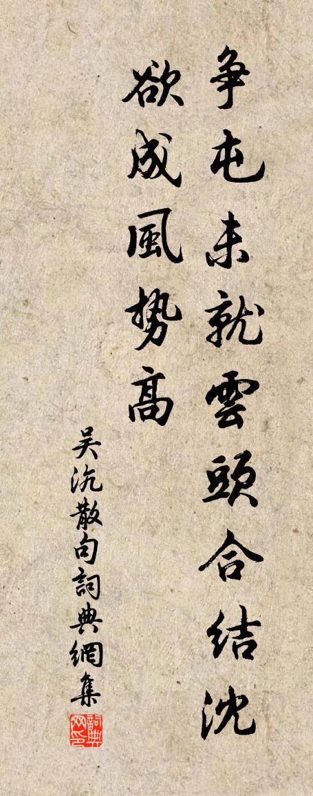 詩詞名句歷史字典書法欣賞書法字典國語詞典說文解字康熙字典古漢語字典標 題 作 者 詩 句 句作者:吳沆 朝代:宋代句原文爭屯未就雲頭合,結沈欲成風勢高。詩詞問答問:句的作者是誰?答:吳沆問:句寫於哪個朝代?答:宋代吳沆句書法欣賞句書法作品詩詞推薦念奴嬌(留范景山處有感)陳著〔宋代〕曉村深處,記當年、輕被東風吹別。重得相看春雨屋,心事從頭細說。深院燈寒,流蘇帳暖,曾夢梅花月。如今何偈頌一百二十三首釋崇岳〔宋代〕言無展事,語不投機。承言者喪,滯句者迷。和底掀翻了,趙州東院西。小園雙竹呈瑞二首岳珂〔宋代〕曲檻紅闌小圃西,平池影浸碧玻璃。便同雙劍看龍化,未許孤奩舞鳳棲。連袂縱觀金谷妓,聯篇頻付錦囊奚。使符財昏陳造〔宋代〕師昏古所辭,財昏今不恥。傳祀合二姓,古者貴由禮。四德五可外,貨賄亦末爾。民風日就頹,舍此爭校彼。媒氏黃山雜詠丹霞峰鄧宗度〔宋代〕綺段堆青壁,點綴秋顏色。幾使曉來風,縱橫裁不得。宿大明寺郭印〔宋代〕歷覽成終日,禪房處處深。野僧應怪見,俗客可幽尋。煙竹寒垂幄,風松靜鼓琴。清談不知寐,明月到天心。行至羅江代者爽期得史者書復還涪濱徑走富樂程公許〔宋代〕瞻雲日懷歸,及瓜法當代。喜同縚鷹掣,翻作風鷁退。誓言不可寒,幽賞夙所愛。但恐彼上人,雄辨費酬對。弋陽道中晁補之〔宋代〕千日千程不厭行,一丘一壑可鄰生。常憂束縛名韁死,聞健尋山卻稱情。游西山龍泉禪寺(一作院)伍喬〔唐代〕疊獻層峰坐可觀,枕門流水更潺湲。曉鐘聲徹洞溪遠,夏木影籠軒檻寒。幽徑乍尋衣屨潤,古堂頻宿夢魂安。因嗟憶秦娥賀鑄〔宋代〕著春衫。玉鞭鞭馬南城南。南城南。柔條芳草,留駐金銜。粉娥采葉供新蠶。蠶飢略許攜纖纖。攜纖纖。湔裙淇上水調歌頭(登衢州雙石堂呈孫八太守公素)毛滂〔宋代〕謝安涵雅量,叔夜賦剛腸。清宵假寐,應笑長孺臥淮陽。盡徹東平屏障,不廢南樓談詠,宴寢自凝香。庭下一杯土連日作雨苦熱陸游〔宋代〕天地一氣爾,陰陽司闔開,鬱蒸以為雨,回薄以為雷。久郁無所泄,造化安在哉?衣其欲雨時,雖天不能回。此豈重訪黃神谷策禪者鄭谷〔唐代〕初塵芸閣辭禪閣,卻訪支郎是老郎。我趣轉卑師趣靜,數峰秋雪一爐香。疏慵葛立方〔宋代〕閒處著疏慵,鮮鮮幽桂叢。讀書聊灶北,避世且牆東。市駿卑蘇代,求徵謝子公。丹心阻閶闔,欲付小心風。同徐呂二子游西湖複次前韻五首陳造〔宋代〕天分天上靈河水,圍作錢塘千頃湖。未有風亭花月觀,已夸勝境世間無。俯江樓虞儔〔宋代〕異鄉王粲懶登樓,腸斷淮山落木秋。塞上陰雲空漠漠,江邊艇子故悠悠。悲涼只怕聞孤雁,浩蕩那堪沒白鷗。莫怪初歸平泉,過龍門南嶺,遙望山居即事李德裕〔唐代〕初歸故鄉陌,極望且徐輪。近野樵蒸至,平泉煙火新。農夫饋雞黍,漁子薦霜鱗。惆悵懷楊仆,慚為關外人。岐陽客舍呈張明府耿湋〔唐代〕逸妻稚子應溝壑,歸路茫茫東去遙。涼葉下時心悄悄,空齋夢裡雨蕭蕭。星霜漸見侵華發,生長虛聞在聖朝。知己送妻兄任以道赴房州竹山尉四首項安世〔宋代〕少年有龍淵,不飾羞自售。凝塵滿蒯緱,見者不知有。提攜試拂試,光采射牛斗。世人輕玉璞,諒非和氏偶。長安書懷呈知己項斯〔唐代〕江湖歸不易,京邑計長貧。獨夜有知己,論心無故人。一燈愁里夢,九陌病中春。為問清平日,無門致出身。名句推薦一切福田,不離方寸;從心而覓,感無不通。袁黃《了凡四訓·立命之學》 多才之士,才儲八斗;博學之德,學富五車。程登吉《幼學瓊林·卷四·文事》 人者多欲,其性尚私。來俊臣《羅織經·閱人卷第一》 待到重陽日,還來就菊花。孟浩然《過故人莊》 驪山四顧,阿房一炬,當時奢侈今何處?張養浩《山坡羊·驪山懷古》 十日雨絲風片裡,濃春艷景似殘秋。王士禎《秦淮雜詩二十首·其一》 新竹高於舊竹枝,全憑老乾為扶持。鄭燮《新竹》 以小人之慮,度君子之心。劉義慶《世說新語·雅量》 大江流日夜,客心悲未央。謝朓《暫使下都夜發新林至京邑贈西府同僚》 稱尊長,勿呼名。對尊長,勿見能。李毓秀《弟子規·出則弟》