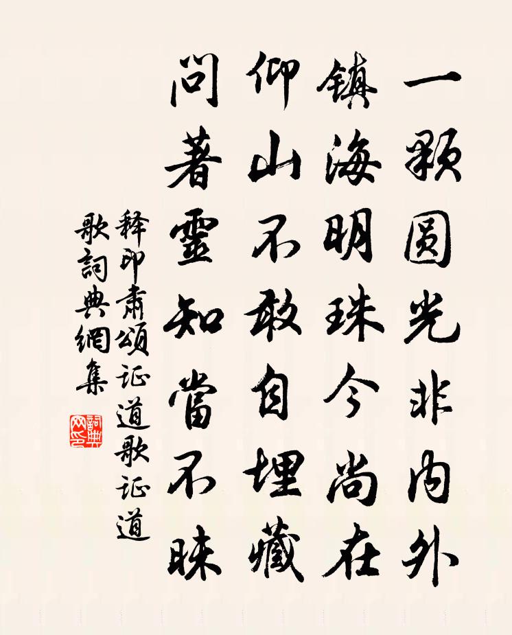 詩詞名句歷史字典書法欣賞書法字典國語詞典說文解字康熙字典古漢語字典標 題 作 者 詩 句 頌證道歌證道歌作者:釋印肅 朝代:宋代頌證道歌證道歌原文一顆圓光非內外,鎮海明珠今尚在。仰山不敢自埋藏,問著靈知當不昧。詩詞問答問:頌證道歌證道歌的作者是誰?答:釋印肅問:頌證道歌證道歌寫於哪個朝代?答:宋代釋印肅頌證道歌證道歌書法欣賞頌證道歌證道歌書法作品詩詞推薦感懷趙蕃〔宋代〕重來快閣又三月,簿領不親書得鑽。俸奪未妨衣屢典,年侵還是歲將闌。何當酒與伯仁對,更欲石從盧肇觀。誰能遣懷貢師泰〔元代〕日入柳風息,月上花露多。東軒頗幽敞,夜靜時一過。鳥散庭中樹,蟲鳴階下莎。北斗何低昂,疏星沒橫河。獨賞採蓮曲釋文珦〔宋代〕採蓮莫傷根,傷根不成藕。因思藕不成,悔作征人婦。喜雨示兒侄丘葵〔宋代〕維天降靈雨,豈不雨石田。我自磽且確,枯悴莫怨天。滿庭芳 邵公楊公為家緣拘擊告詞王哲〔元代〕論饑寒,公來問,中怎奈爺娘。牽兒絆,妻室惱愁腸。卦分明有說,田正、震地清涼。南看,前一點,何不*時詳謝潘端叔惠紅梅樓鑰〔宋代〕坡翁著意賦三詩,謾說穠香已透肌。若見此花應絕倒,惜君生晚不逢時。頌十玄談達本釋印肅〔宋代〕撒手到家人不識,明朝更不分南北。逢場作戲弄孔魂,反指牛兒是彌勒。水調歌頭 次復初韻曹伯啟〔元代〕山林隱君子,無意事王侯。天戈一日南指,多少賈胡留。不效熊舒龜息,卻羨蠅頭蝸角,我亦滯南州。十載厭奔走李舍人淮南提刑梅堯臣〔宋代〕啄木欲除蠹,蠹去樹亦撓。何須食微蟲,爾腹豈不飽。天下本無事,自為庸人擾。君實知古深,終慚用傾巧。題金山寺孫魴〔唐代〕萬古波心寺,金山名目新。天多剩得月,地少不生塵。過櫓妨僧定,驚濤濺佛身。誰言張處士,題後更無人。題孟處士宅張祜〔唐代〕高才何必貴,下位不妨賢。孟簡雖持節,襄陽屬浩然。並寧夏季文以酒王洋〔宋代〕溪漲蒲萄新撥醅,興添野水入金杯。華嚴居士貪幽定,一線春絲喚起床。挽樓暘叔二首劉克莊〔宋代〕白首臨凋瘵,虀鹽似舊時。僅持一麾止,安用五車為。庫有留州賦,家無葬地資。空餘清儉字,長使郡人思。三月十一日不出張九成〔宋代〕老罷慵人事,柴門盡日扃。春江入幽想,夜雨漲前汀。何日當晴霽,西山雲眇冥。江頭無限好,見說柳深青。對月用促句換韻格胡仔〔宋代〕青玻璃色瑩長空,爛銀盤掛屋山東,晚涼徐度一襟風。天分風月相管領,對之技癢誰能忍,吟喔自恨詩才窘。掃寬得奇石於峴山蔡肇〔宋代〕州城西南五裡間,如渡鞏洛趨秦川。土囊行盡跨山脊,雲濤萬頃江掀天。江南六月黃埃起,嶺上行人多蠍死。車聲醉蓬萊葉夢得〔宋代〕公表問東風何事,斷送殘紅,便拚歸去。牢落征途,笑行人羈旅。一曲陽關,斷雲殘靄,做渭城朝雨。欲寄離愁,白石山林斗南〔宋代〕路迥靈芝縈紆行木靈芝杪,腳力靈芝窮時山更靈芝好。苦吟轉覺嘉句慳,遠望方知眾山小。登臨自昔知幾人,留題踏莎行陳德武〔宋代〕聲跡隨風,浪痕如霰。藍橋路遠無由見。黃昏腸斷倚闌時,看看數盡南飛雁。日理絲機,宵拈針線。春秋不管鶯和憨憨泉釋智愚〔宋代〕憨泉一掬清無底,暗與曹源正脤通。陸羽若教知此味,定應天下水無功。名句推薦妖嬈艷態,妒風笑月,長殢東君。李清照《慶清朝·禁幄低張》 有客躊躇,古庭空自吊孤影。史達祖《齊天樂·中秋宿真定驛》 儒者在本朝則美政,在下位則美俗。荀子《荀子·儒效》 衰蘭送客鹹陽道,天若有情天亦老。李賀《金銅仙人辭漢歌》 成事莫說,覆水難收。佚名《增廣賢文·上集》 目斷秋霄落雁,醉來時響空弦。辛棄疾《木蘭花慢·滁州送范倅》 君子以儉德辟難,不可榮以祿。佚名《易傳·象傳上·否》 分明久旱逢甘雨,賽過他鄉遇故知。馮夢龍《醒世恆言·卷二十》 錦帶吳鉤,征思橫雁水。吳文英《荔枝香近·送人游南徐》 不知天外雁,何事樂長征?徐禎卿《在武昌作》
