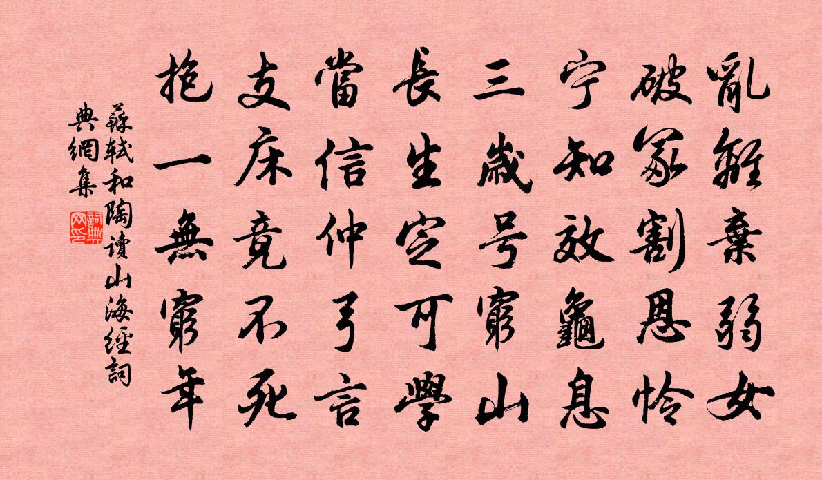詩詞名句歷史字典書法欣賞書法字典國語詞典說文解字康熙字典古漢語字典標 題 作 者 詩 句 和陶讀《山海經》作者:蘇軾 朝代:宋代和陶讀《山海經》原文亂離棄弱女,破冢割恩憐。寧知效龜息,三歲號窮山。長生定可學,當信仲弓言。支床竟不死,抱一無窮年。詩詞問答問:和陶讀《山海經》的作者是誰?答:蘇軾問:和陶讀《山海經》寫於哪個朝代?答:宋代問:蘇軾的名句有哪些?答:蘇軾名句大全蘇軾和陶讀《山海經》書法欣賞和陶讀《山海經》書法作品詩詞推薦句劉望之〔宋代〕剩破朱紅供短髮,南荒來校世間書。舞鶴四絕岳珂〔宋代〕九皋仙子老芝田,小立清池阿那邊。忽作霓裳羽衣舞,天機未信只魚鳶。鷓鴣天李朝卿〔宋代〕九鳳簫低彩霧高。鸞車鶴馭下層霄。天教來輔長生帝,寶殿千秋侍赭袍。飛急召,促歸朝。沙路穩為馬蹄嬌。功成過楊德逢莊王安石〔宋代〕攜僧出西路,日晏昧所投。循河望積穀,一飽覺易謀。稚子舉桉出,咄嗟見盤羞。飯新秔有香,煮菜旨且柔。暮從贈琴棋僧歌張瀛〔唐代〕我嘗聽師法一說,波上蓮花水中月。不垢不淨是色空,無法無空亦無滅。我嘗聽師禪一觀,浪溢鰲頭蟾魄滿。河沙減字木蘭花吳則禮〔宋代〕河西春晚。獨有柳條來入眼。塞外斜斜。不道欺寒紅杏花。邊笳初發。與喚團團沙塞月。雁響連天。誰倚城頭百尺葡萄唐彥謙〔唐代〕金谷風露涼,綠珠醉初醒。珠帳夜不收,月明墮清影。送別任龍圖史才〔宋代〕江上飛檣高數尋,西風客路思難禁。三千奏議曾經國,十萬兵屯已屬心。官驛疏梅春意足,楚天孤鶩曉煙沉。閩南贈儒醫陳西岩謝枋得〔宋代〕豬苓桔梗最為奇,藥籠書囊用有詩。莫把眼前窮達論,要知良相即良醫。荷鋤陸游〔宋代〕五畝畦蔬地,秋來日荷鋤。何曾笑爾輩,但覺愛吾廬。膽怯沽官釀,瞳昏讀監書。區區尚多事,未解雜樵漁。偈頌五首釋印肅〔宋代〕議得無心達有心,識心三界自平沉。可憐迷望無心者,只道無心境不侵。寄建康老友趙庚夫〔宋代〕朋舊多隨秋葉風,與君心賞向來同。十年相憶頭先白,萬里重分途更窮。蓴菜雖堪夸洛下,酒樽終是憶江東。自從嘆發落白居易〔唐代〕多病多愁心自知,行年未老發先衰。隨梳落去何須惜,不落終須變作絲。所居遇雪衛宗武〔宋代〕去年雪於臘,見晛跡已滅。今年天作花,再白遂凝結。鱗鱗甍相接,爛爛銀互疊。平尺雖未盈,皓若布層氎。洪纖奉教追赴九成宮途中口號李嶠〔唐代〕委質承仙翰,祗命遄遙策。事偶從梁游,人非背淮客。長驅歷川阜,迥眺窮原澤。鬱郁桑柘繁,油油禾黍積。雨餘四和二首劉克莊〔宋代〕朱門畫鼓舞宮靴,應笑狂歌似采和。露坐一生無步障,春遊是處有行窩。紹興讜議誰當續,元祐全人本不多。辦取初望廬山晁補之〔宋代〕休說江南青未了,一庵一徑可容身。宦程正迫西風急,未是盧山佇足人。偈公六十五首釋鹹傑〔宋代〕虛驟龍驤與麽來,驀然平地起風雷。棒頭正眼明如日,凜凜清風廓九垓。漢宮春(答吳子似總斡和章)辛棄疾〔宋代〕達則青雲,便玉堂金馬,窮則茅廬。逍遙小大自適,鵬鷃何殊。君如星斗,燦中天、密密疏疏。荒草外,自憐螢火白居易有望闕雲遮眼思鄉雨滴心之句用其韻為鄭剛中〔宋代〕南方秋不悲,奈我居異鄉。不見楓葉丹,但憐菊花黃。掃跡燕如客,斜書雁成行。夢中清愁闊,雲此是瀟湘,瀟湘名句推薦頌其詩,讀其書,不知其人,可乎?是以論其世也。孟子《孟子·萬章章句下·第八節》 唱罷秋墳愁未歇,春叢認取雙棲蝶。納蘭性德《蝶戀花·辛苦最憐天上月》 年年陌上生秋草,日日樓中到夕陽。晏幾道《鷓鴣天·醉拍春衫惜舊香》 兩個黃鸝鳴翠柳,一行白鷺上青天。杜甫《絕句》 練於骨者,析辭必精;深乎風者,述情必顯。劉勰《文心雕龍·風骨》 數枝門柳低衣桁,一片山花落筆床。岑參《山房春事二首》 悵然孤嘯,青山故國,喬木蒼苔。倪瓚《人月圓·傷心莫問前朝事》 等閒老去年華促。只有江梅伴幽獨。孫道絢《滴滴金·梅》 鴛鴦俱是白頭時,江南渭北三千里。賀鑄《惜余春·急雨收春》 念寒蛩殘夢,歸鴻心事,那聽江村夜笛。吳文英《瑞鶴仙·秋感》