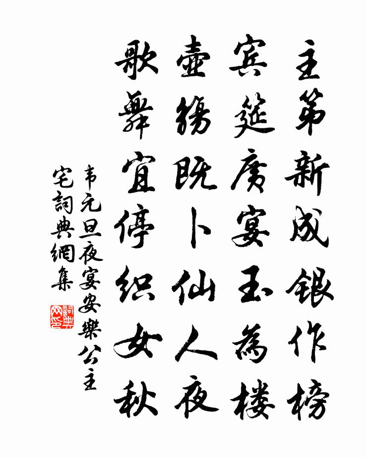 詩詞名句歷史字典書法欣賞書法字典國語詞典說文解字康熙字典古漢語字典標 題 作 者 詩 句 夜宴安樂公主宅作者:韋元旦 朝代:唐代夜宴安樂公主宅原文主第新成銀作榜,賓筵廣宴玉為樓。壺觴既卜仙人夜,歌舞宜停織女秋。詩詞問答問:夜宴安樂公主宅的作者是誰?答:韋元旦問:夜宴安樂公主宅寫於哪個朝代?答:唐代問:夜宴安樂公主宅是什麼體裁?答:七絕韋元旦夜宴安樂公主宅書法欣賞夜宴安樂公主宅書法作品注釋全唐詩:卷69_23詩詞推薦鹽城阻冰雪贈陳德美三首陳造〔宋代〕身口真相累,風霜得備嘗。即今歌匪兕,未憗反屠羊。辟謗規閒口,因衰再覆觴。不知詩酒外,何計逭悲涼。夜賦陸游〔宋代〕八十衰翁久掛冠,今年無酒敵春寒。亂雲入戶雨方急,斷雁叫群燈未殘。蠹簡倖存隨意讀,蝸廬雖小著身寬。支離酬崔博士楊巨源〔唐代〕自知頑叟更何能,唯學雕蟲謬見稱。長被有情邀唱和,近來無力更祗承。青松樹杪三千鶴,白玉壺中一片冰。今日白艾原客方乾〔唐代〕原上桑柘瘦,再來還見貧。滄州幾年隱,白髮一莖新。敗葉平空塹,殘陽滿近鄰。閒言說知己,半是學禪人。憶少年趙彥端〔宋代〕逢春如酒,逢花如露,逢人如玉。東風送寒去,蔚溫溫香縠。海上三山元似粟。試招來、共藏金屋。與君醉千歲,奉試麥壟多秀色汪極〔唐代〕南陌生岐穗,農家樂事多。塍畦交茂綠,苗實際清和。日布玲瓏影,風翻浩蕩波。來牟知帝力,含哺有衢歌。旋風吟二首邵雍〔宋代〕安有太平人不平,人心平處固無爭。棋中機械不願看,琴里語言時喜聽。少日掛心唯帝典,老年留意只義經。自知漁家傲(和餘子美對雪)王之道〔宋代〕風揭珠簾寒乍透。青娥不住添香獸。火暖畫檐鳴線溜。人醉後。錦堂絲竹烘殘晝。勢合湖山增地厚。孤高但覺修篁高帝於石〔宋代〕呂氏強梁劉氏危,宮中枕臥復誰知。釀成外戚中官禍,興漢已開亡漢基。止齋曲廊初成陳傅良〔宋代〕但酒勝如水,但花勝如草。小廊曲通幽,竹椽亦良好。止齋十數間,足以便衰老。檐低遠風露,地窄易汛掃。淺溪蕙蘭芳引(林鐘商,俗名歇指調賦藏一家吳郡王畫蘭)吳文英〔宋代〕空翠染雲,楚山迥故人南北。秀骨冷盈盈,清洗九秋澗綠。奉車舊畹,料未許、千金輕儥。淺笑還不語,蔓草羅裙題蓋竹廟六絕陳淳〔宋代〕至人神定氣常清,夜息虛明一若醒。假使妖祠能獻兆,如何窺得此門庭。次韻錢穆父王仲至同賞田曹梅花蘇軾〔宋代〕寒廳不知春,獨立耿玉雪。閉門愁永夜,置酒及明發。忽驚庭戶曉,未受煙雨沒。浮光風宛轉,照影水方折。鬢霜辛亥各口占十絕劉克莊〔宋代〕葦間一葉且延緣,奎壁祥光上燭天。定有異人遙望氣,個船不是米家船。記夢胡寅〔宋代〕夜夢虛齋整衣冠,客五六輩相揖還。中有一人少留連,叩檐叩齒禱甚虔。雇謂吾儕歇傾耳,紅藥叢深鳥聲美。翻枝訴衷情晏幾道〔宋代〕淨揩妝臉淺勻眉。衫子素梅兒。苦無心緒梳洗,閒淡也相宜。雲態度,柳腰肢。入相思。夜來月底,今日尊前,未生查子劉侍讀〔唐代〕深秋更漏長,滴盡銀台燭。獨步出幽閨,月晃波澄綠。菱荷風乍觸,一對鴛鴦宿。虛棹玉釵驚,驚起還相續。題陳岩庵寄諸兄弟呂聲之〔宋代〕地接丹丘姥嶺賒,山盤曲折狀如蛇。每因過此瞻雙隴,何必從旁置萬家。孝弟本根時潤澤,詩書種子日萌芽。到來示蔡天啟三首王安石〔宋代〕蔡子勇成癖,能騎生馬駒。銛鋒瑩鷿鵜,價重百硨磲。脫身事幽討,禪愈只晏如。劃然變軒昂,慎勿學哥舒。南鄉子(二之一)王安石〔宋代〕嗟見世間人。但有纖毫即是塵。不住舊時無相貌,沈淪。祗為從來認識神。作麽有疏親。我自降魔 * 。不是攝名句推薦野雲萬里無城郭,雨雪紛紛連大漠。李頎《古從軍行》 摘青梅薦酒,甚殘寒,猶怯薴蘿衣。湯恢《八聲甘州·摘青梅薦酒》 惜衣有衣,惜食有食。馮夢龍《警世通言·卷三》 楓林凋翠,寒雁聲悲。趙長卿《柳梢青·過何郎石見早梅》 先世之吏正,故其民篤;今世之吏邪,故其民薄。政弊而不行,令倦而不聽。班固《漢書·傳·公孫弘卜式兒寬傳》 激氣已能驅粉黛,舉杯便可吞吳越。史達祖《滿江紅·中秋夜潮》 匹馬南來渡浙河,汴城宮闕遠嵯峨。于謙《岳忠武王祠》 坐看黑雲銜猛雨,噴灑前山此獨晴。崔道融《溪上遇雨二首》 東園載酒西園醉,摘盡枇杷一樹金。戴復古《初夏遊張園》 絡緯秋啼金井闌,微霜淒淒簟色寒。李白《長相思·其一》