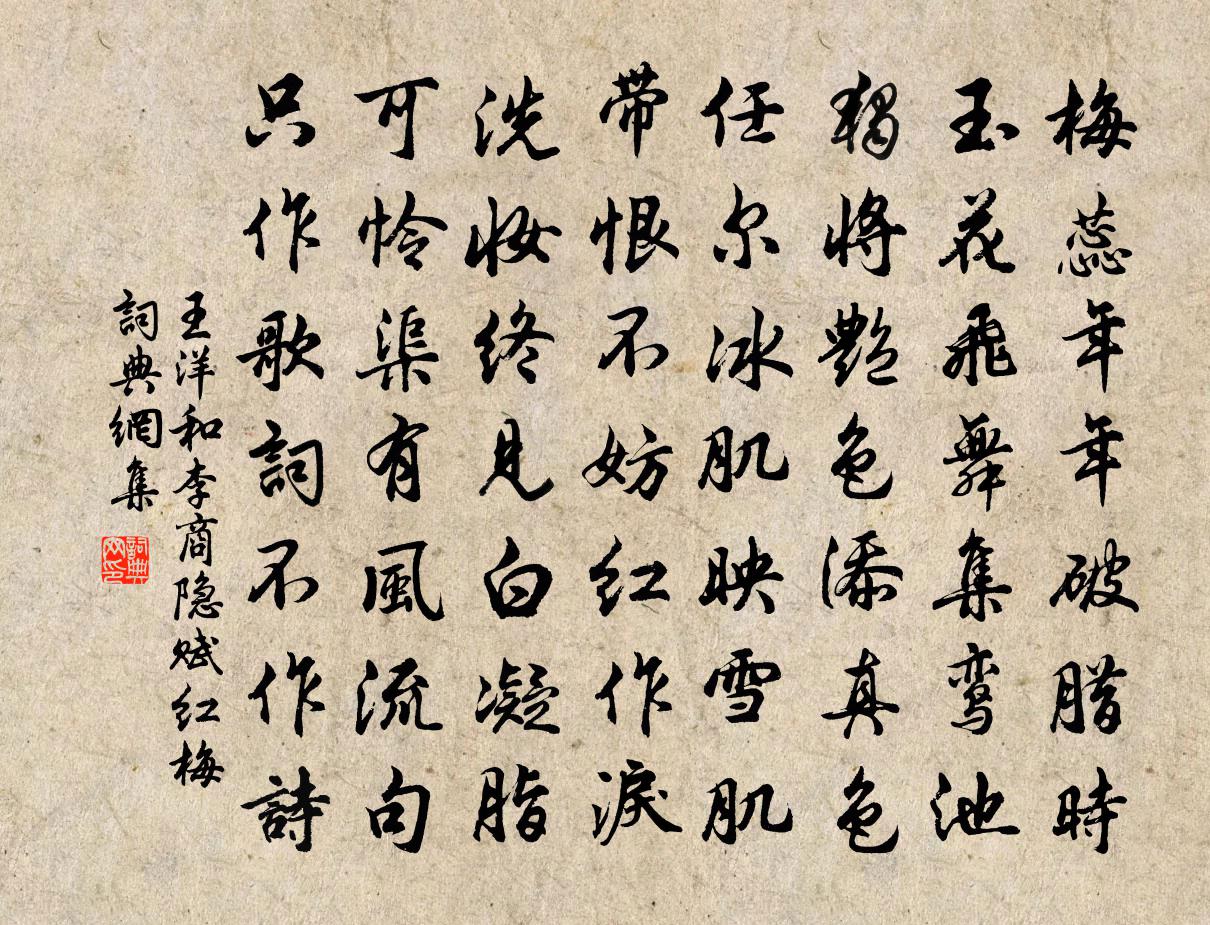 詩詞名句歷史字典書法欣賞書法字典國語詞典說文解字康熙字典古漢語字典標 題 作 者 詩 句 和李商隱賦紅梅作者:王洋 朝代:宋代和李商隱賦紅梅原文梅蕊年年破臘時,玉花飛舞集鸞池。獨將艷色添真色,任爾冰肌映雪肌。帶恨不妨紅作淚,洗妝終見白凝脂。可憐渠有風流句,只作歌詞不作詩。詩詞問答問:和李商隱賦紅梅的作者是誰?答:王洋問:和李商隱賦紅梅寫於哪個朝代?答:宋代王洋和李商隱賦紅梅書法欣賞和李商隱賦紅梅書法作品詩詞推薦省試恩賜耆老布帛(一作崔宗詩)李絳〔唐代〕渙汗中天發,殊私海外存。衰顏逢新地,華發受皇恩。燭物明堯日,垂衣辟禹門。惜時悲落景,賜帛慰余魂。厚澤頌古二十一首釋鼎需〔宋代〕京師出大黃,不許謾商量。貴買還賤賣,才喫便承當。內丘梨園范成大〔宋代〕汗後鵝梨爽似冰,花身耐久老猶榮。園翁指似還三笑,曾共翁身見太平。偈頌六十八首釋法薰〔宋代〕秋聲滿林壑,秋雨滴梧桐。門外未歸客,飄泊在途中。歸也,歸也,通身白汁,下載清風。題李子立知縣問月台楊萬里〔宋代〕高台走上青天半,手弄銀盤濯銀漢。喚起謪仙同醉吟,一面問月一面斟。初頭混沌鶻侖樣,阿誰鑿開一為兩。是時六月十七日大暑殆不可過然去伏盡秋初皆不過陸游〔宋代〕赫日炎威豈易摧,火雲壓屋正崔嵬。嗜眠但喜蘄州簟,畏酒不禁河朔杯。人望息肩亭午過,天方悔禍素秋來。細思四不忍劉子翬〔宋代〕平沙月轉旌旗影,擐甲為衾戈作枕。此時飲恨念鑾輿,玉體能勝暴露無。問安使者空相繼,清蹕不回宮殿閉。請纓浣溪沙吳儆〔宋代〕風入枯藜衣袂涼。江楓園柳半青黃。洗車飛雨帶天香。世事一場真大夢,宦情都薄似秋光。竹洲有酒可徜徉。古蟾宮·元宵王磐〔明代〕聽元宵,往歲喧譁,歌也千家,舞也千家。聽元宵,今歲嗟呀,愁也千家,怨也千家。那裡有鬧紅塵香車寶馬?祗憶舊遊(落梅賦)周密〔宋代〕念芳鈿委路,粉浪翻空,誰補春痕。佇立傷心事,記宮檐點鬢,候館沾襟。東君護香情薄,不管徑雲深。嘆金谷樓遣興五首杜甫〔唐代〕朔風飄胡雁,慘澹帶砂礫。長林何蕭蕭,秋草萋更碧。北里富熏天,高樓夜吹笛。焉知南鄰客,九月猶絺綌。長陵滿江紅(劉知郡生朝)朱熹〔宋代〕秀野詩翁,念故山、十年乖隔。聊命駕、朱門舊隱,綠槐新陌。好雨初晴仍半暖,金釭玉斝開瑤席。更流傳、麗藻早梅謝燮〔南北朝〕迎春故早發,獨自不疑寒。畏落眾花後,無人別意看。比從人覓酒皆酸薄戲作此詩陸游〔宋代〕酒盡聊憑摺簡求,不知人要博涼州。牆隅棄置空三嘆,露下螢飛奈此秋。題石橋韋應物〔唐代〕遠學臨海嶠,橫此莓苔石。郡齋三四峰,如有靈仙跡。方愁暮雲滑,始照寒池碧。自與幽人期,逍遙竟朝夕。觀文殿學士陳公輓詞樓鑰〔宋代〕幾見衣冠偉,終聞羽翼成。先皇崇舊學,大政任名卿。神器親傳授,崇朝再太平。功成身自退,寵利不豪輕。和郭主簿 其二陶淵明〔魏晉〕和澤周三春,清涼素秋節。露凝無游氛,天高肅景澈。陵岑聳逸峰,遙瞻皆奇絕。芳菊開林耀,青松冠岩列。懷此雜詩四首王之望〔宋代〕江發岷山陽,河出崑崙趾。淵源既洪深,浩浩並眾水。東流至渤澥,曲折萬餘里。經山無重數,過郡不知幾。海邊南康食芡梨陳宓〔宋代〕吳頭楚尾將三載,芡觜梨腮又一秋。豈為鱸魚覓歸去,在家飲水百無憂。哭陳興宗先生三首鄧肅〔宋代〕虀鹽昔者謾儒宮,葦白茅黃處處同。十載從公煩點鐵,寸毫令我稍披聾。一泓漸笑牛蹄水,萬里初觀羊角風。欲反名句推薦春草細還生,春雛養漸成。揭傒斯《畫鴨》 讀書不覺已春深,一寸光陰一寸金。王貞白《白鹿洞二首·其一》 眼痛滅燈猶暗坐, 逆風吹浪打船聲。白居易《舟中讀元九詩》 白日不到處,青春恰自來。袁枚《苔》 若似月輪終皎潔,不辭冰雪為卿熱。納蘭性德《蝶戀花·辛苦最憐天上月》 中秋佳月最端圓。老痴頑。見多番。陳著《江城子·中秋早雨晚晴》 志於道,據於德,依於仁,游於藝。孔子弟子《論語·述而篇》 捲地風來忽吹散,望湖樓下水如天。蘇軾《六月二十七日望湖樓醉書》 適與野情愜,千山高復低梅堯臣《魯山山行》 人生有酒須當醉,一滴何曾到九泉。高翥《清明日對酒》
