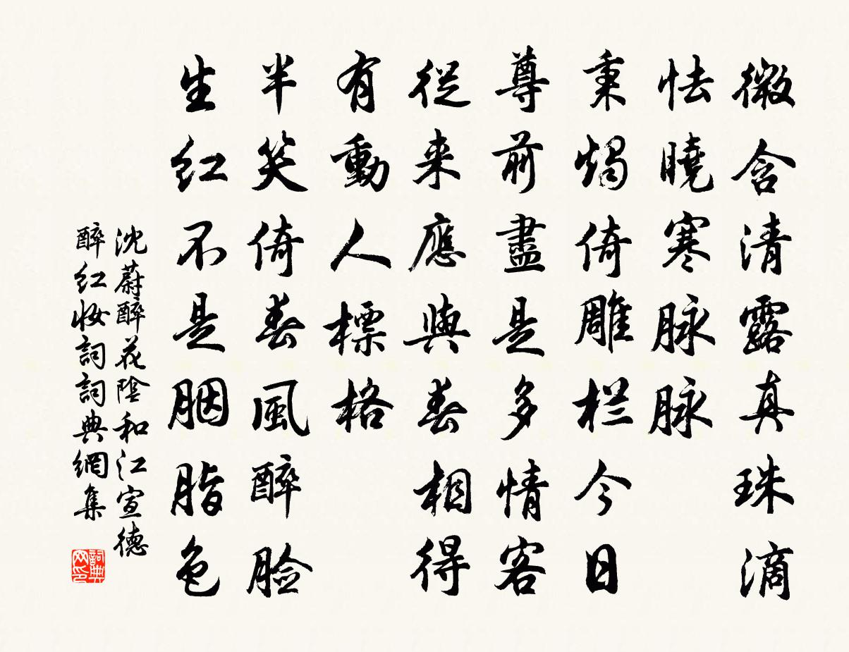 詩詞名句歷史字典書法欣賞書法字典國語詞典說文解字康熙字典古漢語字典標 題 作 者 詩 句 醉花陰(和江宣德醉紅妝詞)作者:沈蔚 朝代:宋代原文微含清露真珠滴。怯曉寒脈脈。秉燭倚雕欄,今日尊前,儘是多情客。從來應與春相得。有動人標格。半笑倚春風,醉臉生紅,不是胭脂色。詩詞問答問:《醉花陰(和江宣德醉紅妝詞)》的作者是誰?答:沈蔚問:該詩寫於哪個朝代?答:宋代問:該詩是什麼體裁?答:詞書法欣賞醉花陰(和江宣德醉紅妝詞)書法作品詩詞推薦真珠簾(代壽秋壑母)陳著〔宋代〕魚軒富貴人間少。那堪更、有子雍容廊廟。袞繡當斑衣,轉色難心小。手把乾坤重整頓,略□□、微生一笑。分曉夫人閣四首韓維〔宋代〕臘雪余香徑,朝揮上綺甍。翠生蘭蕙色。和人管弦聲。分賦楊花施樞〔宋代〕纖腰睡起芳情足,誰道春風浪拘束。日暮天涯細草多,輕飛誤入闌乾曲。曹氏寒碧即事葛紹體〔宋代〕屋頭楊柳綠參差,小竹疎花此更宜。簾漾水紋閒晝日,早秋風物似春時。賦得春鶯送友人(又作賀朝詩)劉孝孫〔唐代〕流鶯拂繡羽,二月上林期。待雪消金禁,銜花向玉墀。翅掩飛燕舞,啼惱婕妤悲。料取金閨意,因君問所思。旅悶十首方回〔宋代〕運啟奎占瑞,途殫彗告危。晚生違盛際,後死值衰期。何啻三歸備,寧虞九鼎移。焉知專夜妾,竟孕別人兒。三教贊釋師觀〔宋代〕一即三,三即一,者一個,贊不及。天人群生類,皆承此恩力。初至金陵蘇轍〔宋代〕山川過雨曉光浮,初看江南第一州。路繞匡廬更南去,懸知是處可忘憂。寄棗人行書贈子履學士歐陽修〔宋代〕秋來紅棗壓枝繁,堆向君家白玉盤。甘辛楚國赤萍實,磊落韓嫣黃金丸。聊效詩人投木李,敢期佳句報琅玕。嗟予浣溪沙曾棟〔宋代〕落日蒸紅山欲燒。短筇行藥過山腰。松聲隱隱晚來潮。矮樹依嚴無敗葉,梅花當路少全梢。水村時有短長橋。和皓文二絕林逋〔宋代〕芳草誰能夢謝池,但將心地喻摩尼。千岩萬壑時相憶,明月清風兩自知。排門夫方岳〔宋代〕一家一夫排門起,五家一甲單出里。夫須襏襫潦霧愁,與官輸木供邊壘。沙場草青胡運衰,軍書抵急飛塵埃。官須游石仙分韻得觀字吳汝弌〔宋代〕閒攏兩袖秋,步入沖寂觀。古樹老雲中,仙成毀岩半。是時零雨高,葉脫淒風亂。怪禽走何忙。澀不流不漫。那知水龍吟(追和晁次膺)佚名〔宋代〕經年不見書來,後期杳杳從誰問。柳英蠟小,柳枝金嫩,艷陽春近。羅幕風柔,泛紅 * ,連朝花信。念平生多少青龍江上偶書兩絕呈無逸監鎮朱長文〔唐代〕潮滿溝塍稻滿田,暑天不雨自豐年。海商有貨官無擾,遊子爭來就一廛。念奴嬌(次洋州王郎中韻)京鏜〔宋代〕文章太守,問何事、猶帶天庭黃色。上界一時官府足,聊下神仙宮闕。剖竹新游,握蘭舊夢,此意誰人識。千軍筆自嘲陸游〔宋代〕壯歲耽書廢夜眠,窗明猶在短檠前。如今自笑摧頹甚,臥看兒曹理斷編。宮詞三十三首曹勛〔宋代〕聖德隆昌紀紹興,稍馴逆虜會清明。須知不待黃河報,自有天威靖太平。贈施都正三首陳造〔宋代〕嚴嚴神仙居,不受世塵涴。棲身白玉壺,眼淨詎容唾。主人敬愛客,馬秣仆不餓。洗心爐薰前,容了舊經課。願成四勝深心偈晃逈〔宋代〕豁然悟空,瞭然見性。凝然不動,寂然無思。名句推薦還卿一缽無情淚,恨不相逢未剃時。蘇曼殊《本事詩十首·選二》 四海十年兵不解,胡塵直到江城。陳克《臨江仙·四海十年兵不解》 新竹高於舊竹枝,全憑老乾為扶持。鄭燮《新竹》 五更鐘動笙歌散,十里月明燈火稀。賀鑄《思越人·紫府東風放夜時》 潭潭大度如臥虎,邊頭耕桑長兒女黃庭堅《送范德孺知慶州》 君為女蘿草,妾作菟絲花。李白《古意》 兩岸猿聲啼不住,輕舟已過萬重山李白《早發白帝城/白帝下江陵》 登高壯觀天地間,大江茫茫去不還。李白《廬山謠寄盧侍御虛舟》 相逢不用忙歸去,明日黃花蝶也愁。蘇軾《九日次韻王鞏》 理貴有中,不必過厚李大師、李延壽《南史·列傳·卷十八》